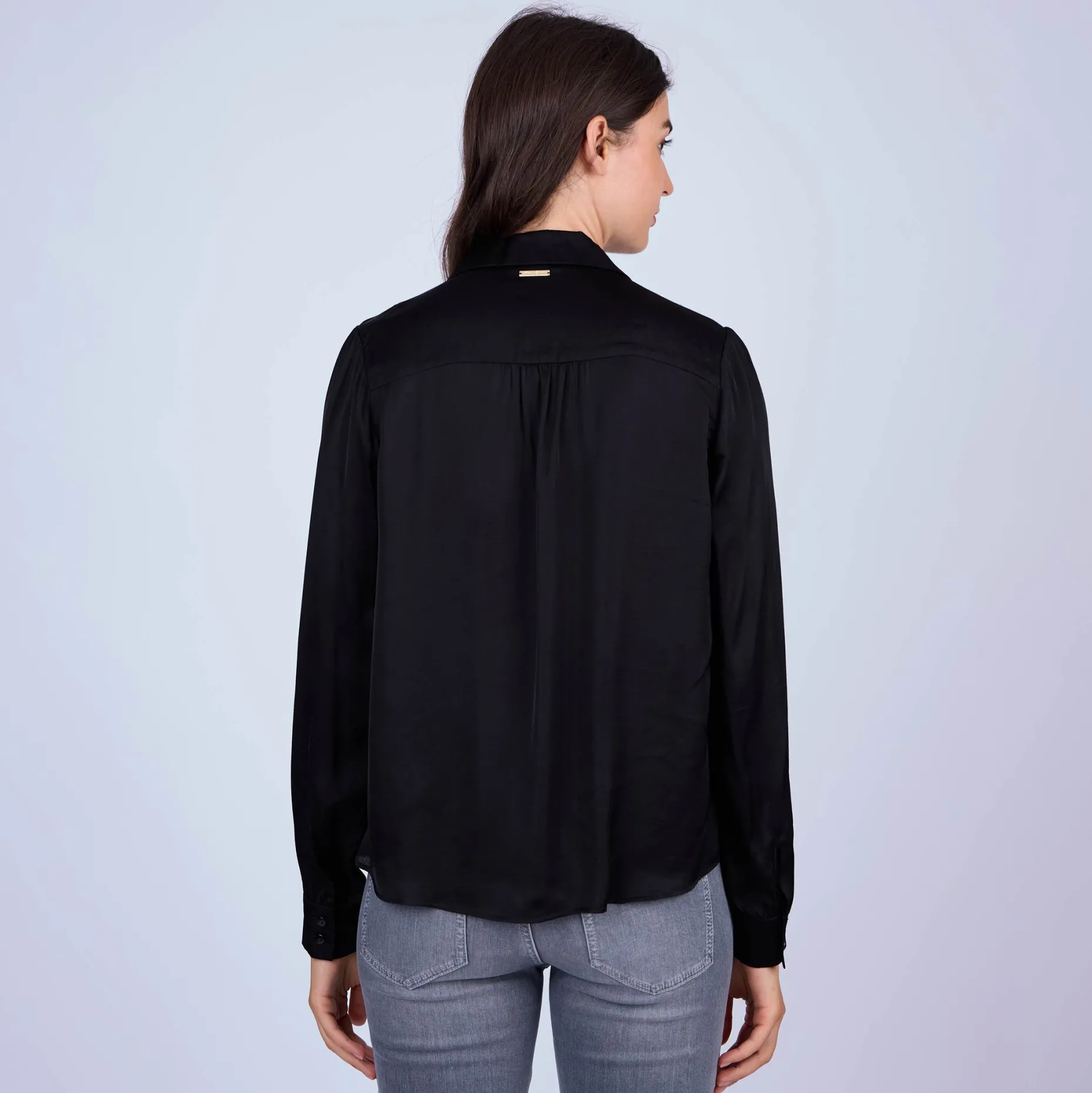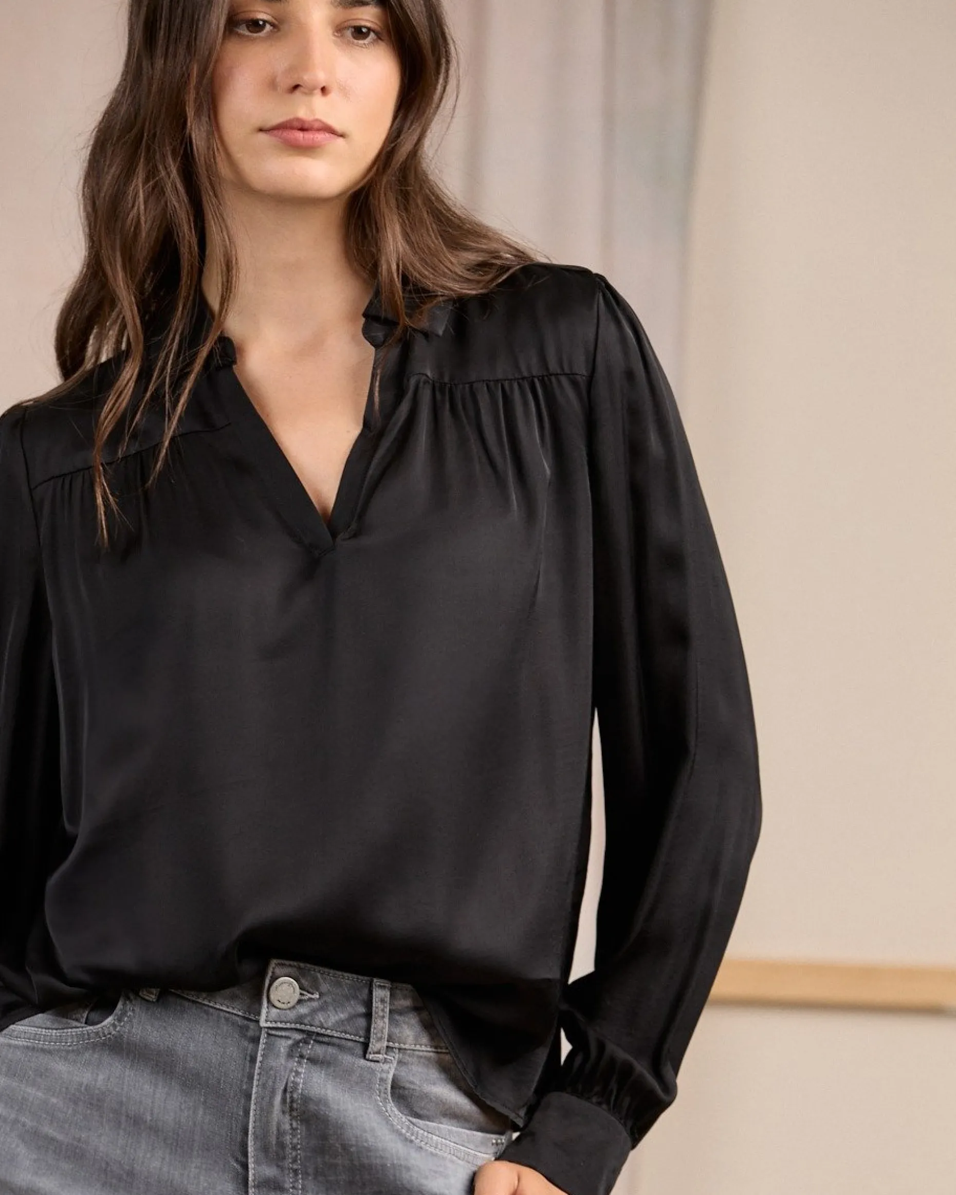 On craque pour cette blouse noire à manches longues ! Sobre et chic à la fois, elle se démarque par son col V et ses détails de plis. Elle est confectionnée en viscose, ce qui lui procure une grande douceur et un très bel effet lumineux. Pour une allure soignée, portez-la avec un jean de votre collection ! Une petite plaquette dorée Mise au Green est cousue à l’arrière.