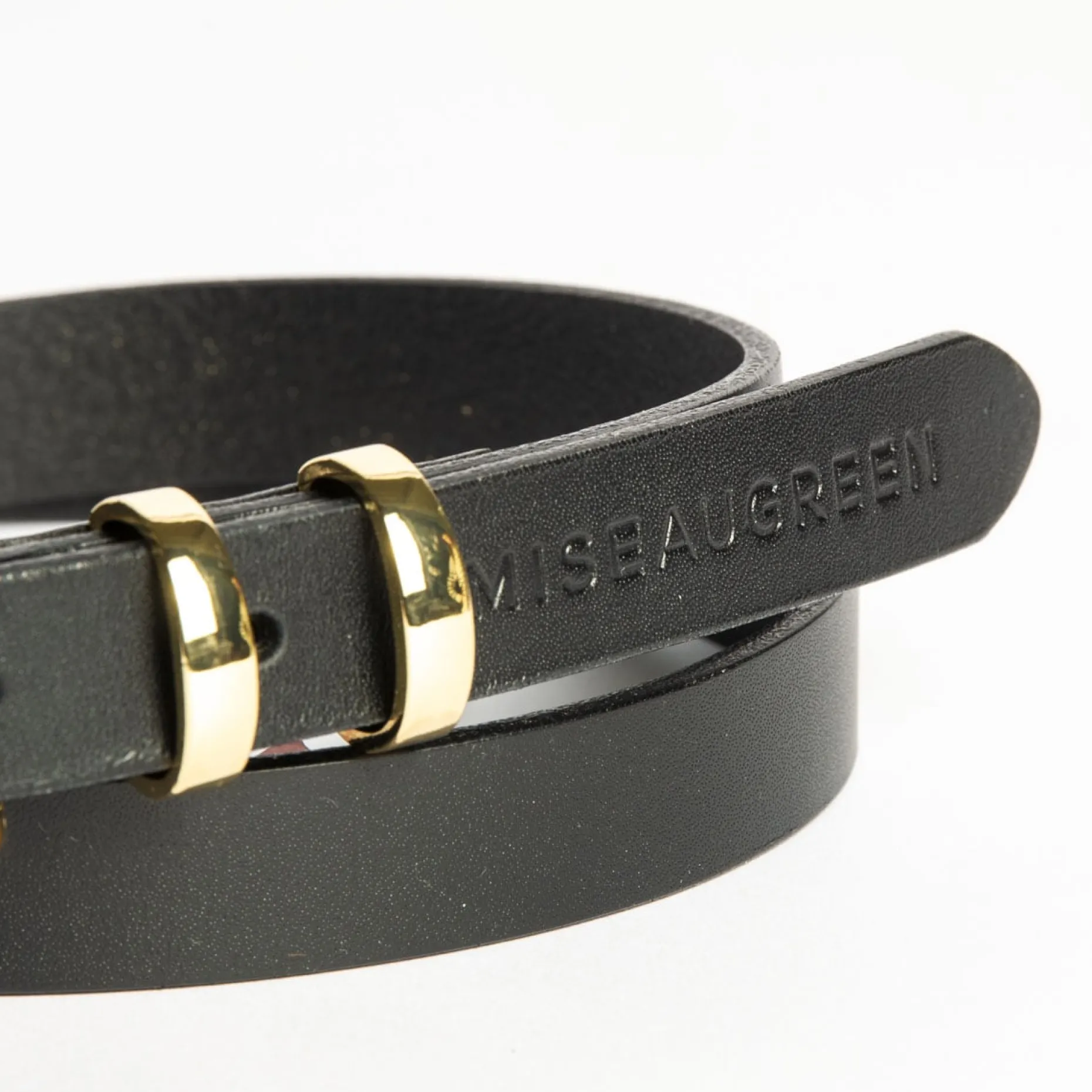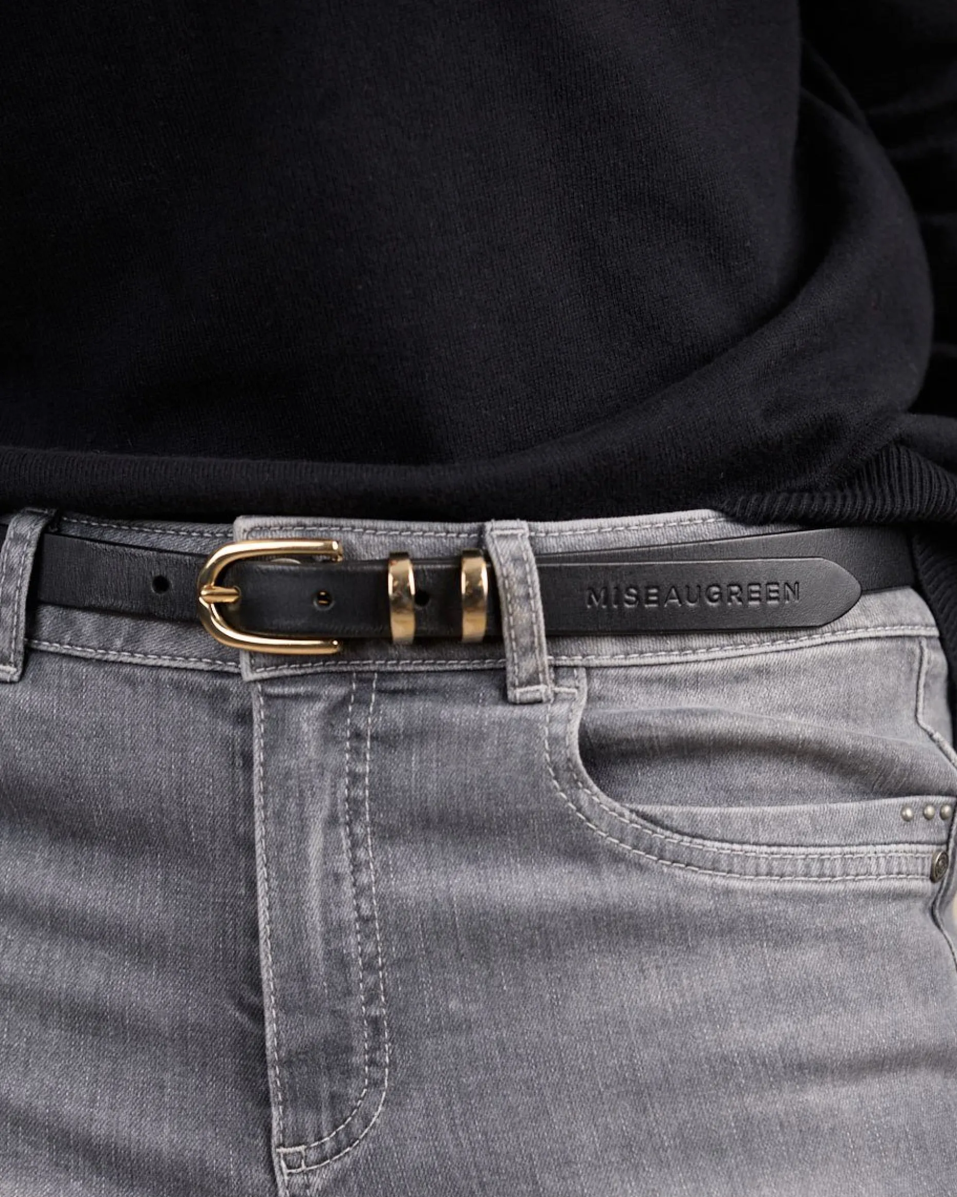 Chic et intemporelle, cette ceinture fine noire est l’accessoire incontournable de votre garde-robe ! Véritable bijou, elle est sublimée par une boucle dorée et une inscription Mise au Green. Confectionné en cuir, ce modèle polyvalent se porte aussi bien avec un jean qu’une robe pour souligner votre taille. Misez sur son design élégant et épuré pour compléter toutes vos tenues.