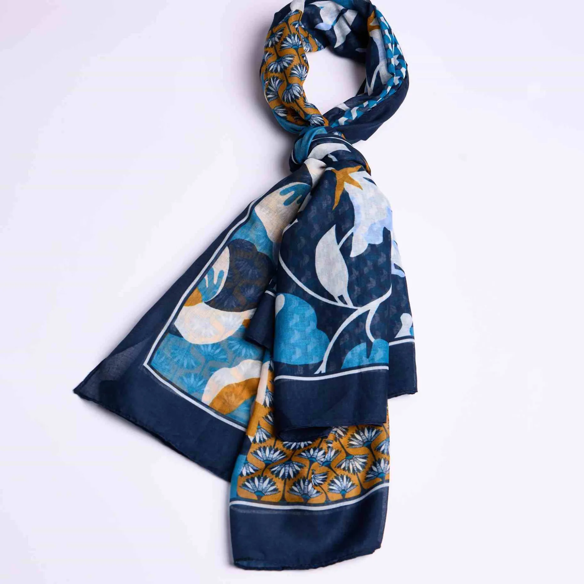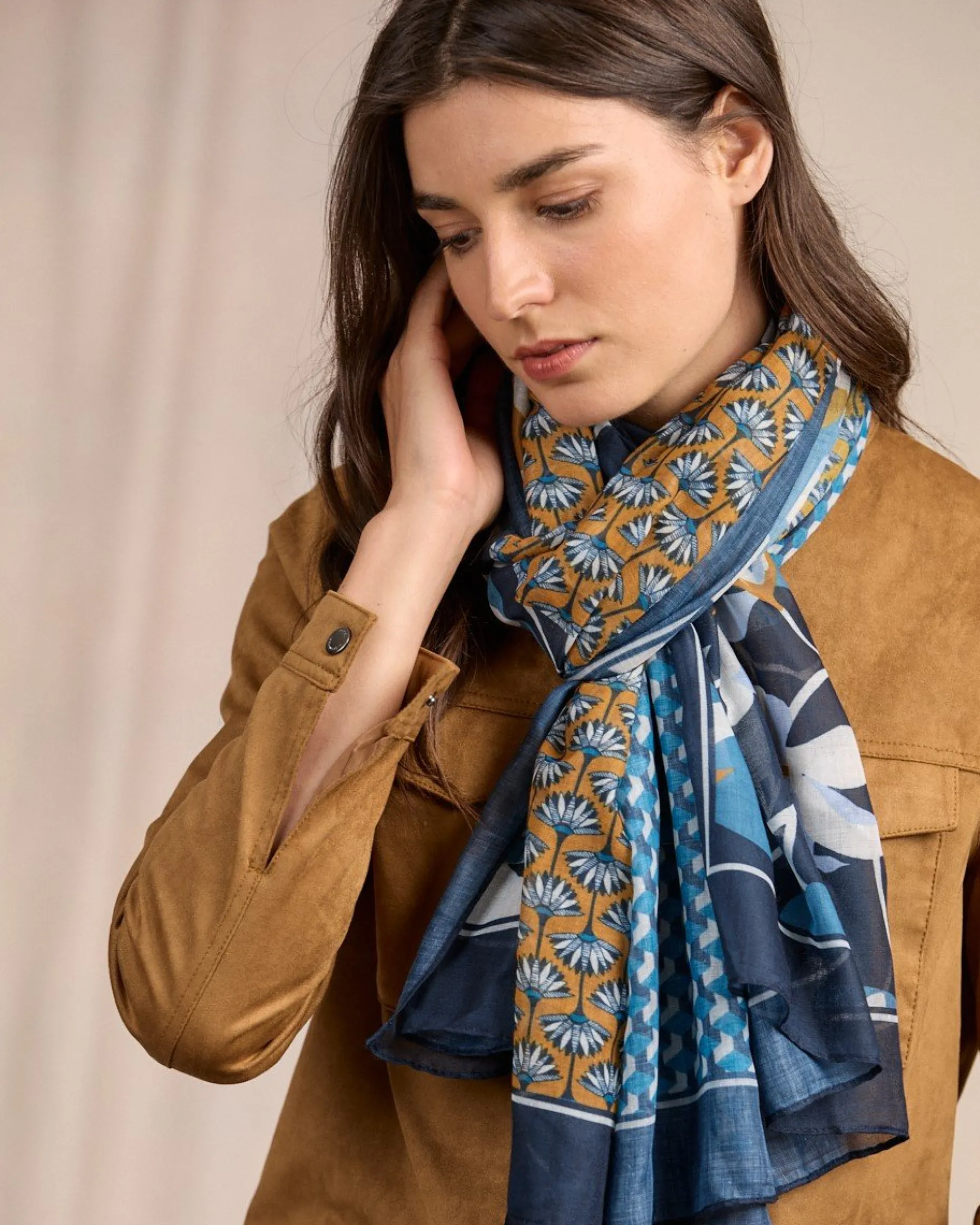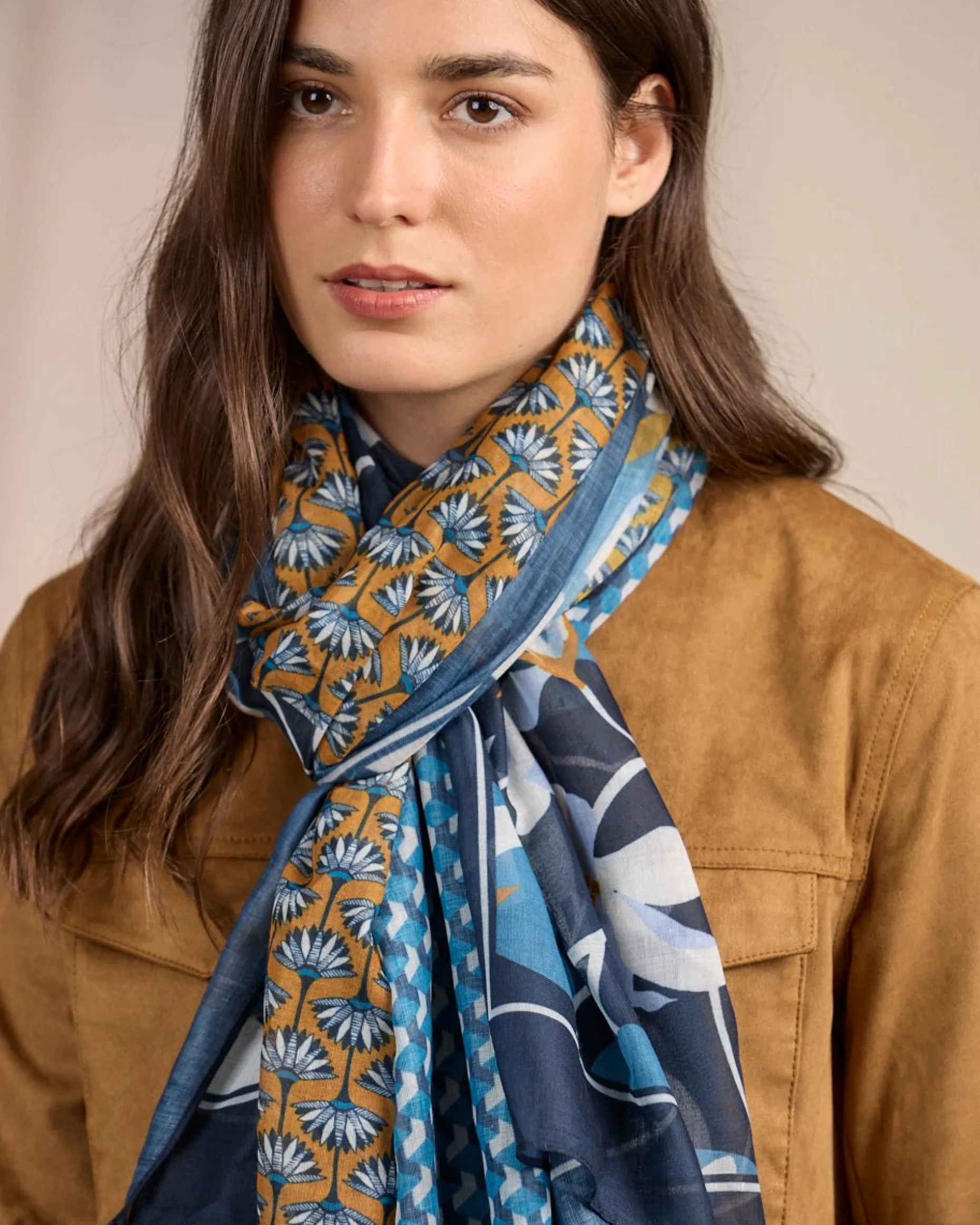 Accessoire élégant par excellence, ce chèche bleu féminin rehausse vos tenues et comporte des motifs raffinés. Son tissu léger et doux est entièrement réalisé en polyester recyclé. Il vous habille en toute simplicité et se noue au gré de vos envies autour de votre cou, de votre sac ou dans vos cheveux !