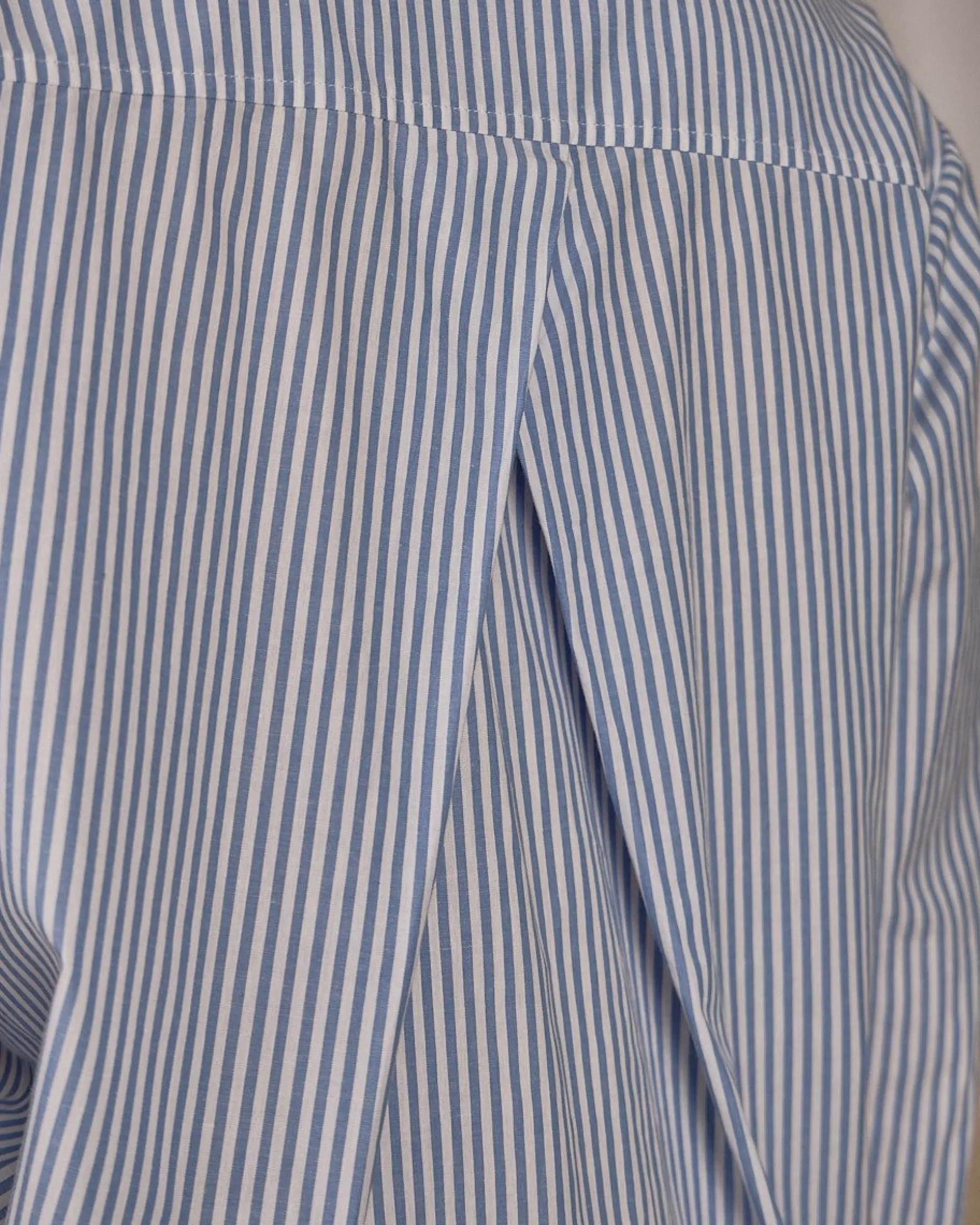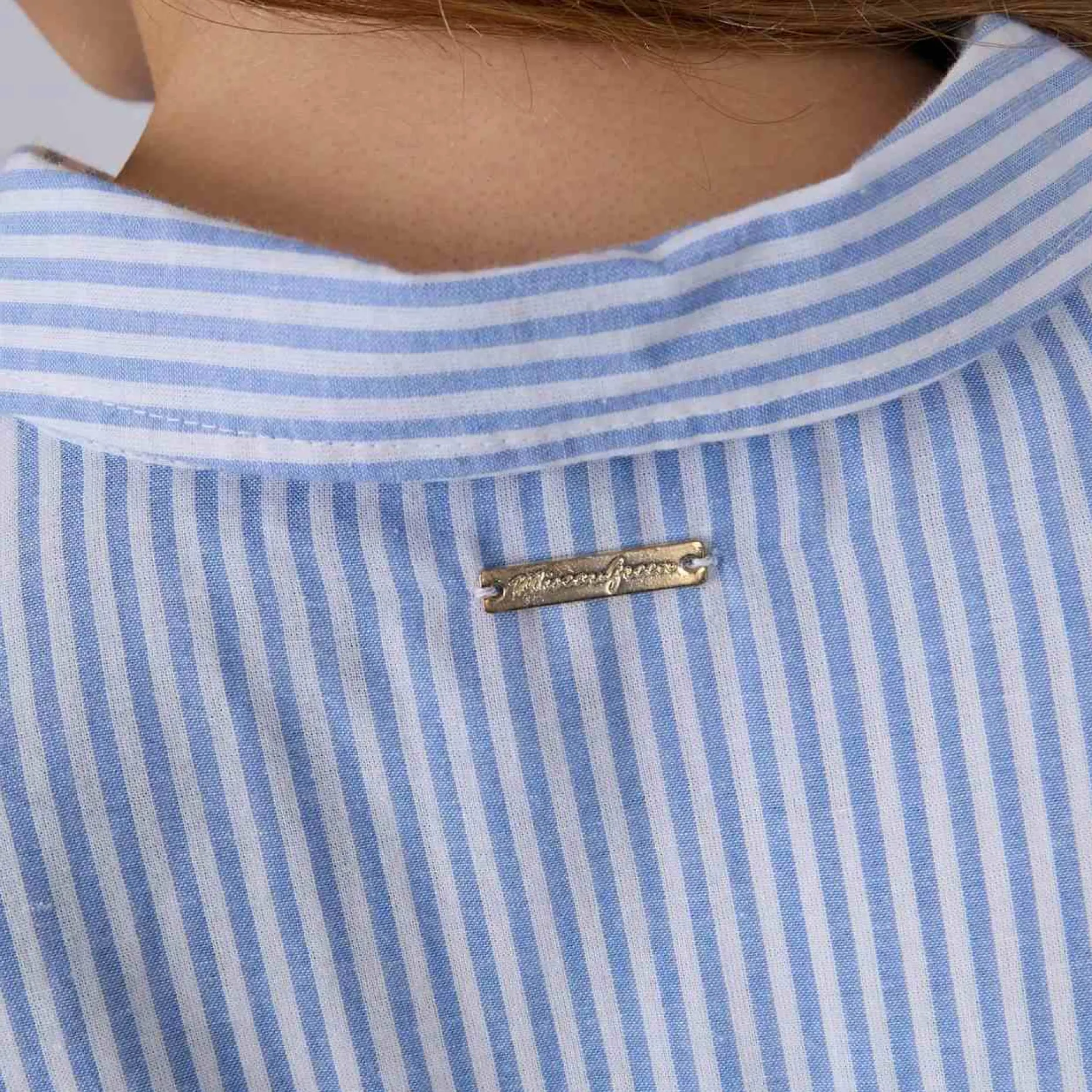 Mise au Green revisite la chemise à rayures dans une version féminine ultra tendance. Ce modèle bleu ciel affiche une poche sur la poitrine, des poignets boutonnés et un pli au creux du dos. Portez ce haut chic avec une jupe ou un pantalon selon vos envies ! La touche finale : ses boutons effet nacré et sa petite plaquette dorée à l’arrière.