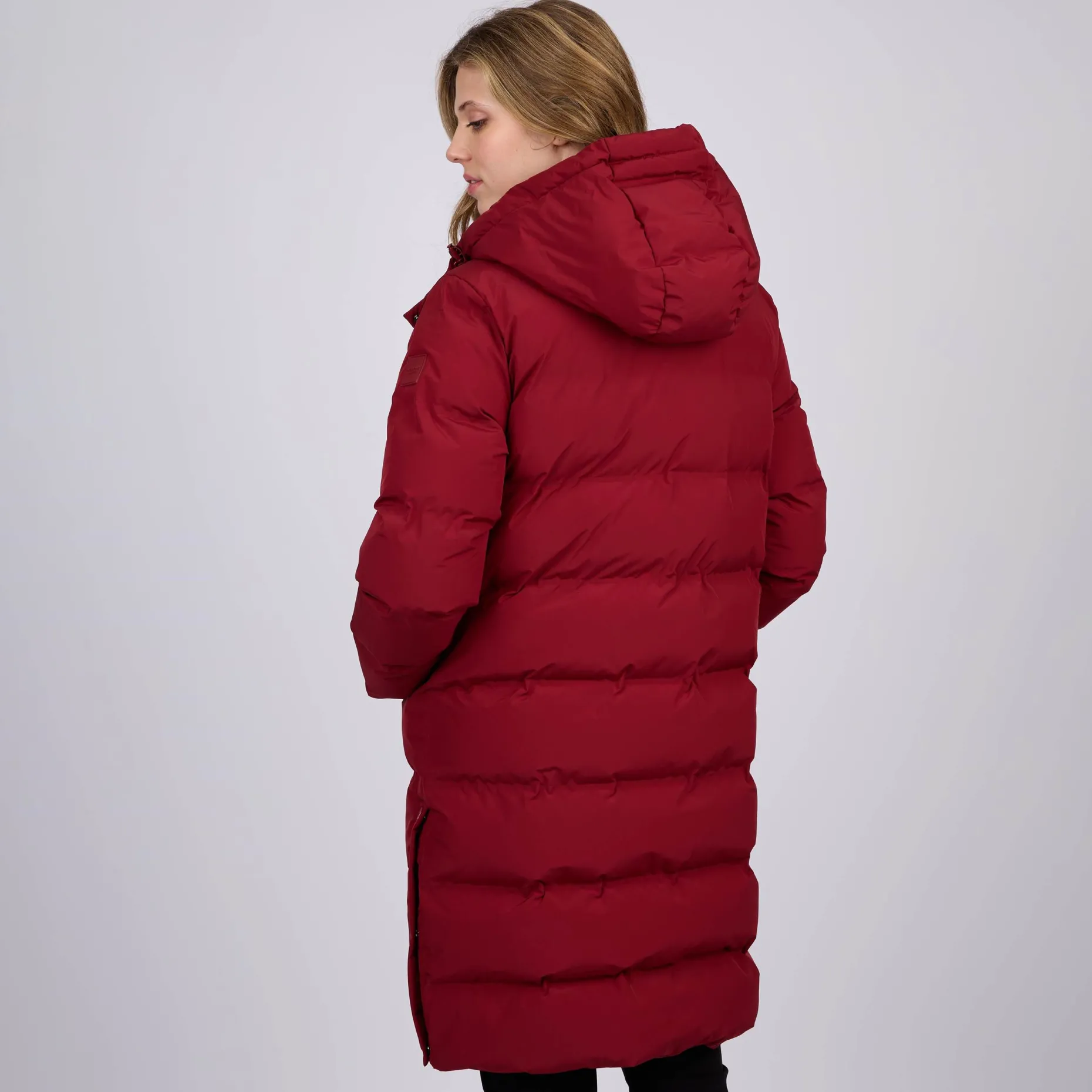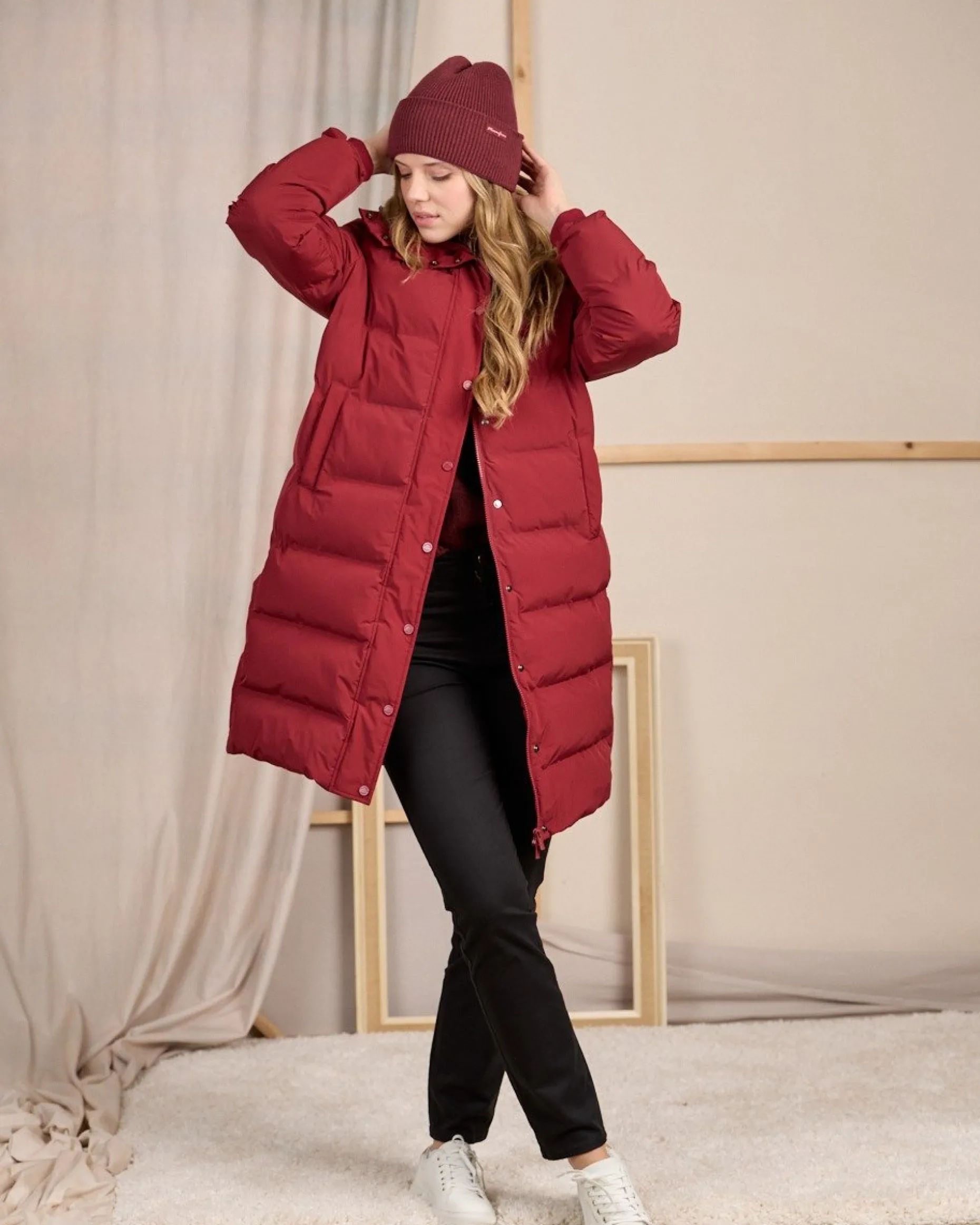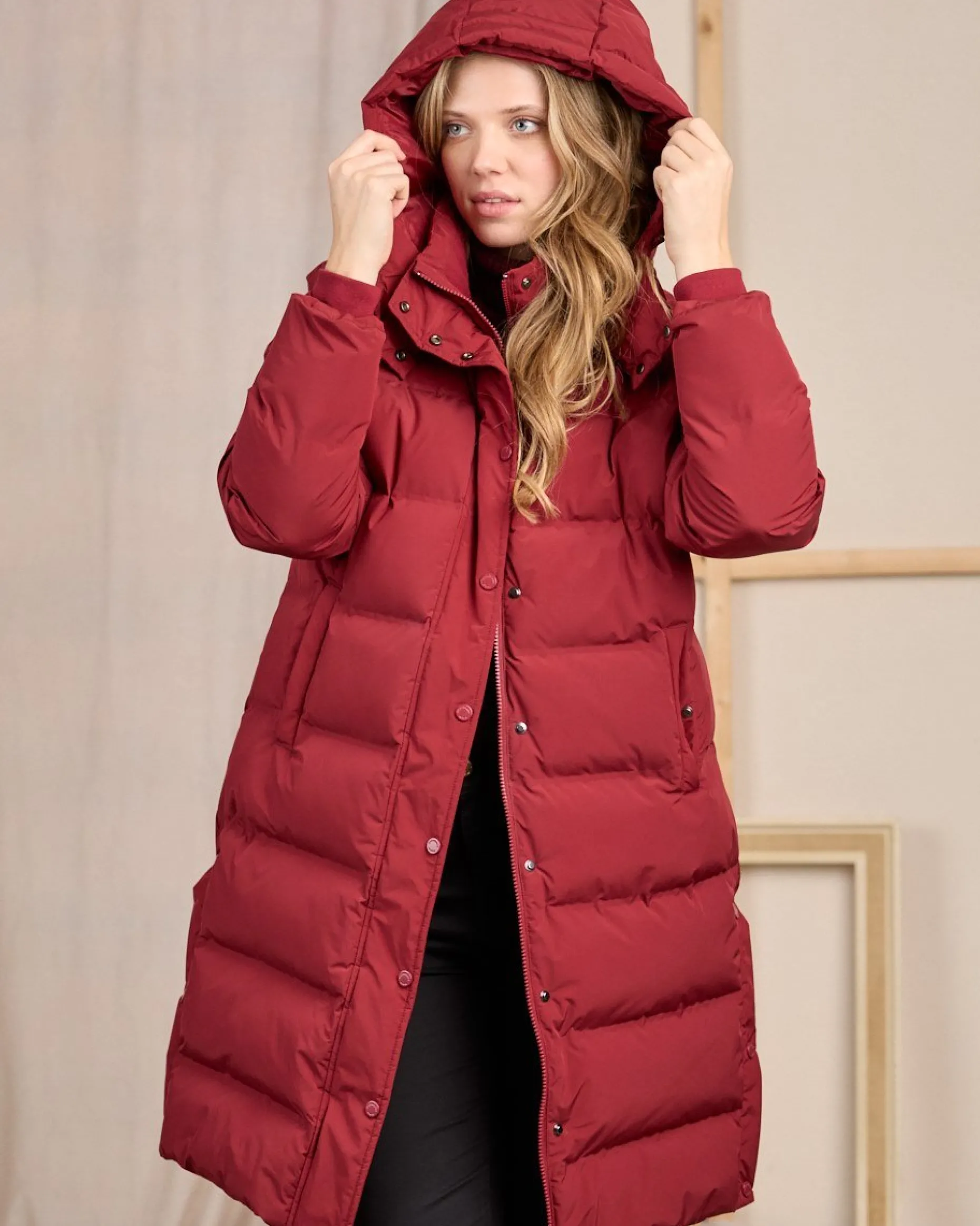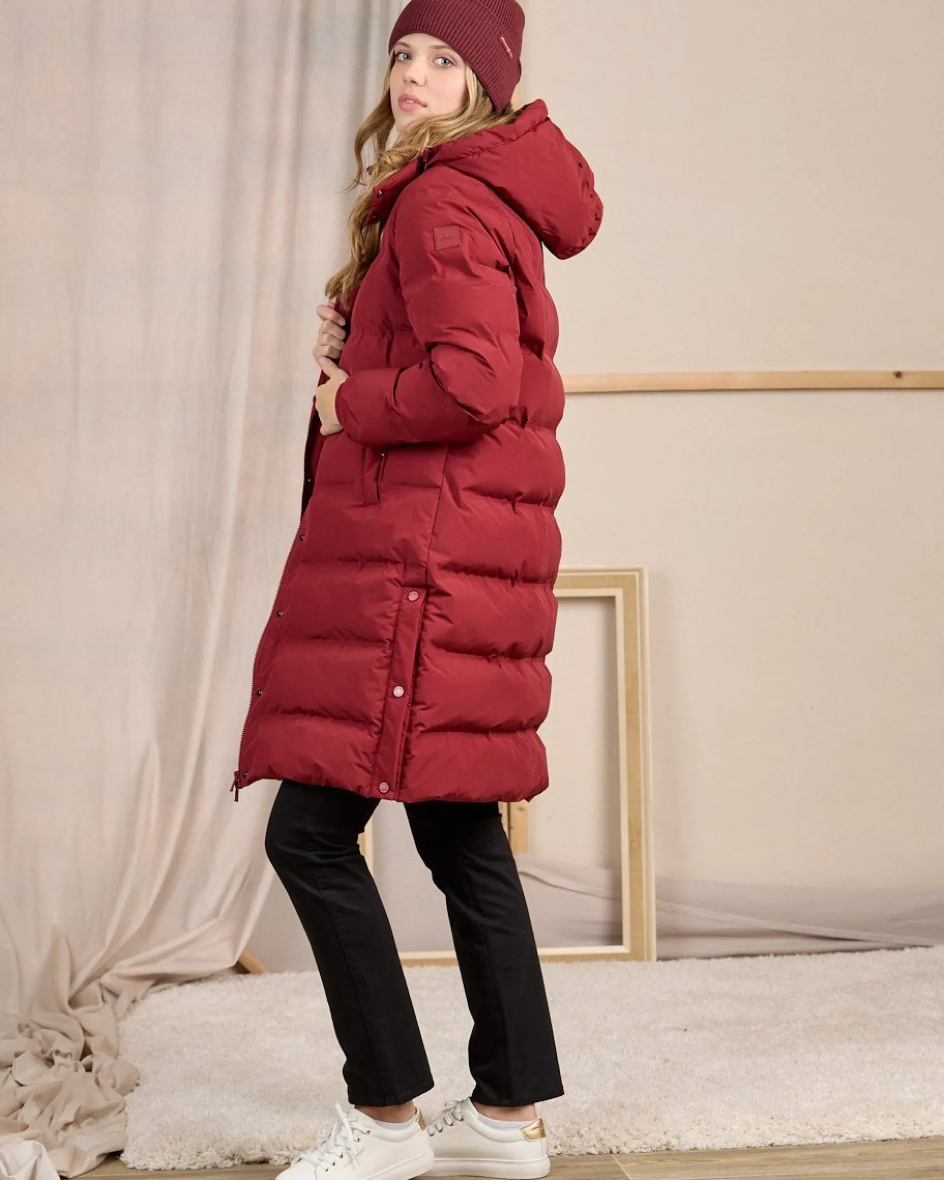 Un style sobre et élégant avec cette doudoune longue bordeaux ! Moelleuse et confortable, elle descend jusqu’aux genoux pour vous protéger efficacement du froid et vous apporter du réconfort à chaque sortie. Son design matelassé est complété par des détails bien pensés comme deux poches latérales, une capuche et des fentes sur les côtés avec boutons-pression. En ville comme en pleine nature, vous allez adorer vous y emmitoufler !