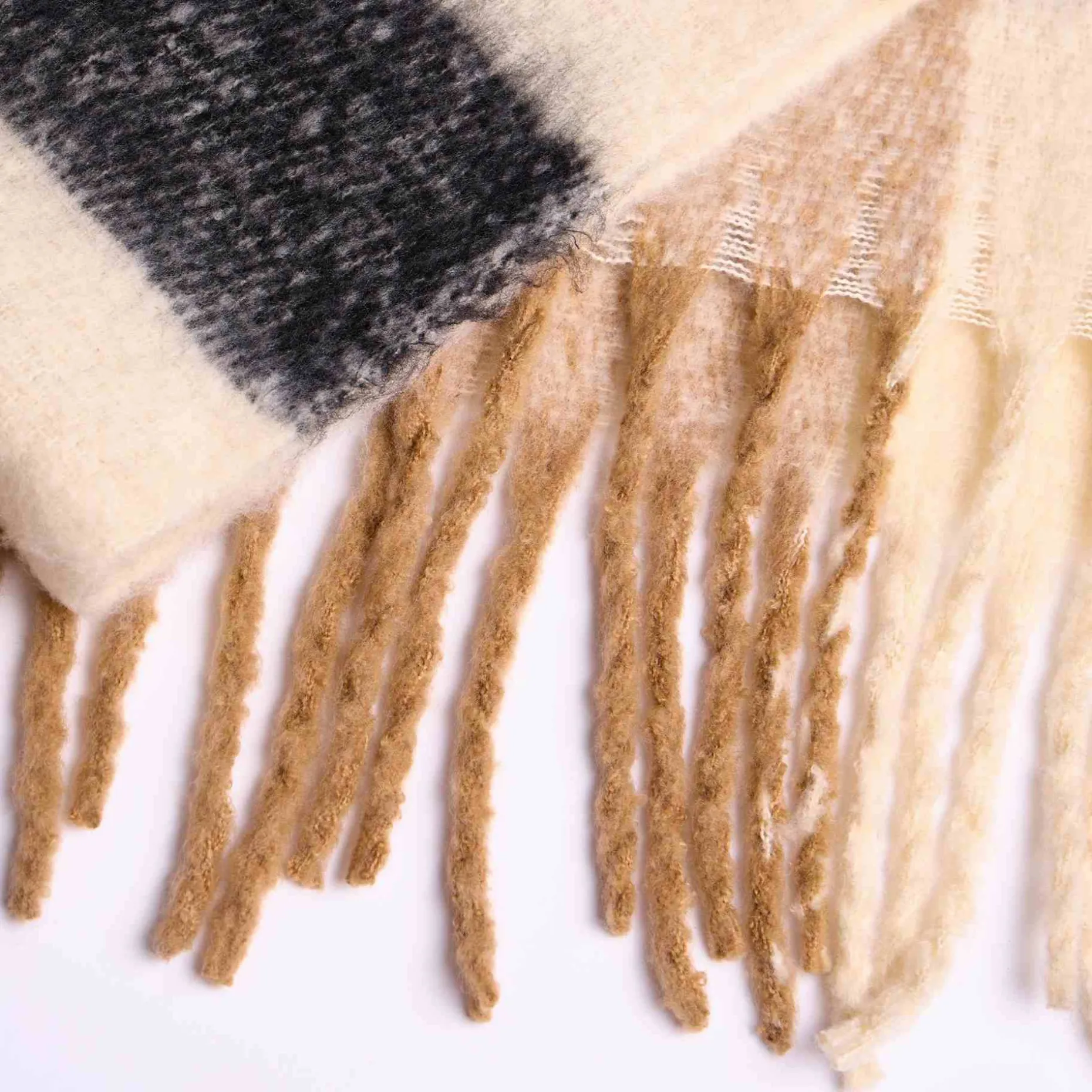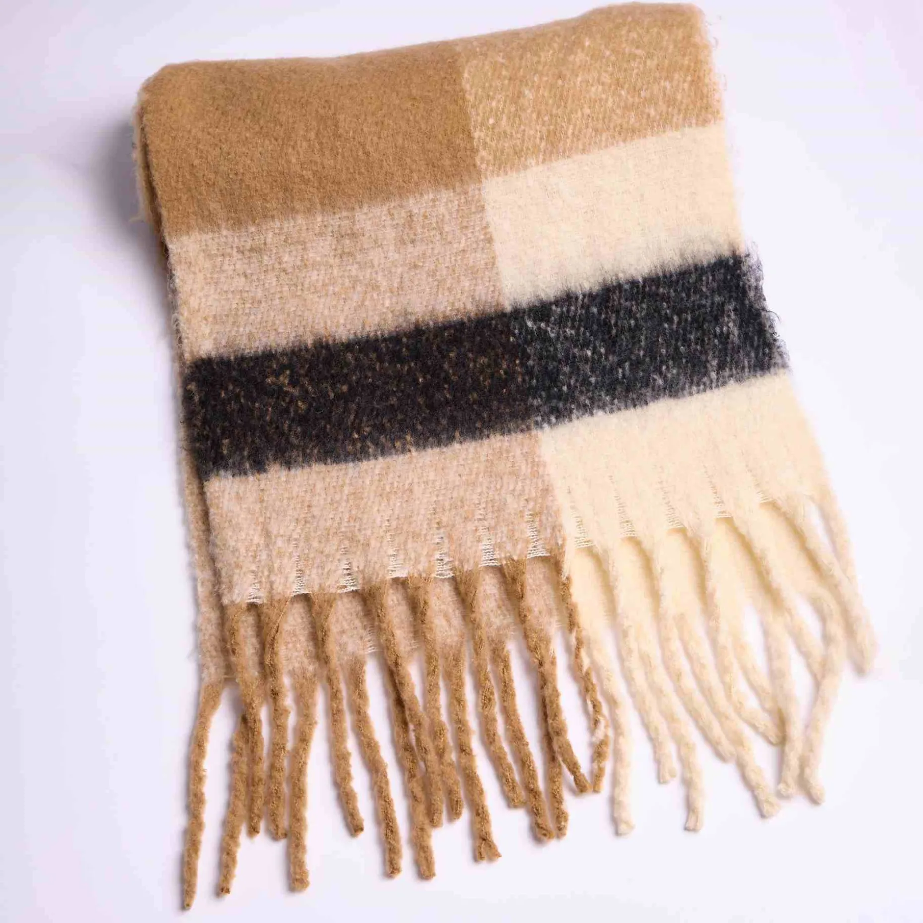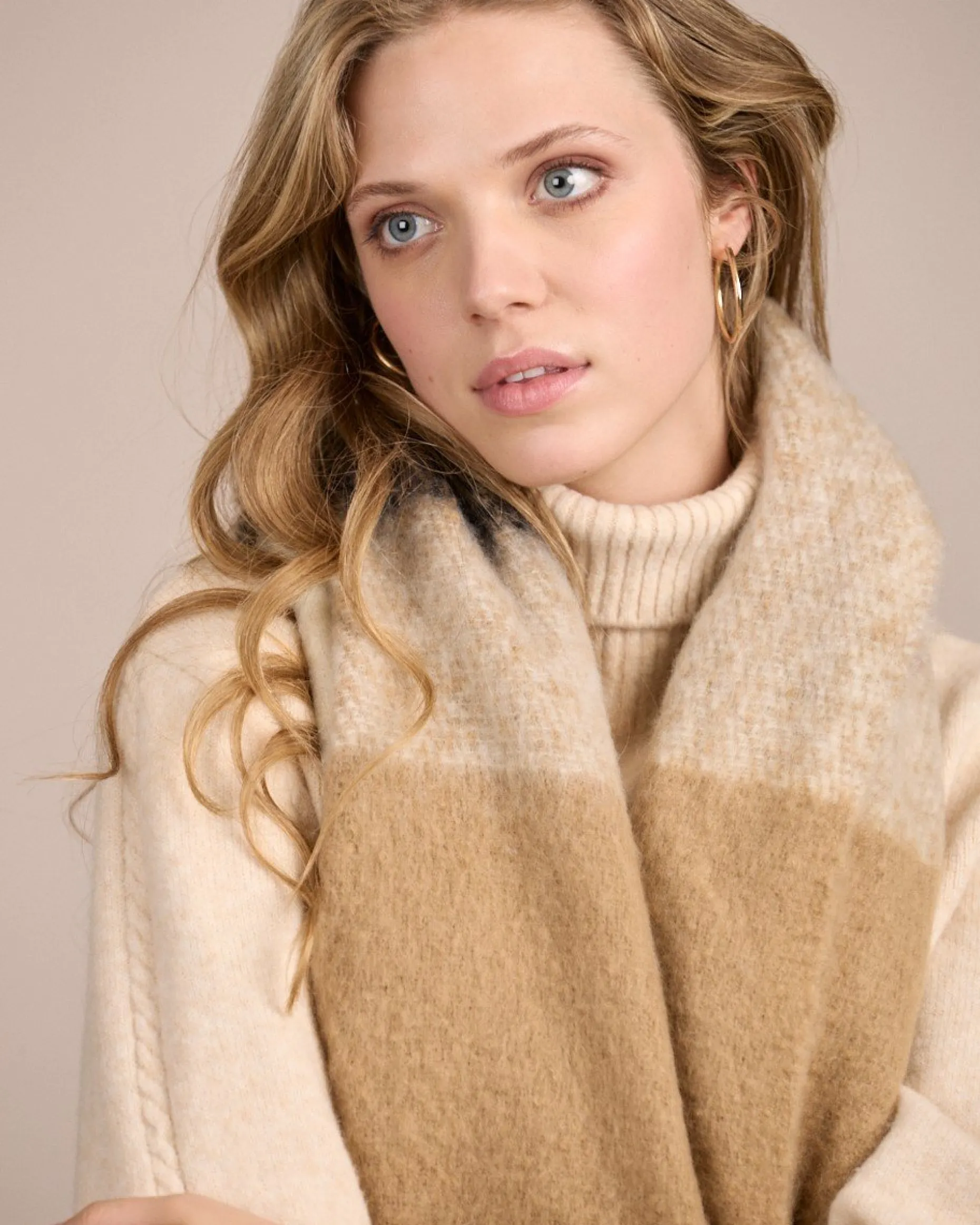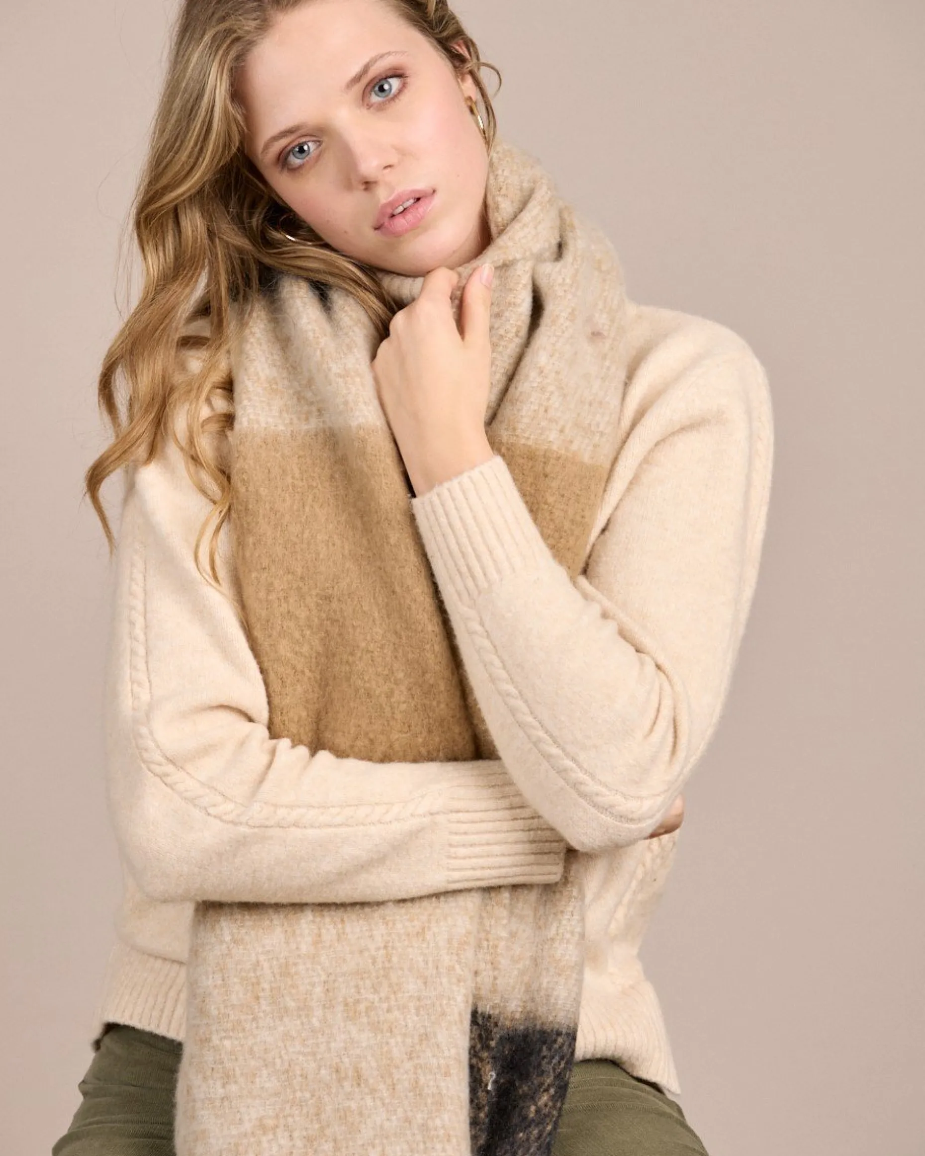 Nouvelle écharpe en vue ! Vous allez adorer sa maille douce en polyester recyclé et ses finitions bords frangés. Facile à porter, cet accessoire est doté de bandes de couleurs aux nuances marrons. Un allié pour la saison pour vous protéger du vent et du froid !