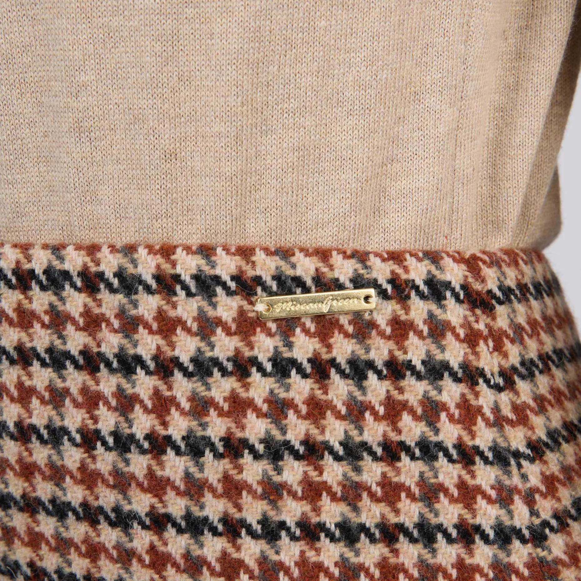 Sublimez vos tenues avec cette jupe beige ! Ce modèle se démarque par son motif iconique pied-de-poule, synonyme d’une élégance chic et intemporelle. Sa coupe près du corps met en valeur votre silhouette, tandis que son coloris beige se prête à toutes vos envies. Une petite fente à l’arrière, une fermeture éclair invisible et une plaquette dorée « Mise au Green » soulignent son design soigné. Elle n’attend plus que vous !