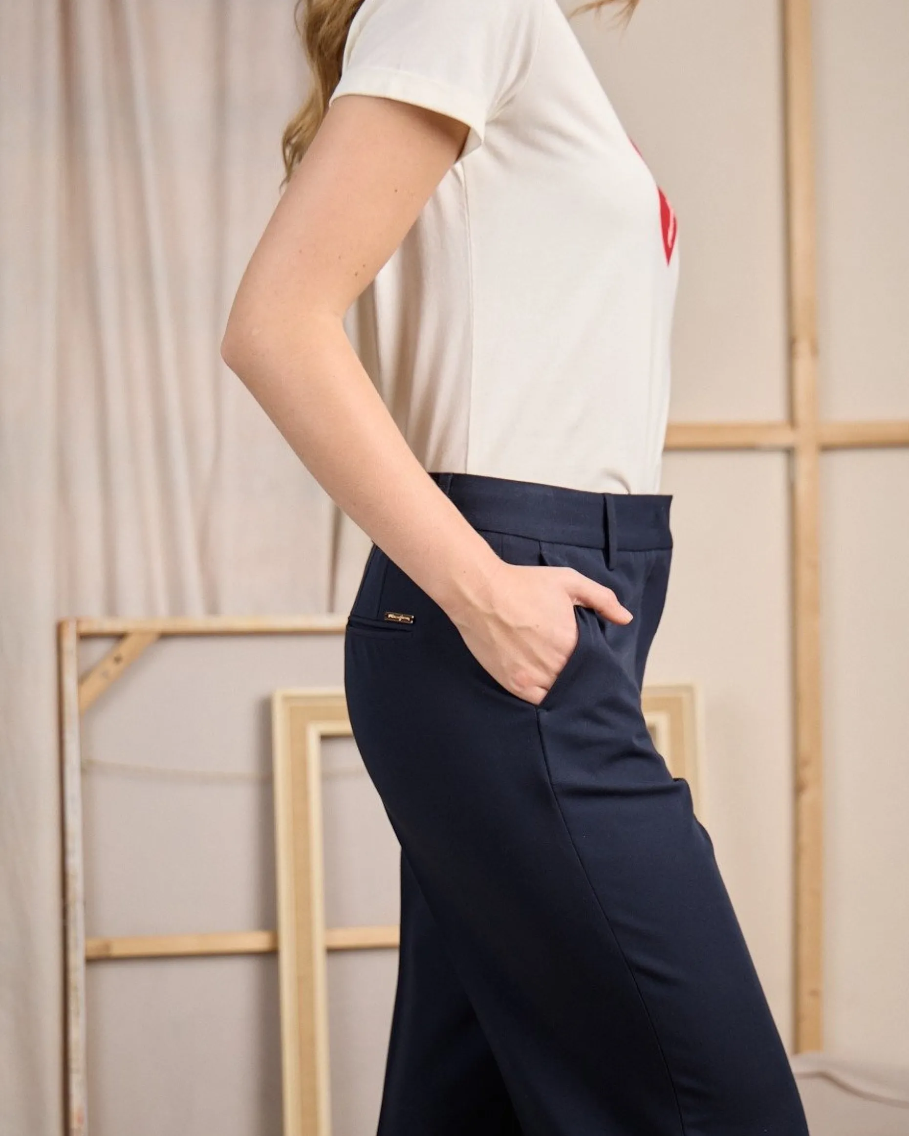 Polyvalent et sobre : appropriez-vous ce pantalon flare pour des looks chics en toutes circonstances ! Avec sa teinte bleu marine et sa coupe flatteuse qui allonge la silhouette, ce modèle s’associe à l’infini. Très agréable à porter, il est fabriqué dans un mélange de polyester, de rayonne et de spandex. Deux poches sur le devant, deux fausses poches à l’arrière et des passants pour ceinture apportent la touche finale. C’est un allié du quotidien !