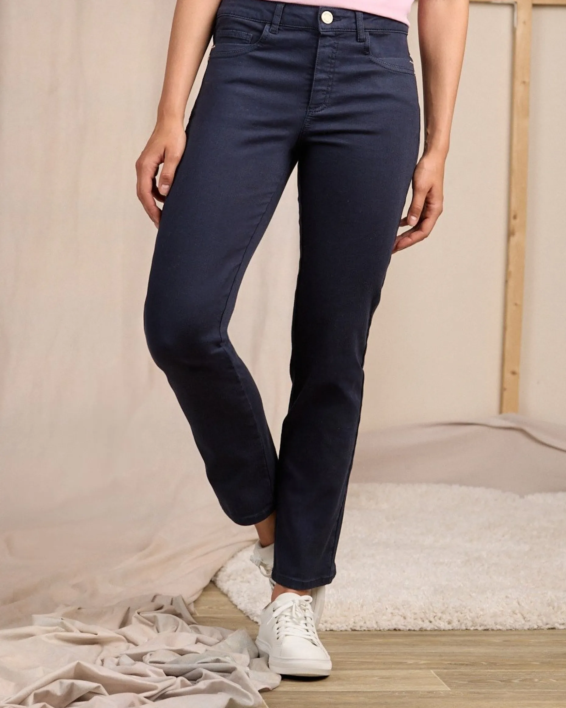 Avec son design à 5 poches et son coloris bleu marine, ce pantalon pour femme a tout d’un nouvel essentiel. Confectionné en coton issu de l’agriculture biologique avec une pointe d’élasthanne, il mise sur le style et le confort. Il est complété par des détails travaillés comme sa braguette zippée avec bouton doré et son jacron Mise au Green. Révélez votre chic en le mixant avec un pull ou une blouse de notre collection !