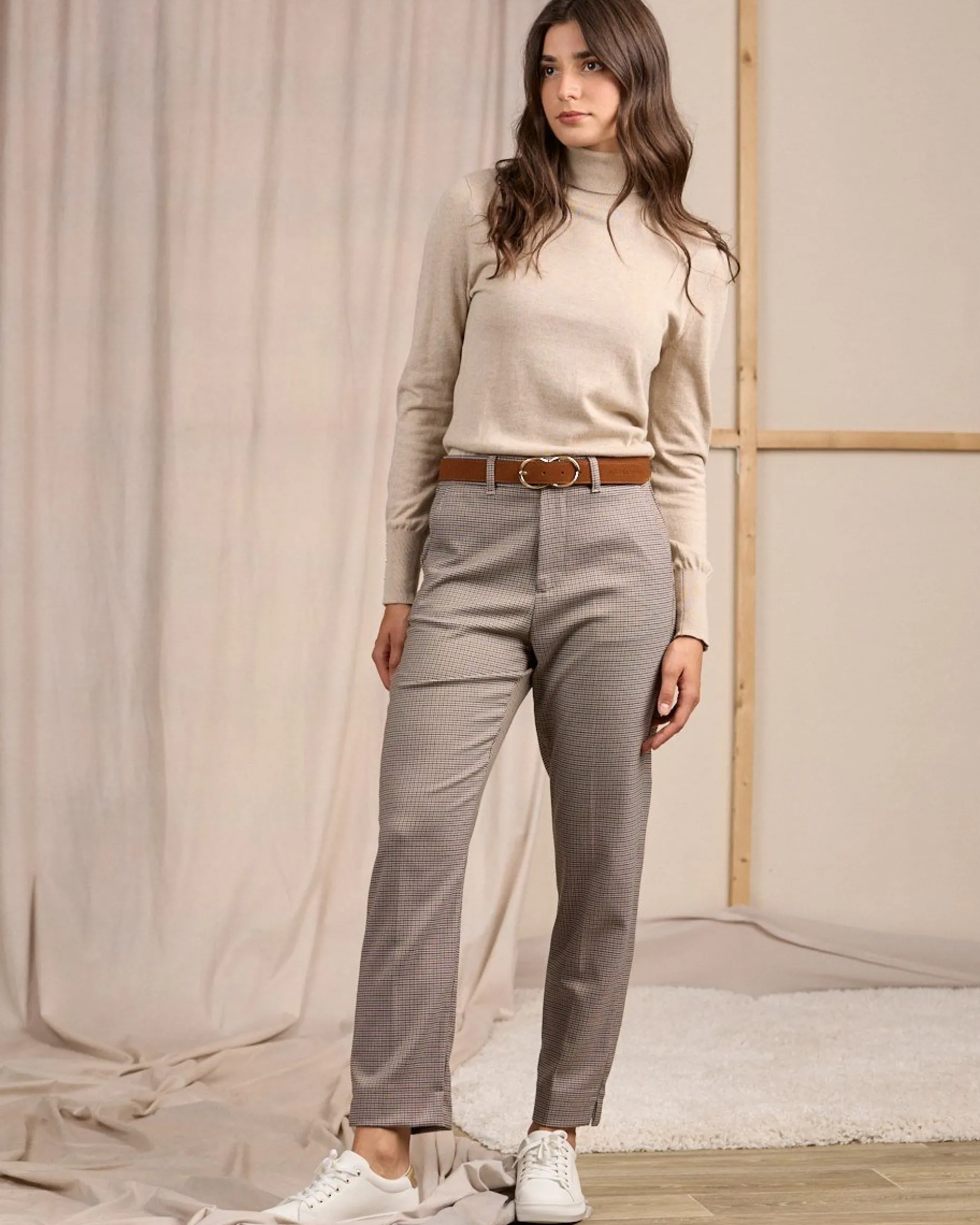Une pièce phare que vous allez adorer ! Ce pantalon pour femme est caractérisé par une teinte beige et un motif pied-de-poule emblématique. D’un grand confort, il présente une coupe chino, une braguette zippée et boutonnée, deux poches à l’avant et de fausses poches à l’arrière. Pour aller au travail ou participer à des sorties décontractées : il habille toutes vos tenues avec élégance et sophistication !
