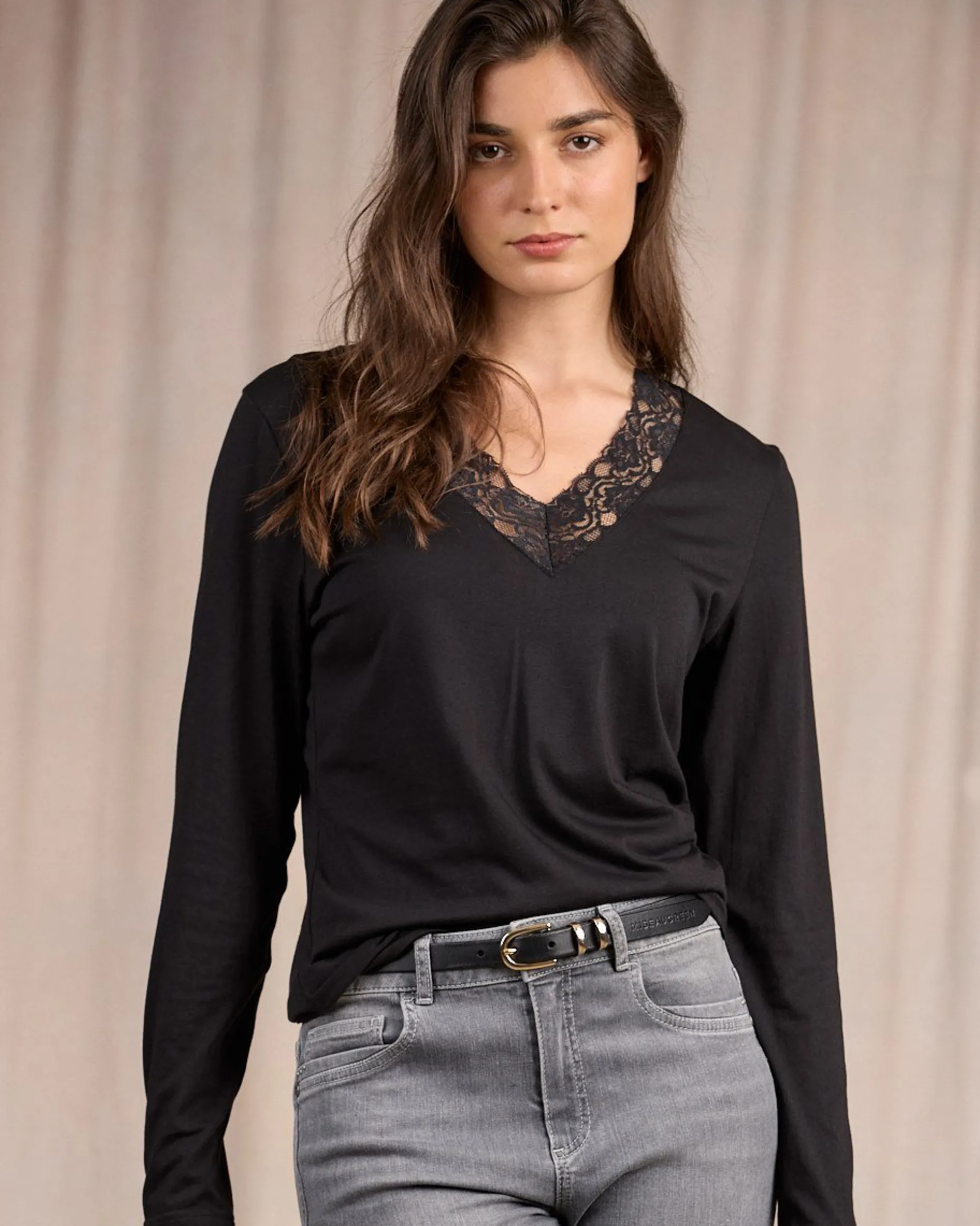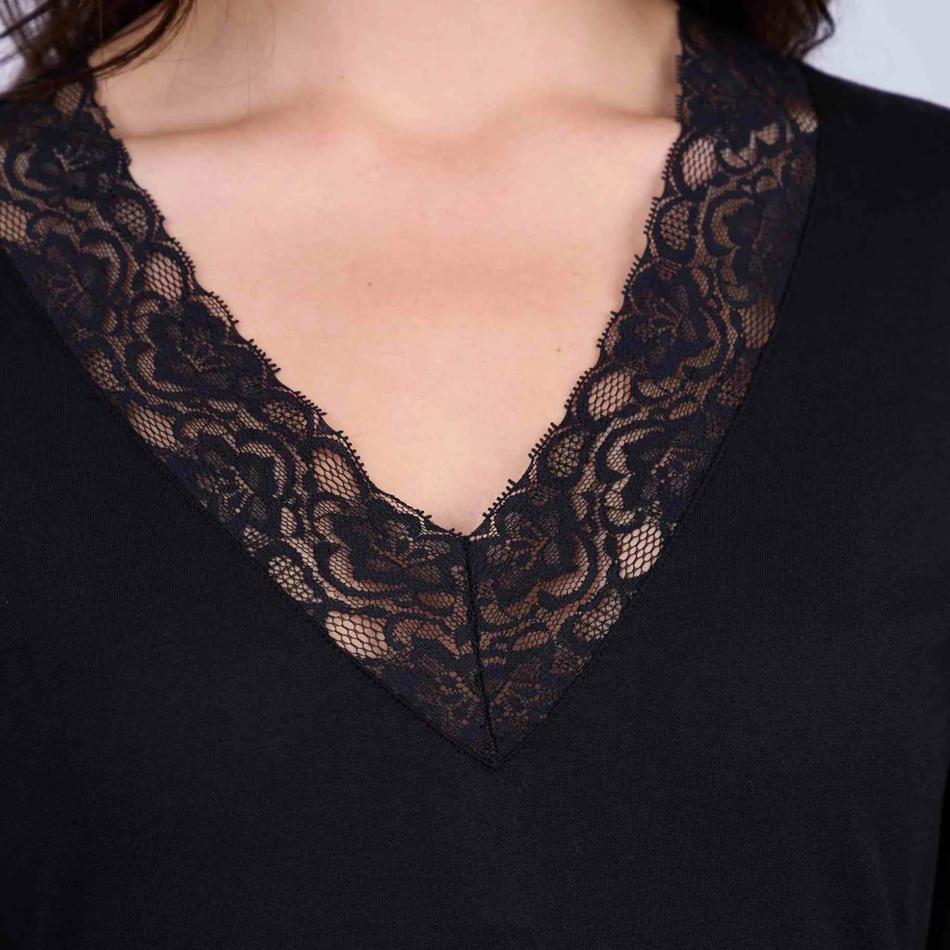 Arborez une silhouette glamour et faites votre petit effet avec ce tee-shirt à manches longues ! Faussement sage, ce modèle noir est sublimé par des bandes de dentelle ton sur ton au niveau de l’encolure en V. Associez-le avec une jupe ou un pantalon pour des tenues romantiques et faciles à porter !