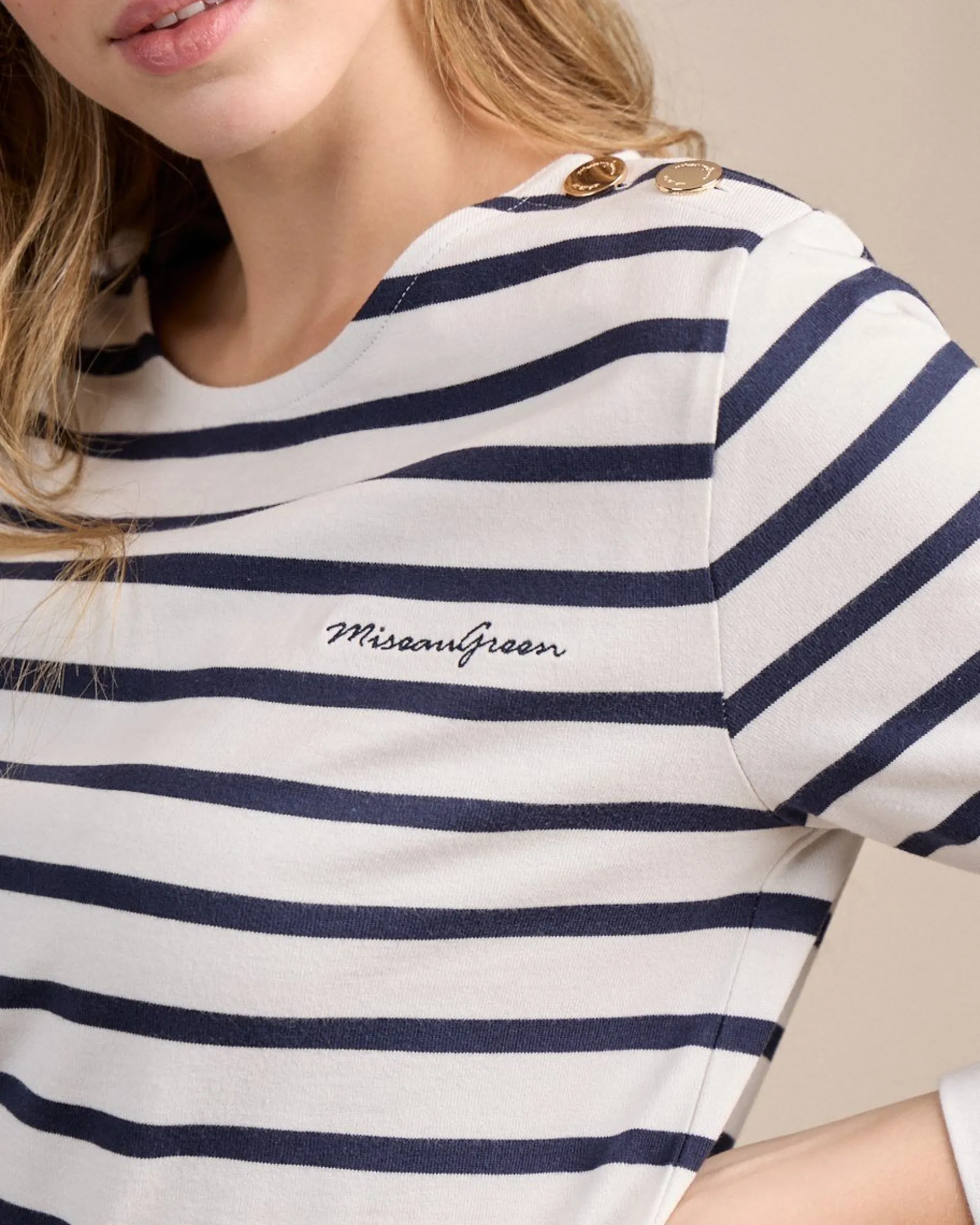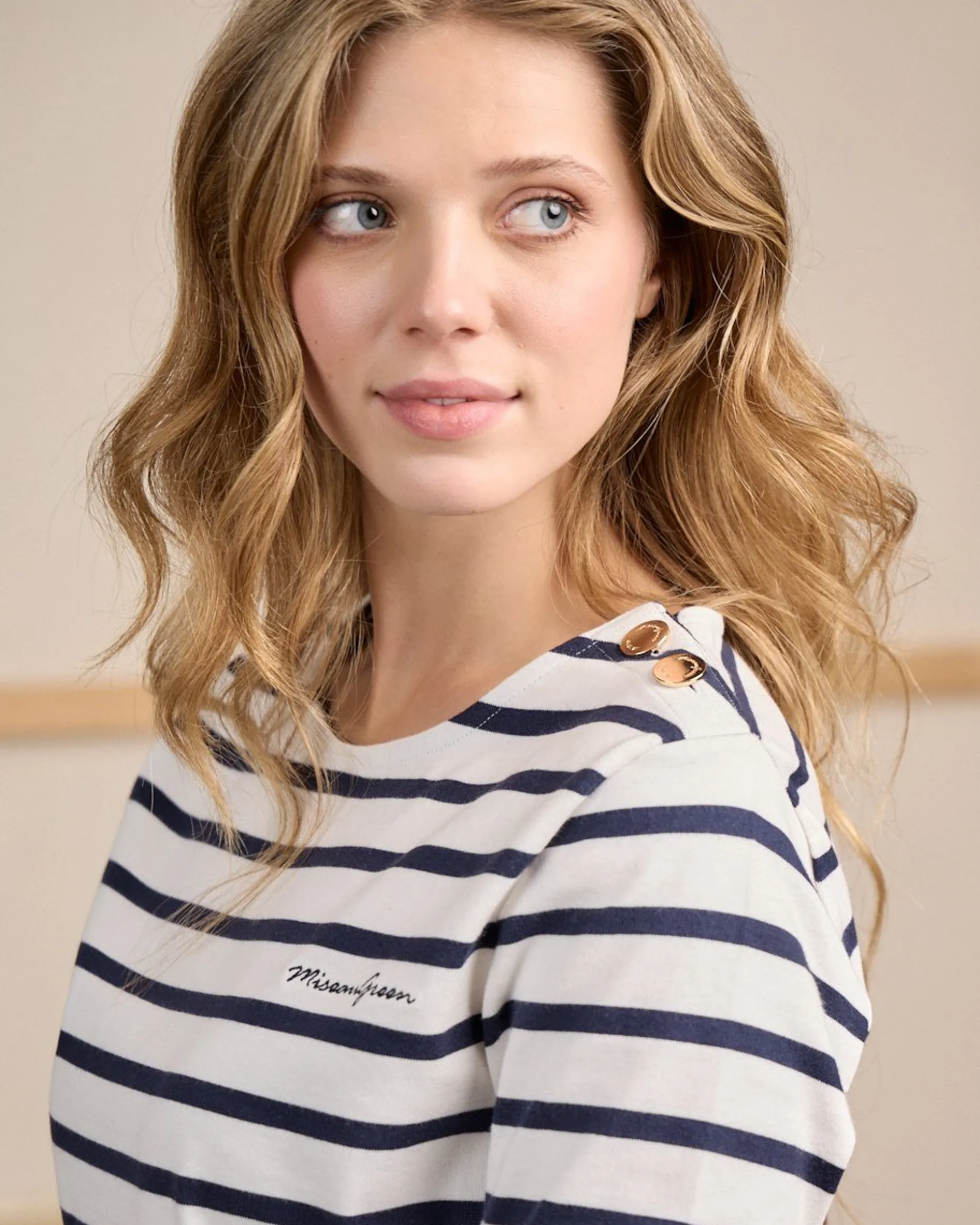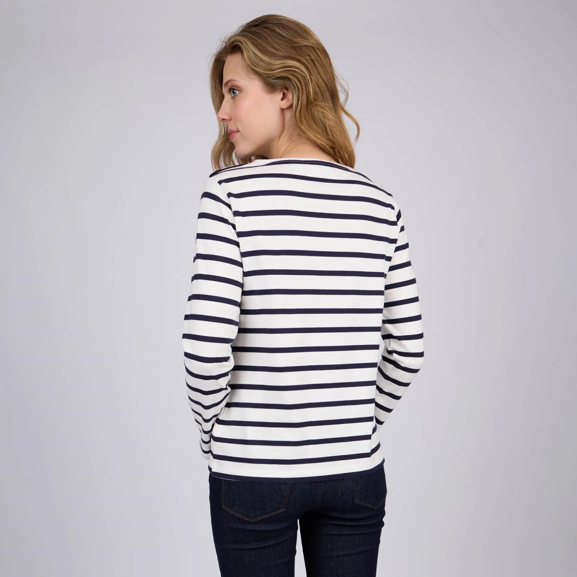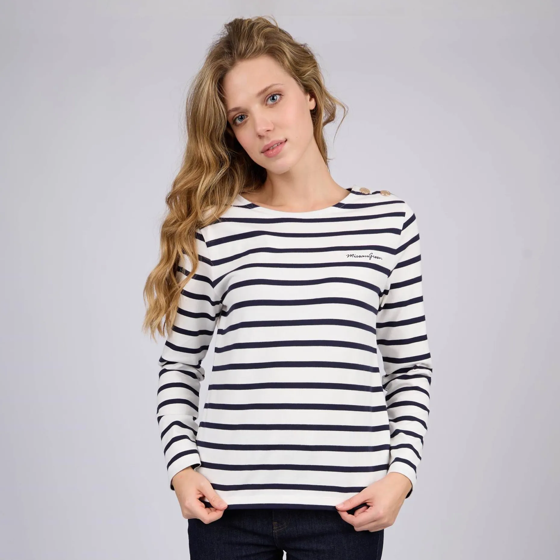 Inspiré du vestiaire marin, ce tee-shirt marinière à manches longues pour femme est déjà iconique ! Sa matière en coton issu de l’agriculture biologique le rend agréable à porter et respirant. Grâce à son imprimé à rayures et son coloris blanc, ce modèle mêle décontraction et élégance avec facilité ! Des détails raffinés comme sa patte de boutonnage à deux boutons dorés et son col rond complètent cet essentiel.