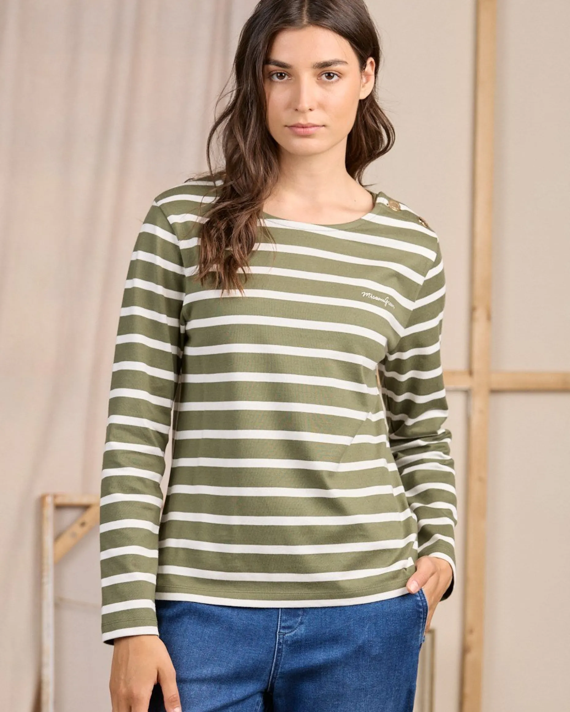 Inspiré du vestiaire marin, ce tee-shirt marinière à manches longues pour femme est déjà iconique ! Sa matière en coton issu de l’agriculture biologique le rend agréable à porter et respirant. Grâce à son imprimé à rayures et son coloris kaki, ce modèle mêle décontraction et élégance avec facilité ! Des détails raffinés comme sa patte de boutonnage à deux boutons dorés et son col rond complètent cet essentiel.