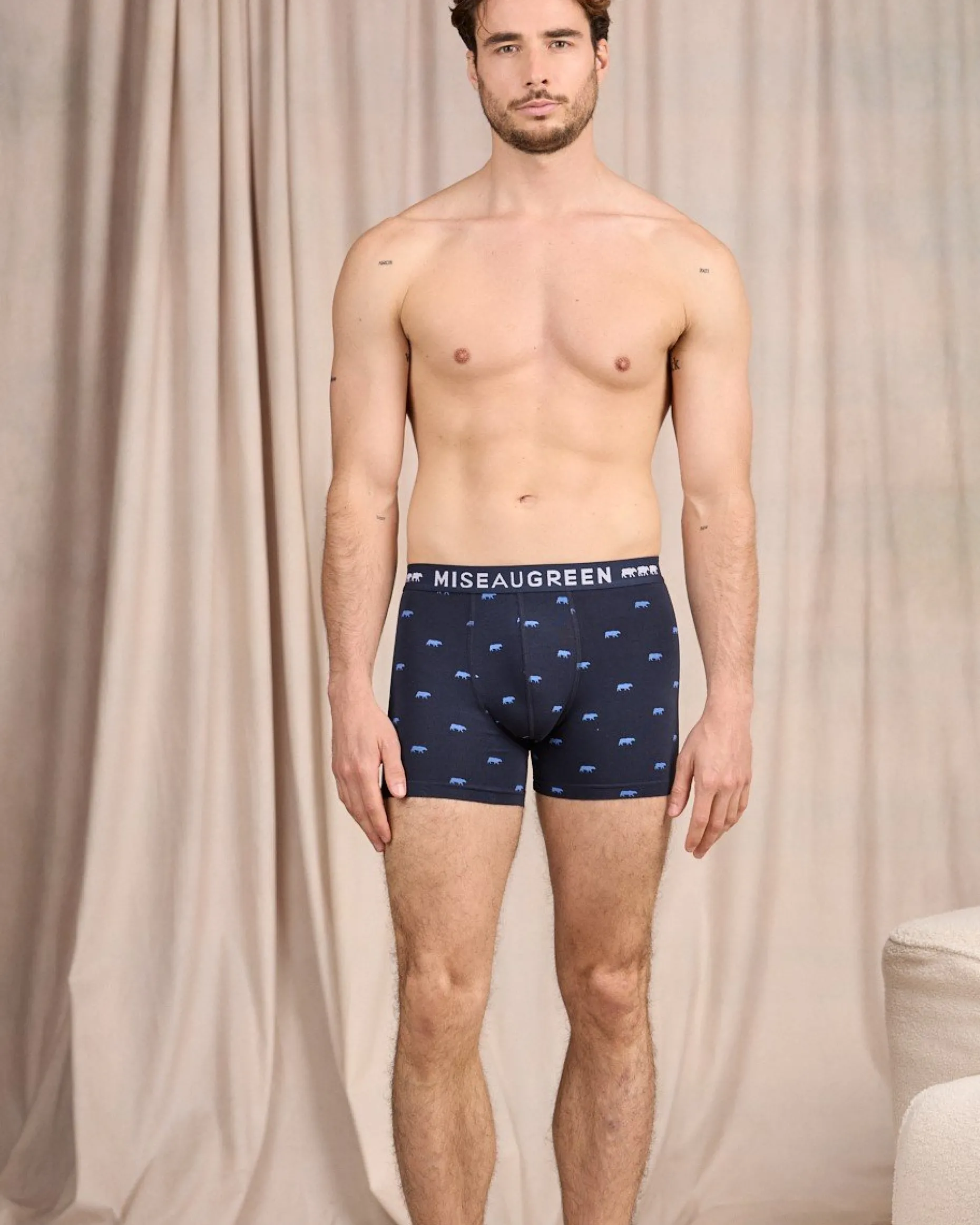 Réalisé en coton avec une pointe d’élasthanne, ce boxer est à la fois doux, résistant et respirant. Pour assurer un maintien parfait du matin au soir, il possède une ceinture élastiquée et logotée. Avec son imprimé bleu marine Mise au Green exclusif, il sera votre allié fantaisie au quotidien. Un sous-vêtement à (s’)offrir d’urgence pour un confort permanent !