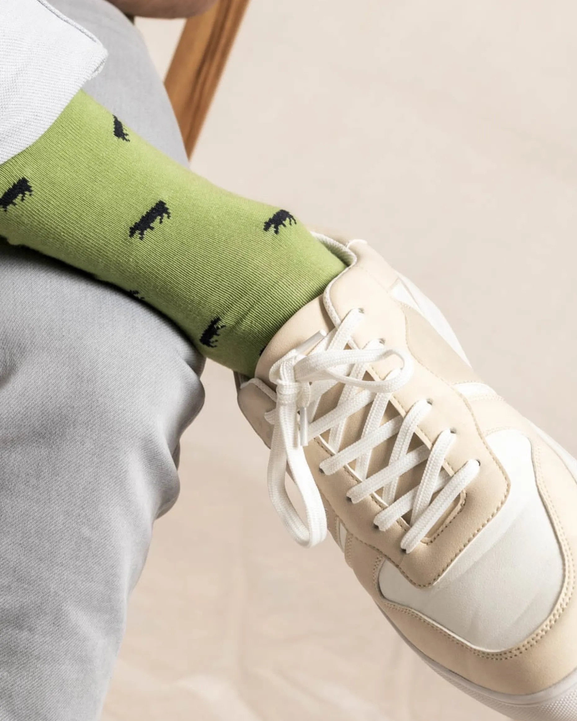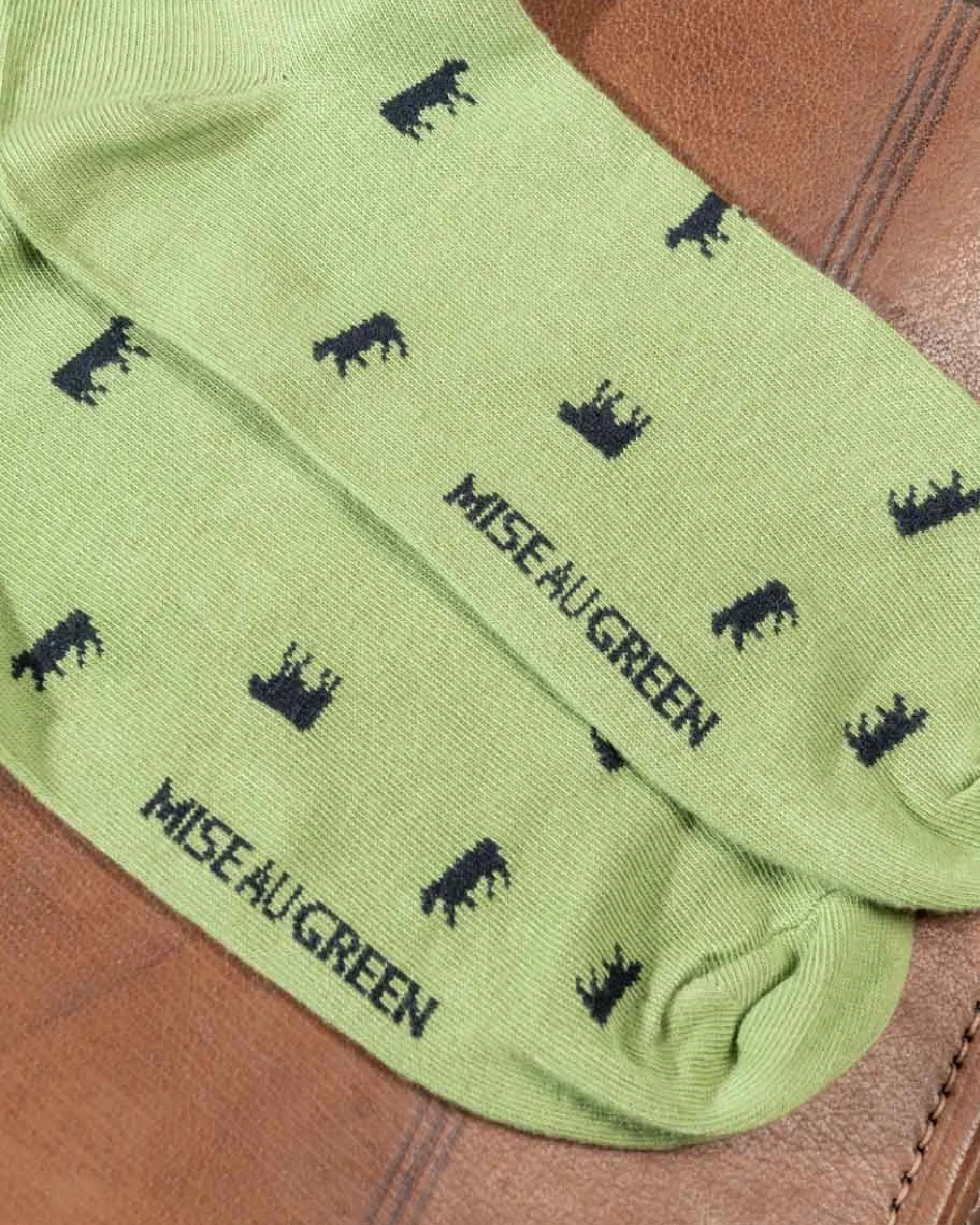 Des petites vaches s’invitent sur vos pieds avec ces chaussettes pour homme ! En plus d’apporter une touche de fantaisie à votre tenue, elles sont aussi très confortables. Leur tissu élastique et doux – mélange de coton, polyamide et élasthanne – ainsi que ses bords-côtes larges permettent un maintien confortable sur la jambe. Fini les chaussettes trop sobres : osez son coloris kaki clair ! Petite anecdote : la vache est l’animal emblématique de notre marque Mise au Green en hommage au grand-père de nos fondateurs qui fut marchand de bestiaux. Il n’a donc pas été choisi au hasard sur cet accessoire original !