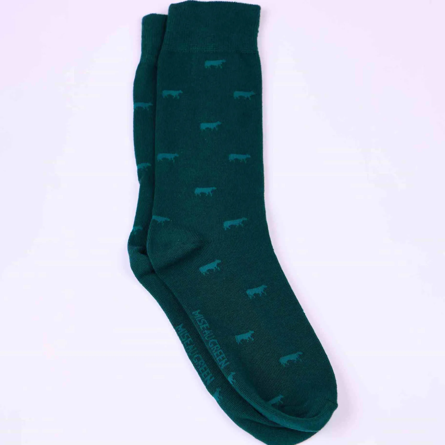 Des petites vaches s’invitent sur vos pieds avec ces chaussettes pour homme ! En plus d’apporter une touche de fantaisie à votre tenue, elles sont aussi très confortables. Leur tissu élastique et doux – mélange de coton, polyamide et élasthanne – ainsi que ses bords-côtes larges permettent un maintien confortable sur la jambe. Fini les chaussettes trop sobres : osez son coloris vert foncé ! Petite anecdote : la vache est l’animal emblématique de notre marque Mise au Green en hommage au grand-père de nos fondateurs qui fut marchand de bestiaux. Il n’a donc pas été choisi au hasard sur cet accessoire original !