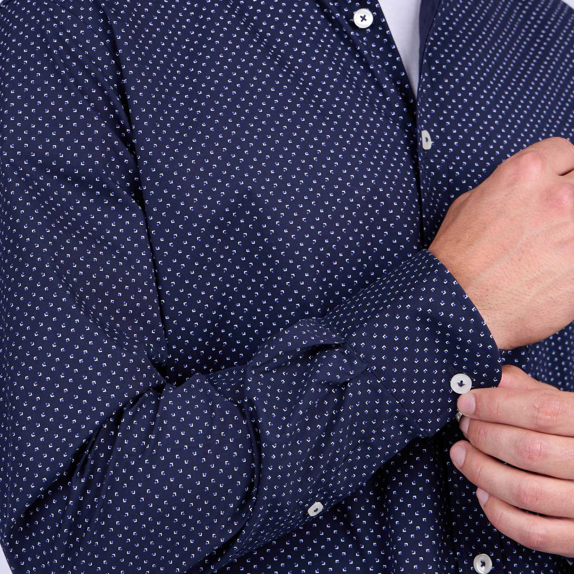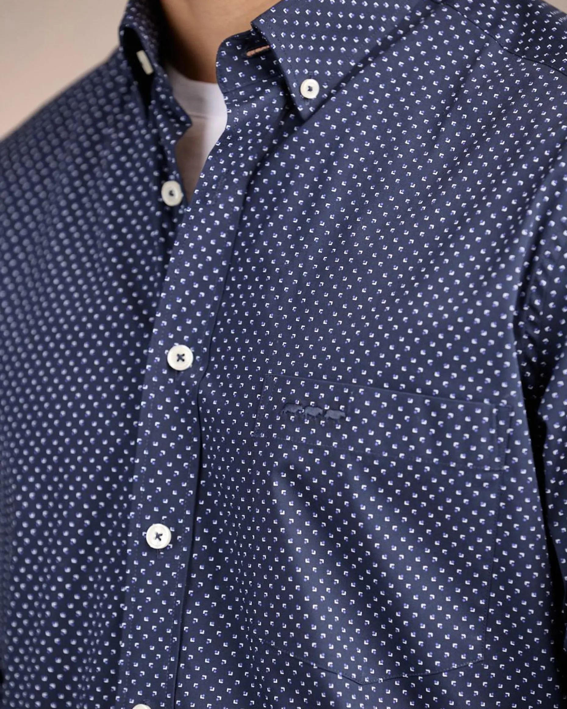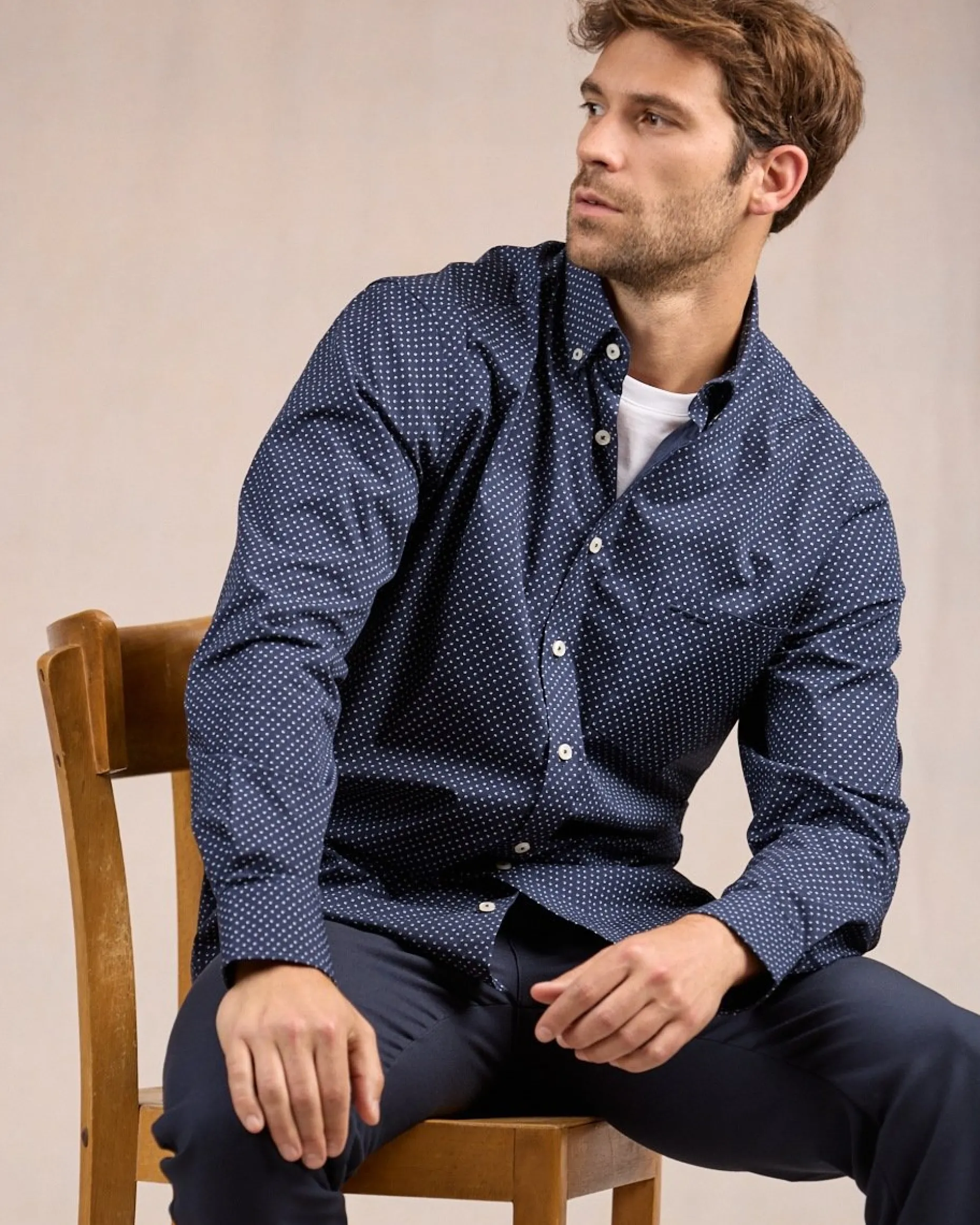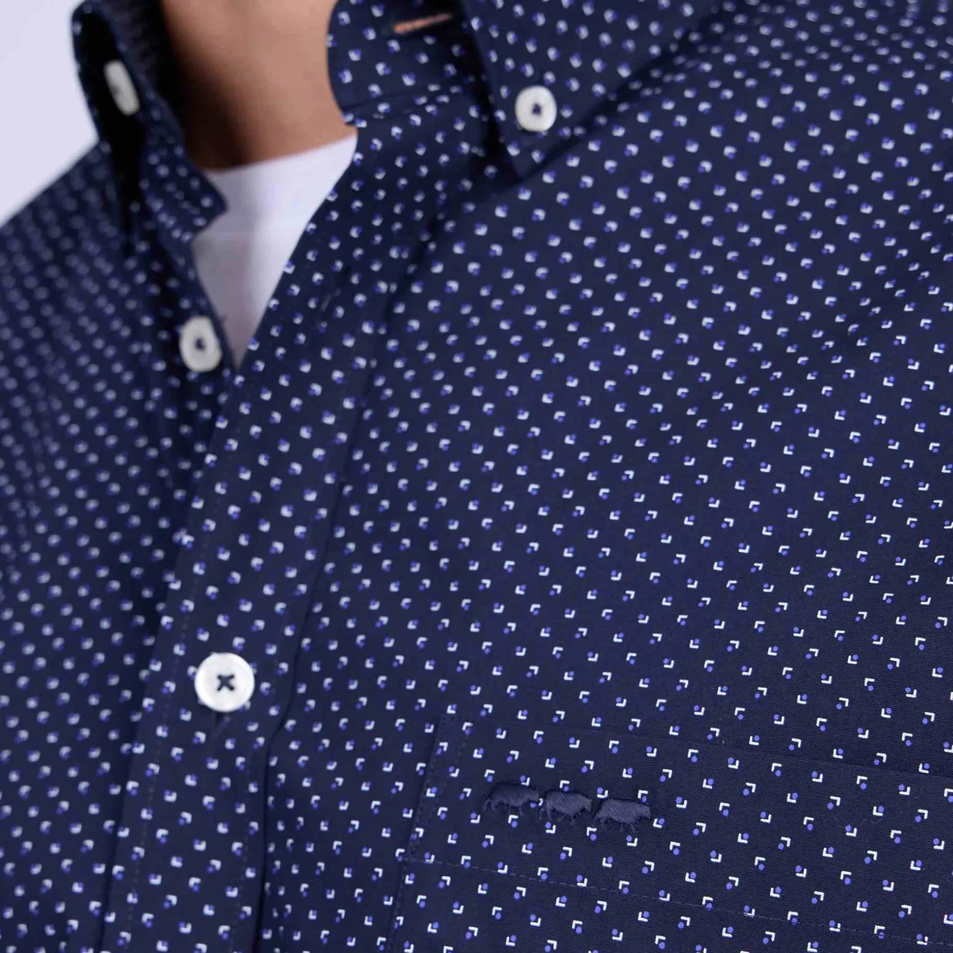 Associant un imprimé micro-motif avec un coloris bleu marine, cette chemise pour homme incarne l’essence même du raffinement. Réalisée en coton, elle a été pensée pour que vous soyez à l’aise tout au long de la journée. Elle présente un col boutonné, une poche poitrine et une broderie ton sur ton « 3 vaches ». Un modèle idéal pour se démarquer avec élégance !
