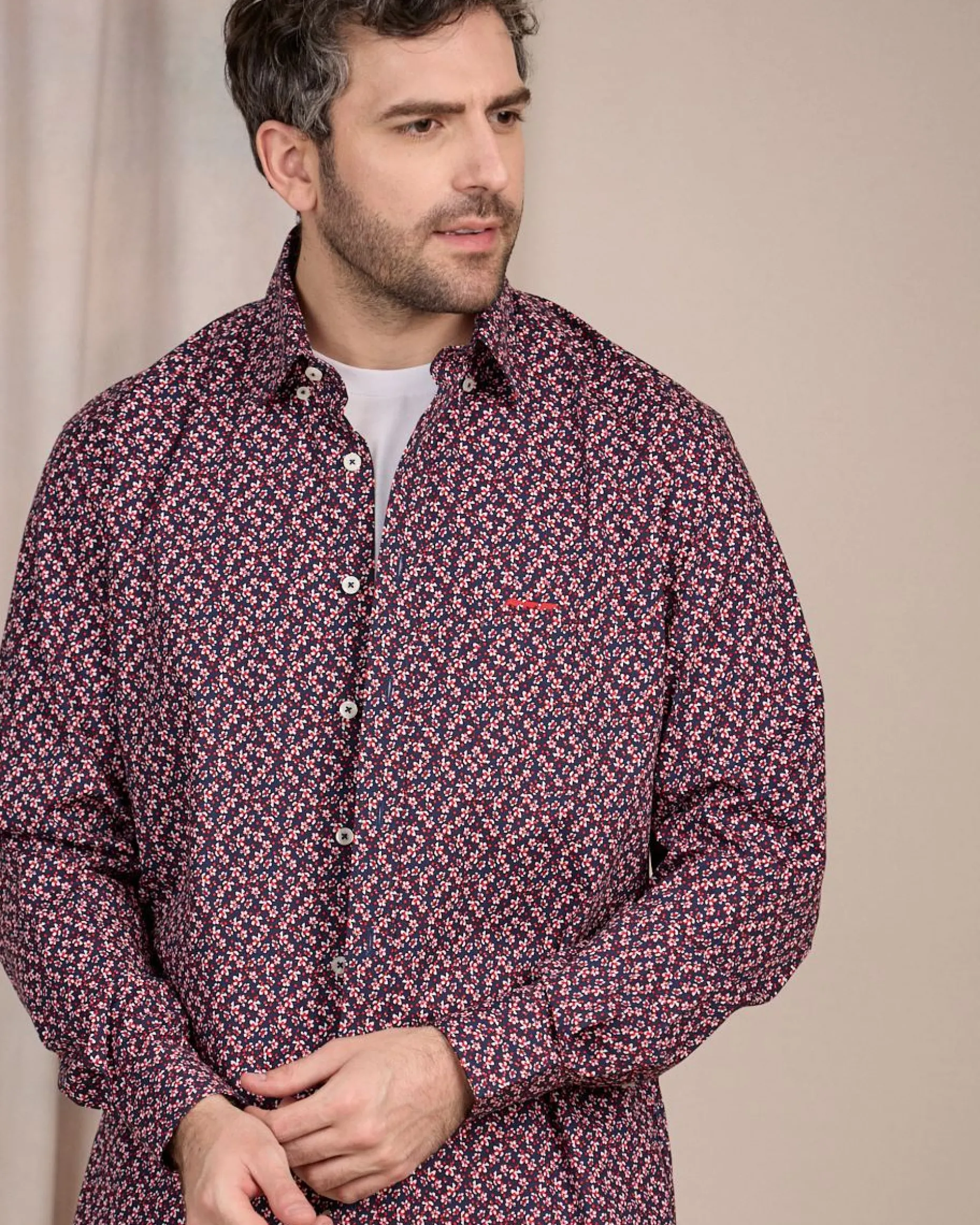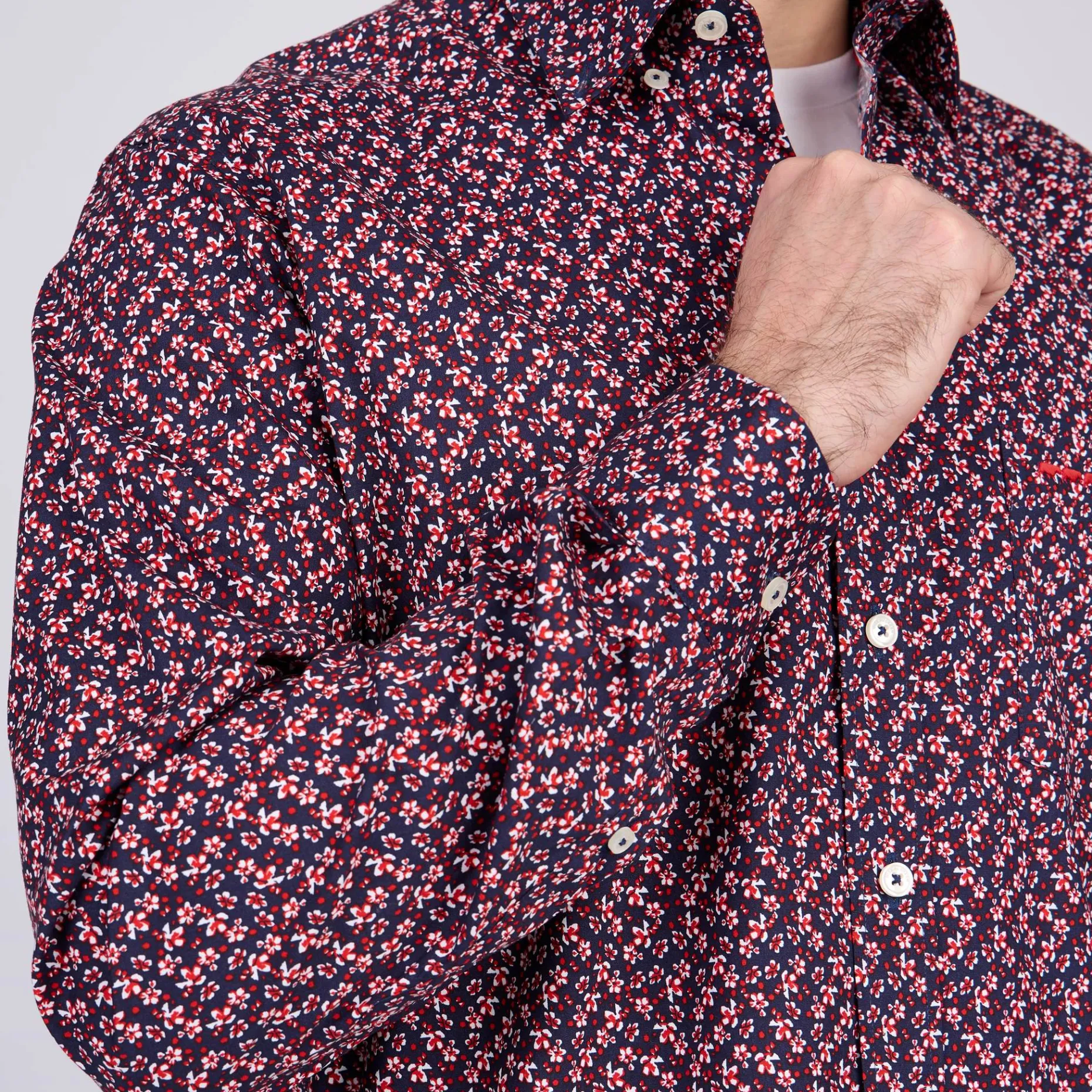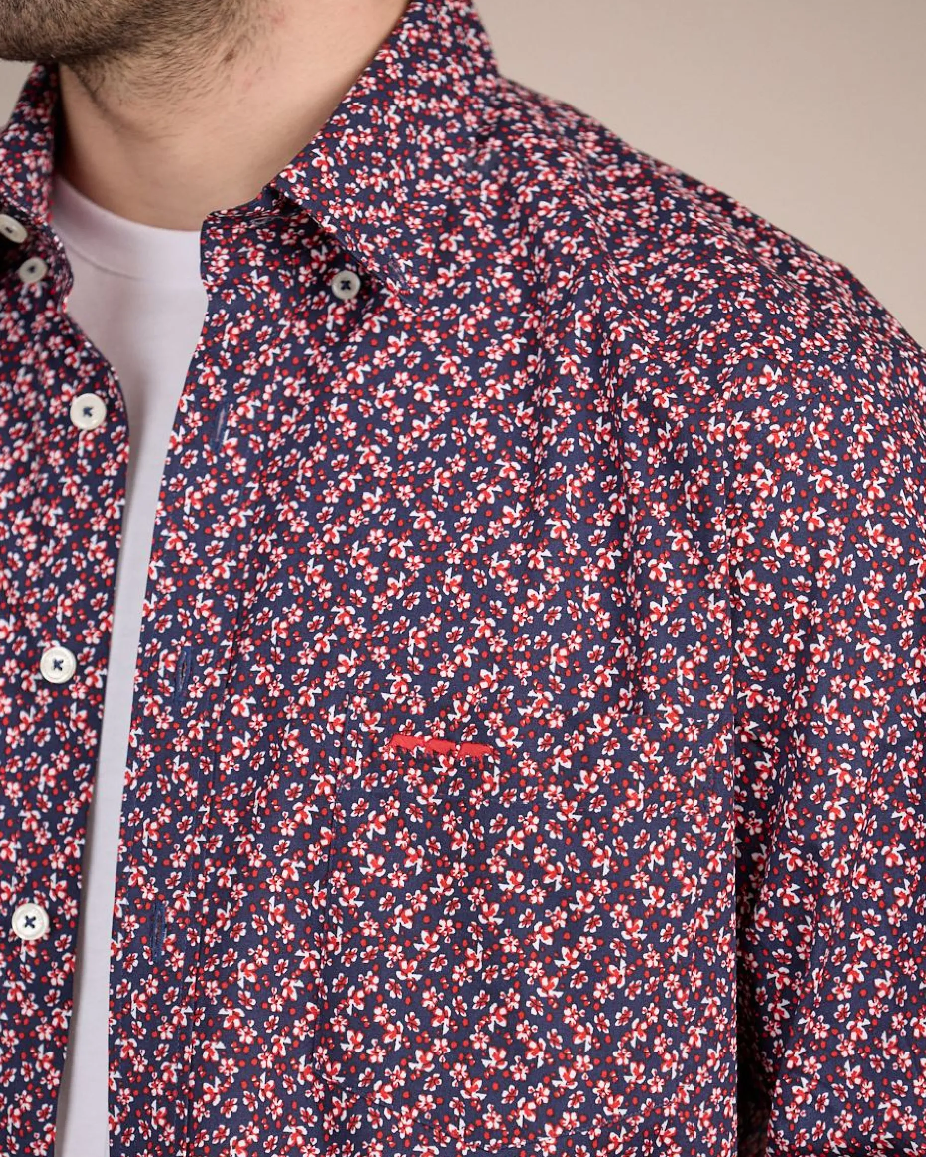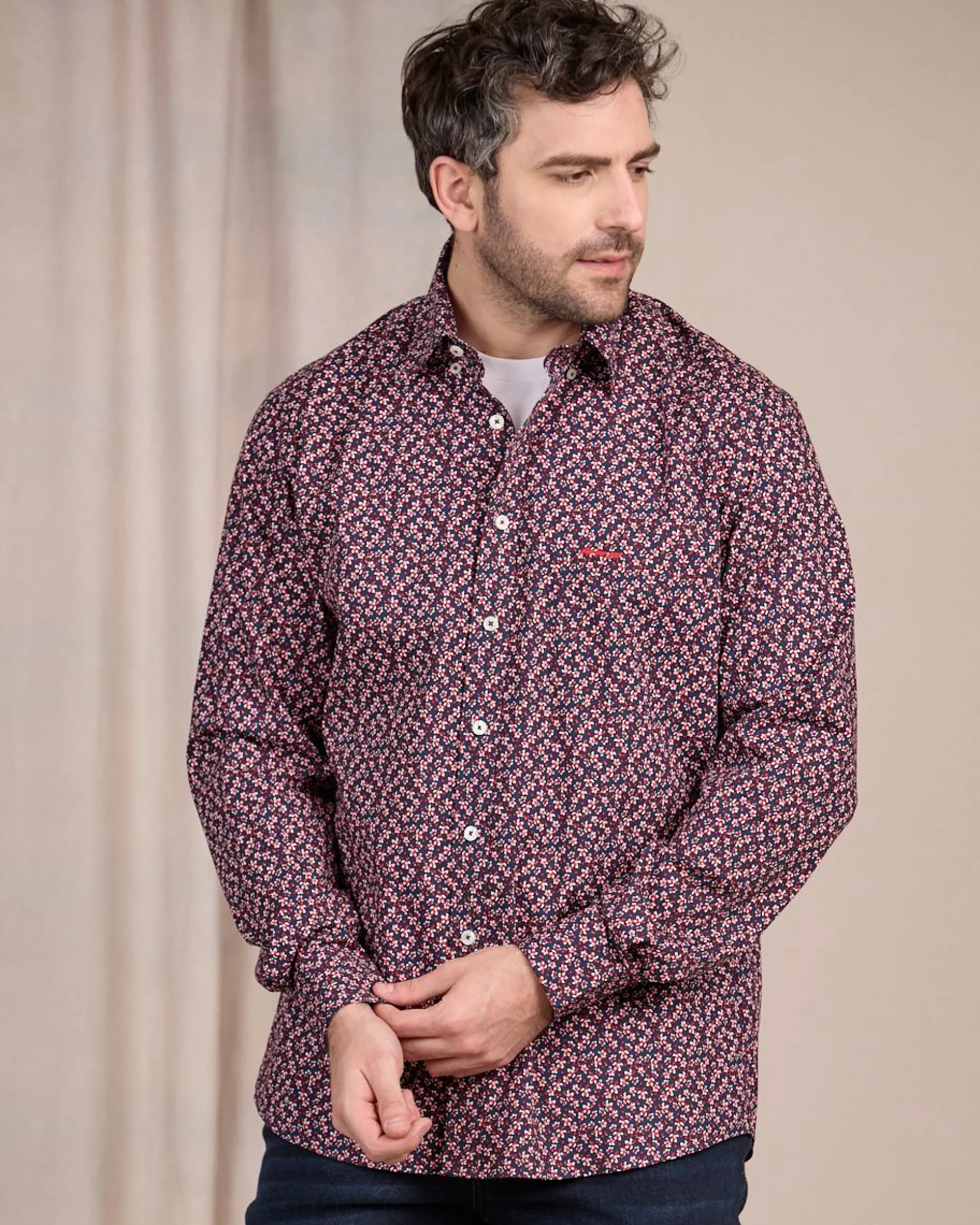 Soulignez votre allure avec chic avec cette chemise à manches longues. Rehaussé d’un élégant imprimé floral et d’un coloris bleu marine, ce modèle sort du lot ! Sa matière en coton garantit un confort optimal au quotidien. Associez-le avec un jean pour un look frais et chic ! Une poche poitrine et le logo emblématique Mise au Green « 3 vaches » apportent la touche finale.