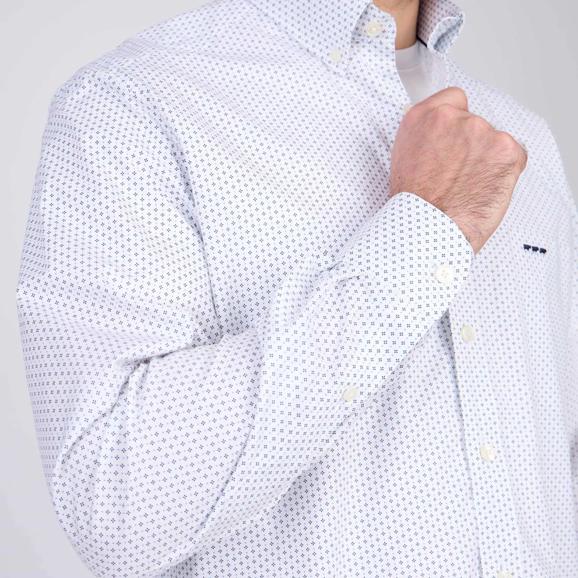 Envie de vous démarquer avec une tenue soignée ? Chic et agréable à porter, cette chemise à manches longues est confectionnée en coton avec de l’élasthanne. Polyvalente, elle convient aussi bien à des occasions formelles que décontractées grâce à son coloris blanc et ses micro-motifs raffinés. Ce modèle affiche un col à pointes boutonnées ainsi qu’une broderie « 3 vaches » sur la poitrine.