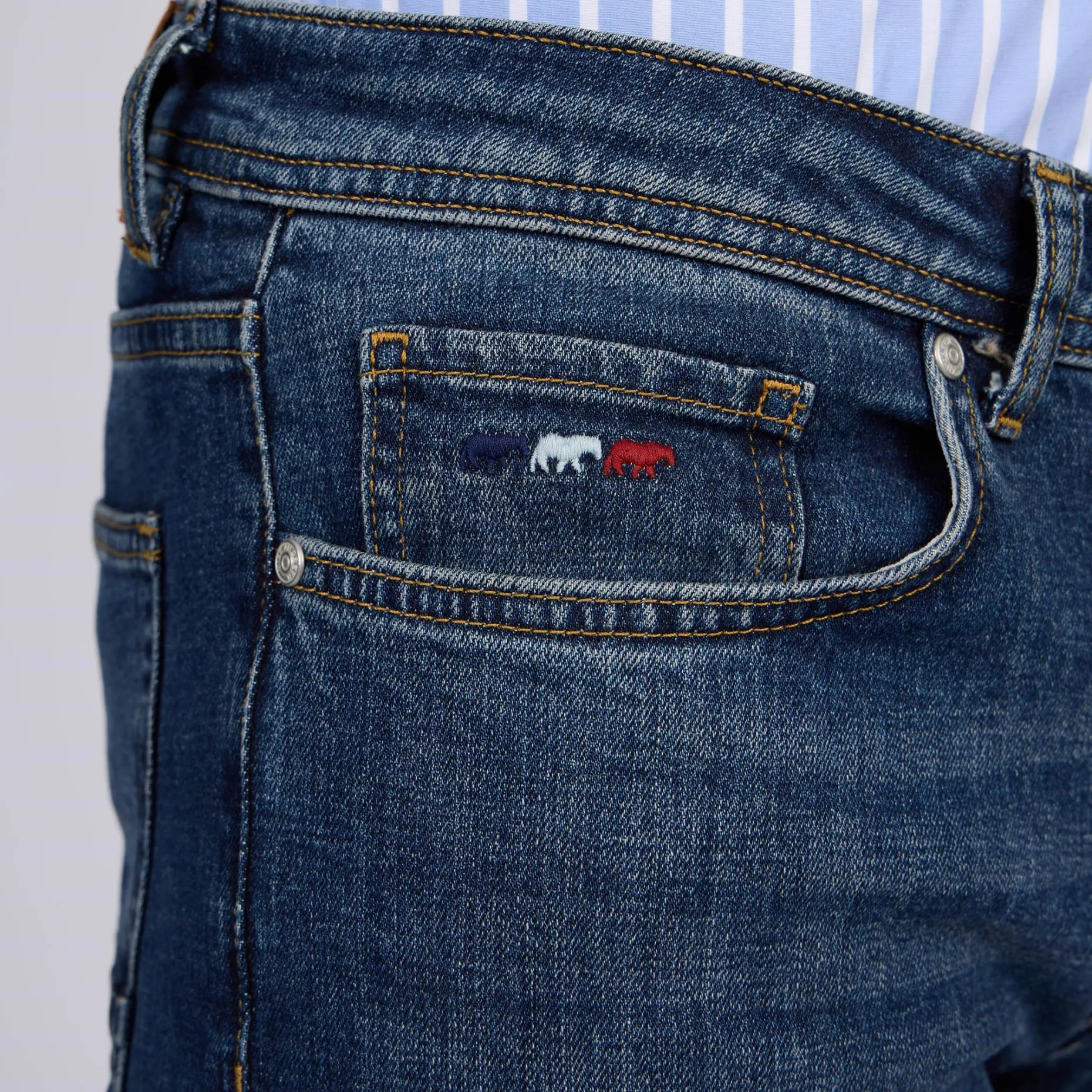 Au quotidien, ce jean bleu médium sera votre meilleur allié ! Son design résolument moderne est sublimé par un léger délavage, cinq poches et une coupe ajustée qui flatte la silhouette en toute simplicité. Pour plus de souplesse et de confort, il est confectionné dans un mélange de coton et élasthanne. Un logo brodé 3 vaches au niveau des poches ainsi qu’un jacron Mise au Green signent cette pièce intemporelle. Associez-la avec n’importe quel haut de votre vestiaire pour une allure dans l’air du temps.