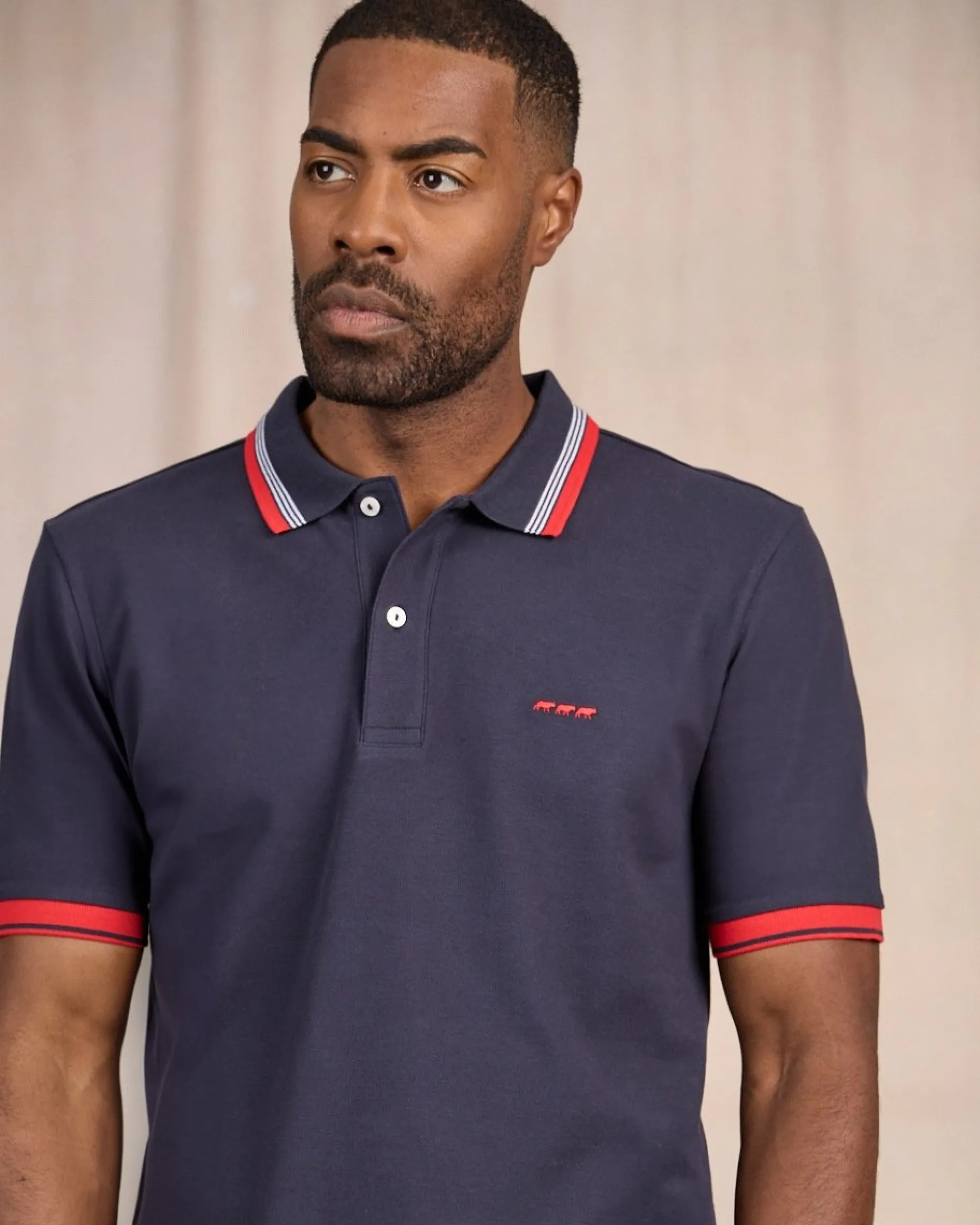 Ce polo à manches courtes est parfait pour être à l’aise toute la journée. Réalisé en coton, il procure un confort optimal et vous suit partout. Optez pour son coloris bleu marine qui ajoute du dynamisme à votre allure et met en valeur votre silhouette. Naturellement élégant, ce modèle comporte des détails rayés contrastés, un col en bord côtelé et une broderie « 3 vaches » sur la poitrine. Associez-le avec un chino ou un jean pour un look simple et efficace !