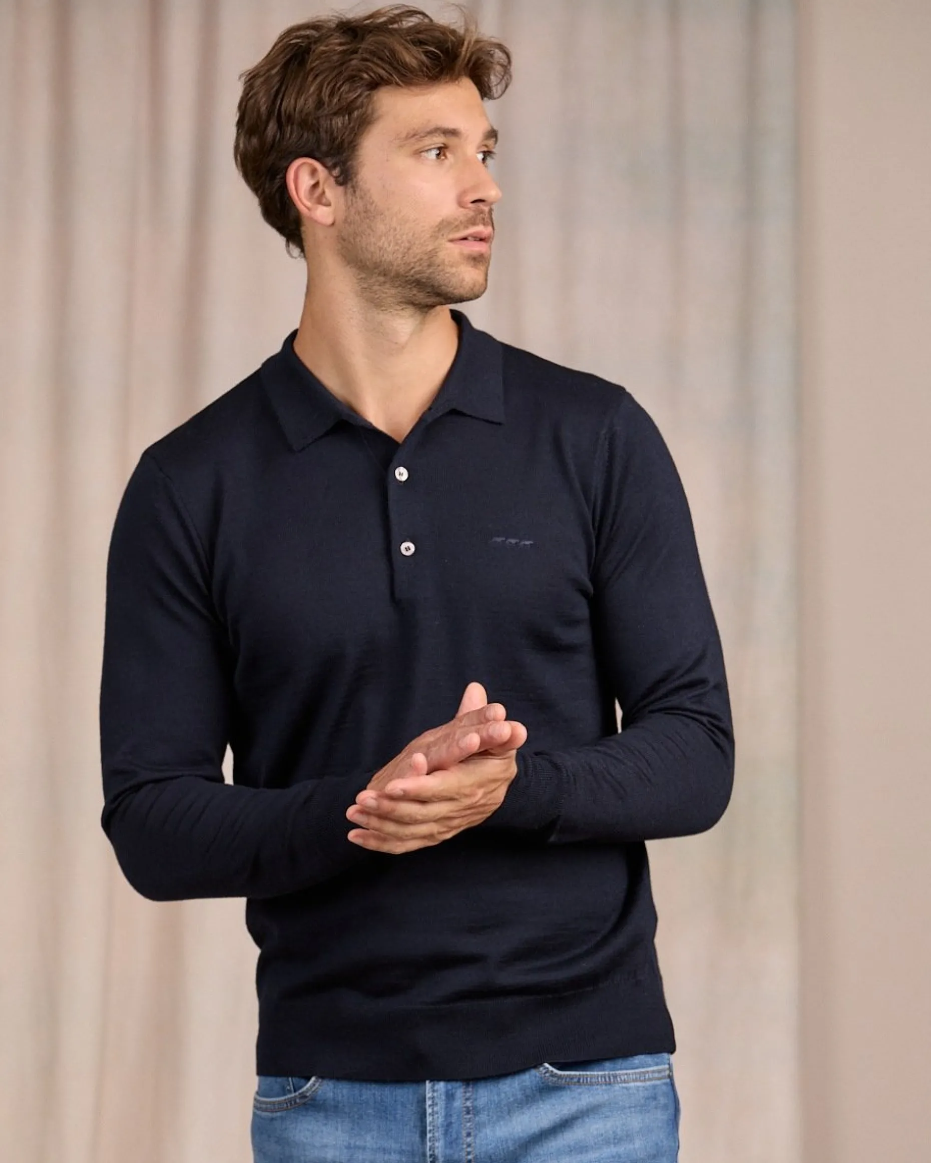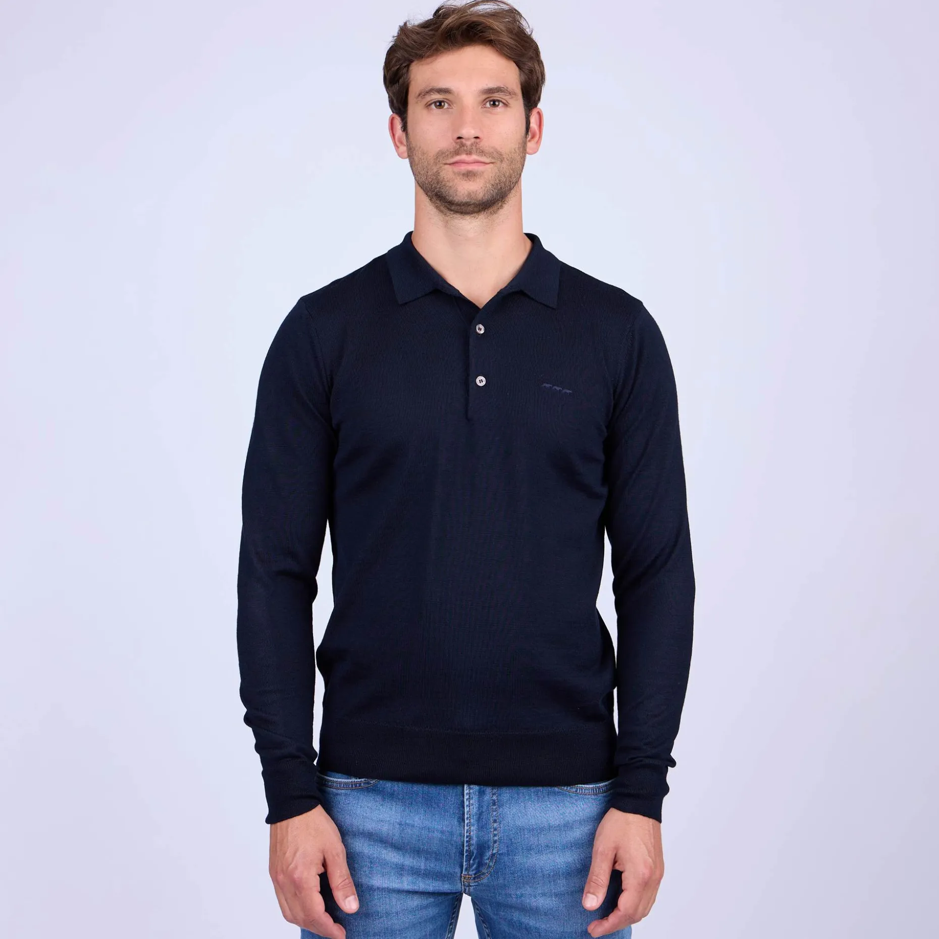 Adepte de l’élégance, de la simplicité et du bon goût, adoptez ce pull à manches longues ! Confectionné dans un mélange de laine mérinos et d’acrylique, ce modèle procure un confort optimal. Il se démarque par son coloris bleu marine et son col polo, un détail qui ajoute une touche de raffinement à n’importe quelle tenue. Une patte de boutonnage, des bord côtelés et un logo emblématique « 3 vaches » ton sur ton agrémentent l’ensemble. Vous n’aurez plus envie de le quitter !
