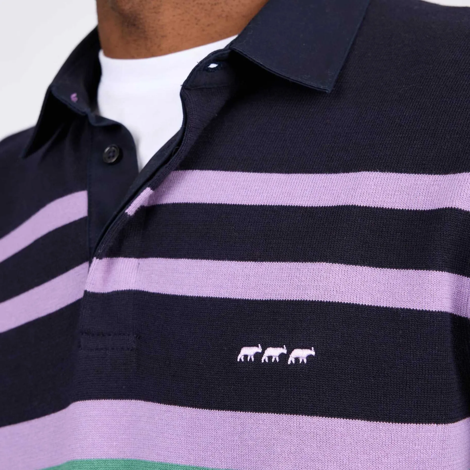 Chic et décontracté, ce pull pour homme à manches longues vous séduira à coup sûr ! Ce modèle bleu marine est doté de rayures et se porte seul ou par-dessus un tee-shirt. Les détails qui font la différence ? Le col polo et les finitions côtelées. Très confortable, il est conçu entièrement en coton. Une broderie « 3 vaches » signe ce modèle tendance et stylé.
