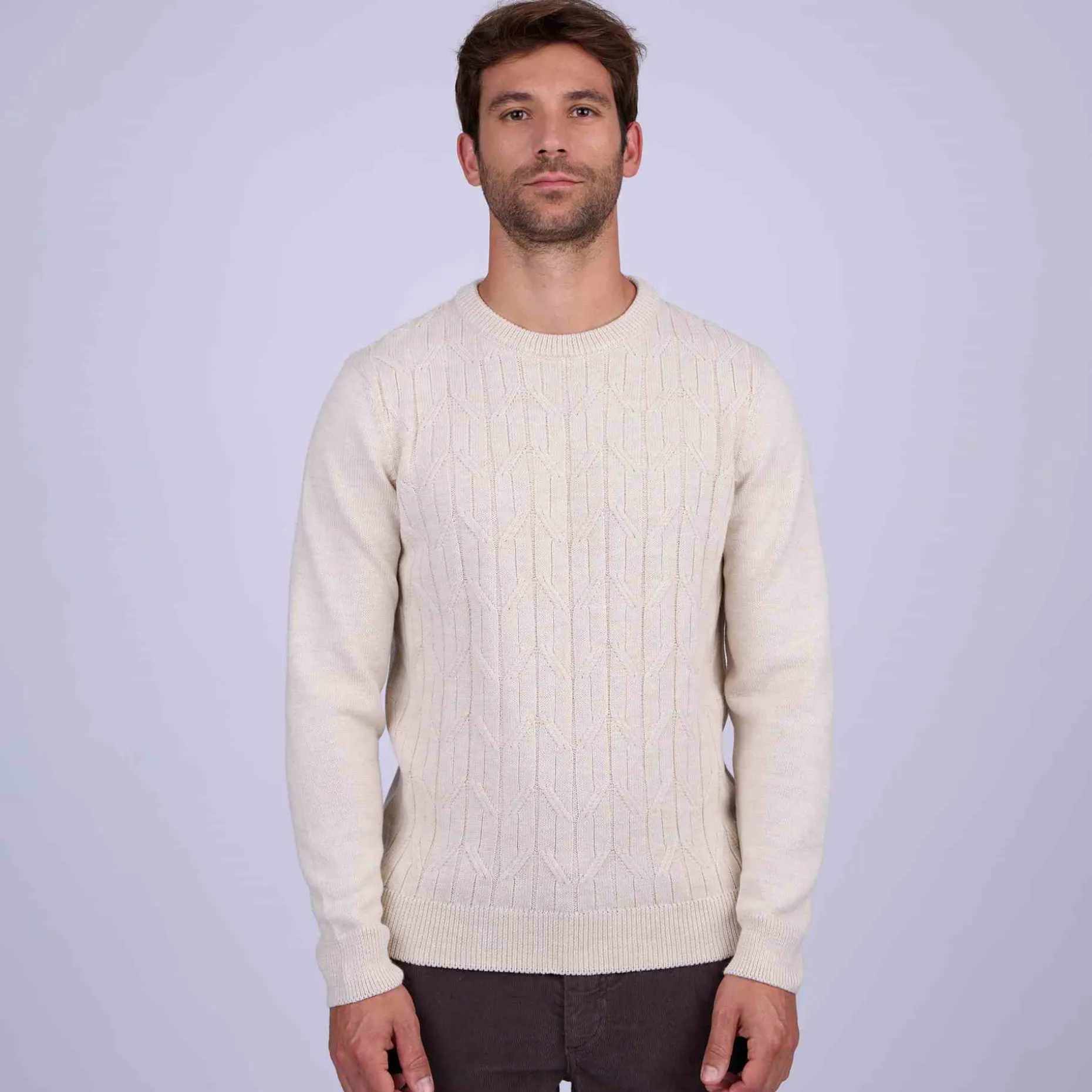 Idéal pour un style soigné, ce pull à col rond est une pièce de choix à posséder dans son vestiaire ! Ce modèle en laine mérinos et acrylique est confortable, robuste et respirant. Réalisé en maille torsadée, il possède une texture prononcée qui fait toute la différence. Des détails côtelés bordent le bas, les poignets et le col. Son coloris beige clair convient aussi bien pour une tenue urbaine chic qu’un look décontracté !