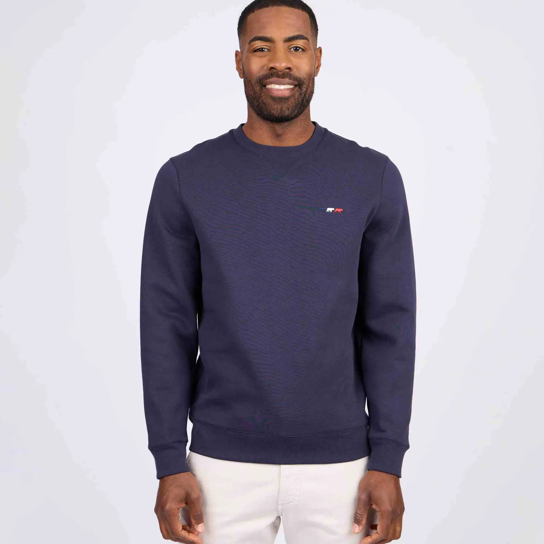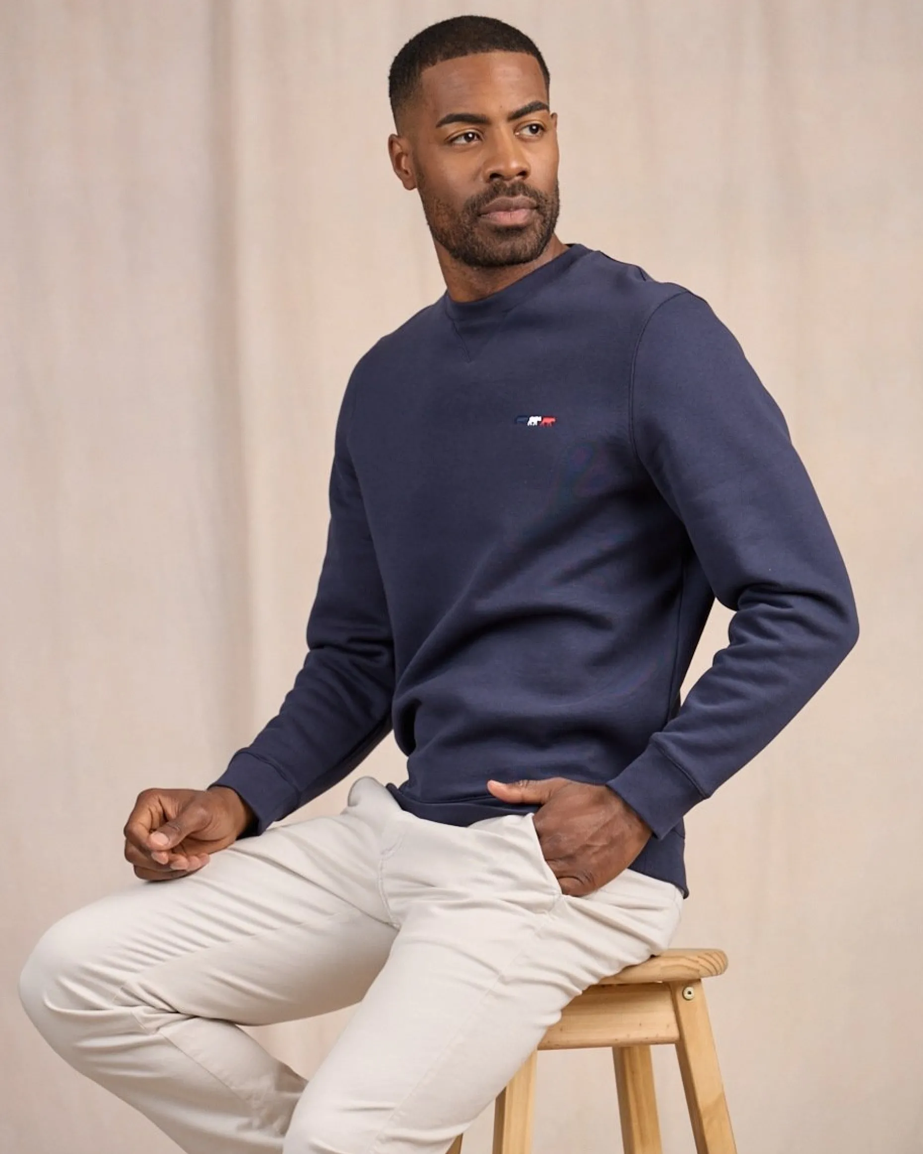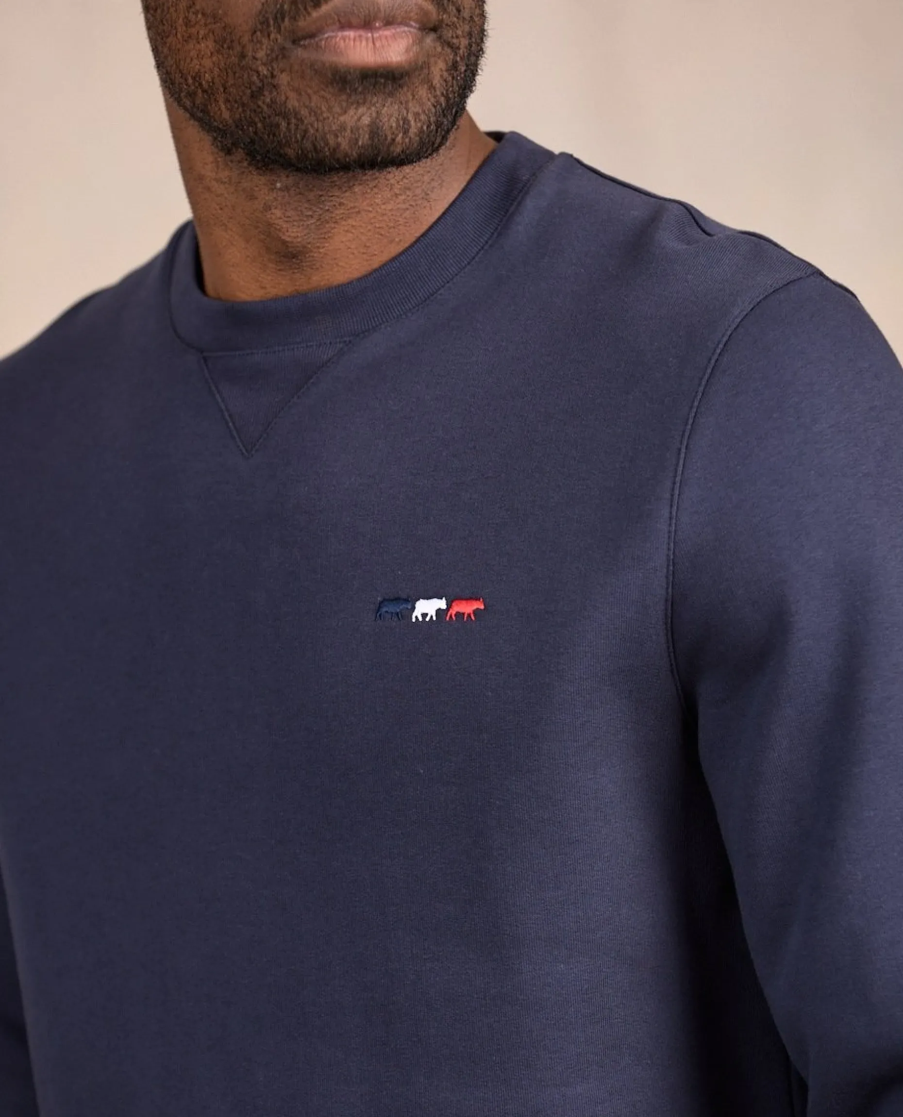 Style, confort et simplicité sont au rendez-vous avec ce pull pour homme à manches longues ! Ce modèle uni au coloris bleu marine se démarque par son col rond et sa couture en triangle sur le devant. Des finitions côtelées et une broderie contrastée « 3 vaches » sur la poitrine parachèvent cet essentiel. Mélange de coton et de polyester, il garantit votre confort tout au long de la journée. Portez-le avec un chino pour un style moderne et élégant !
