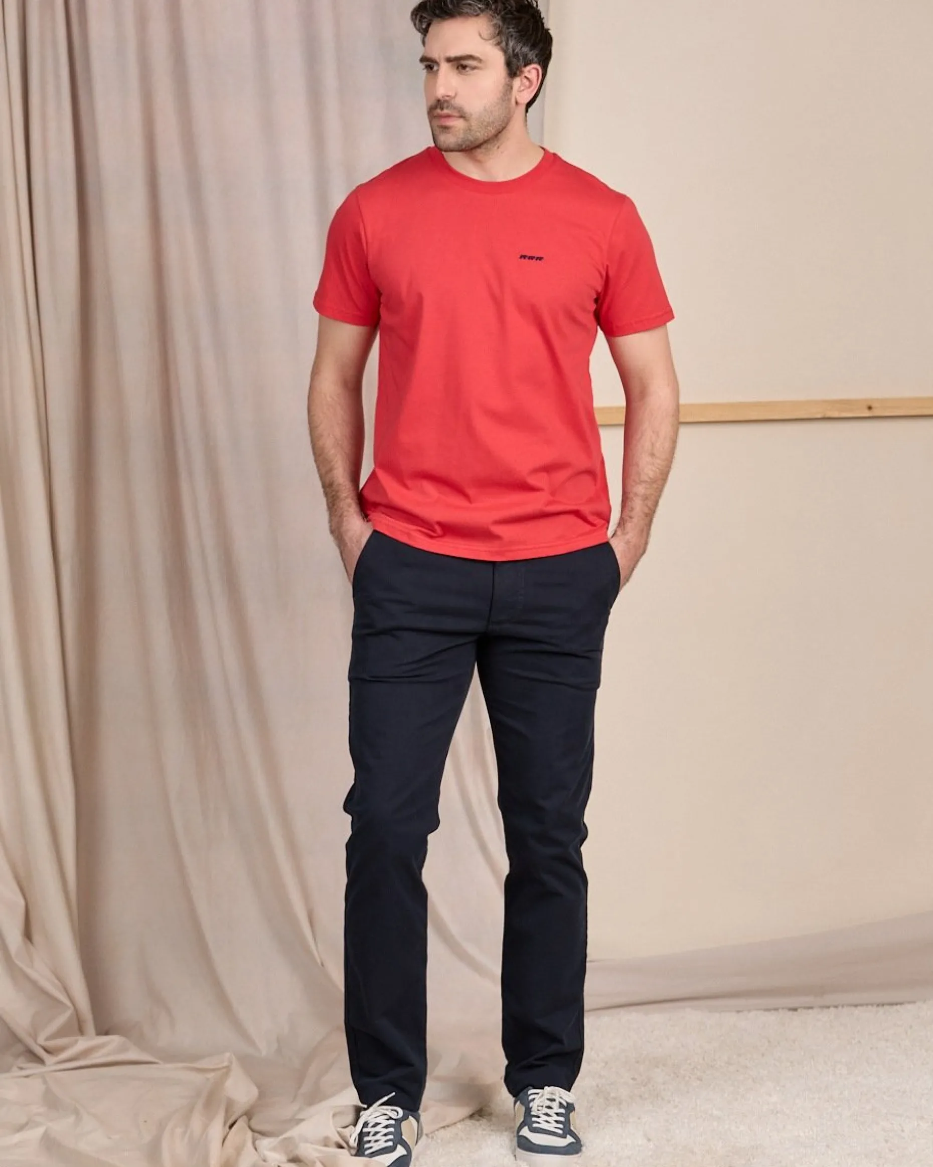 Soyez à l’aise toute la journée avec ce tee-shirt pour homme à manches courtes. Avec son coloris rouge uni, son col rond et sa coupe droite, ce modèle convient à tous les styles et morphologies. Confectionné intégralement en coton, il garantit douceur et respirabilité. Le détail qui change tout ? Sa petite broderie « 3 vaches » contrastée. Cet essentiel facile à vivre se porte seul ou sous un gilet de notre collection pour un style à la fois élégant et décontracté !