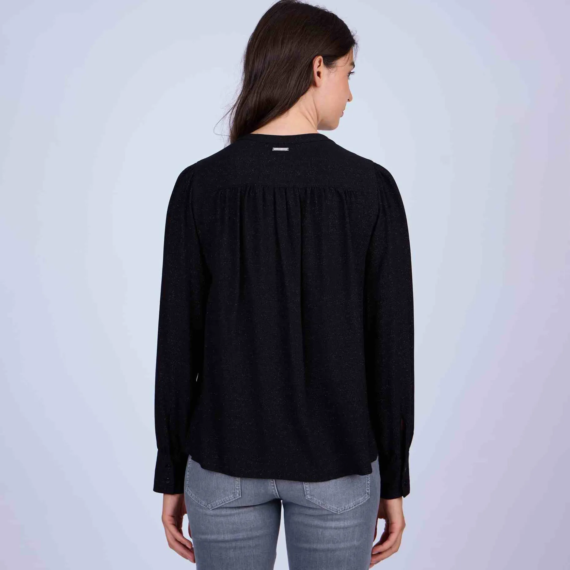 Démarquez-vous avec style avec ce chemisier pour femme à manches longues ! Il trouve son originalité dans ses détails froncés au niveau de l’encolure et son effet brillant. Un col V, une fermeture boutonnée et une plaquette Mise au Green soulignent son design exclusif. Fabriquée en viscose, cette pièce offre un confort optimal et un porter fluide. Avec son coloris noir, il vous sera facile de l’associer à toutes vos tenues.