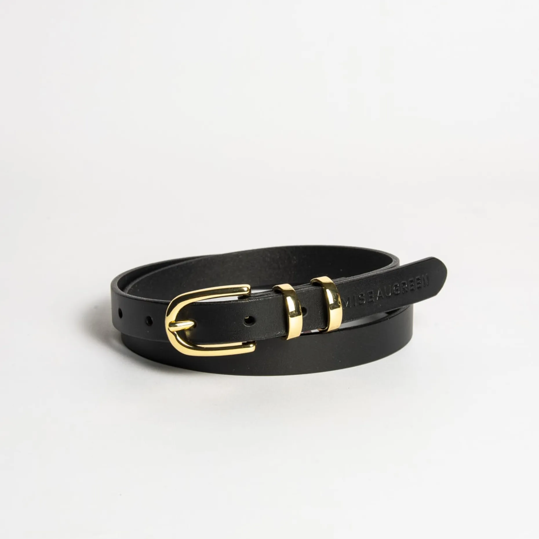 Chic et intemporelle, cette ceinture fine noire est l’accessoire incontournable de votre garde-robe ! Véritable bijou, elle est sublimée par une boucle dorée et une inscription Mise au Green. Confectionné en cuir, ce modèle polyvalent se porte aussi bien avec un jean qu’une robe pour souligner votre taille. Misez sur son design élégant et épuré pour compléter toutes vos tenues.