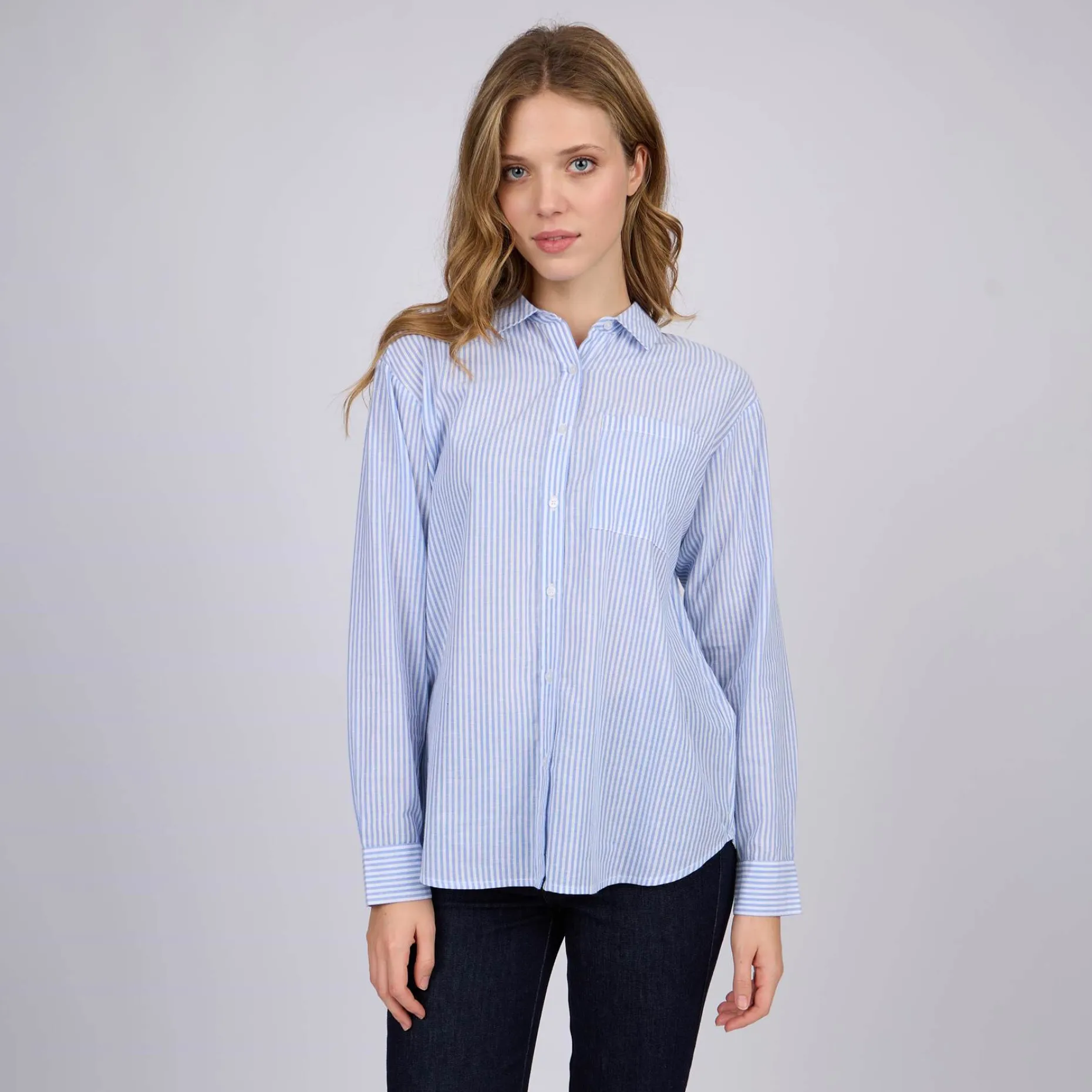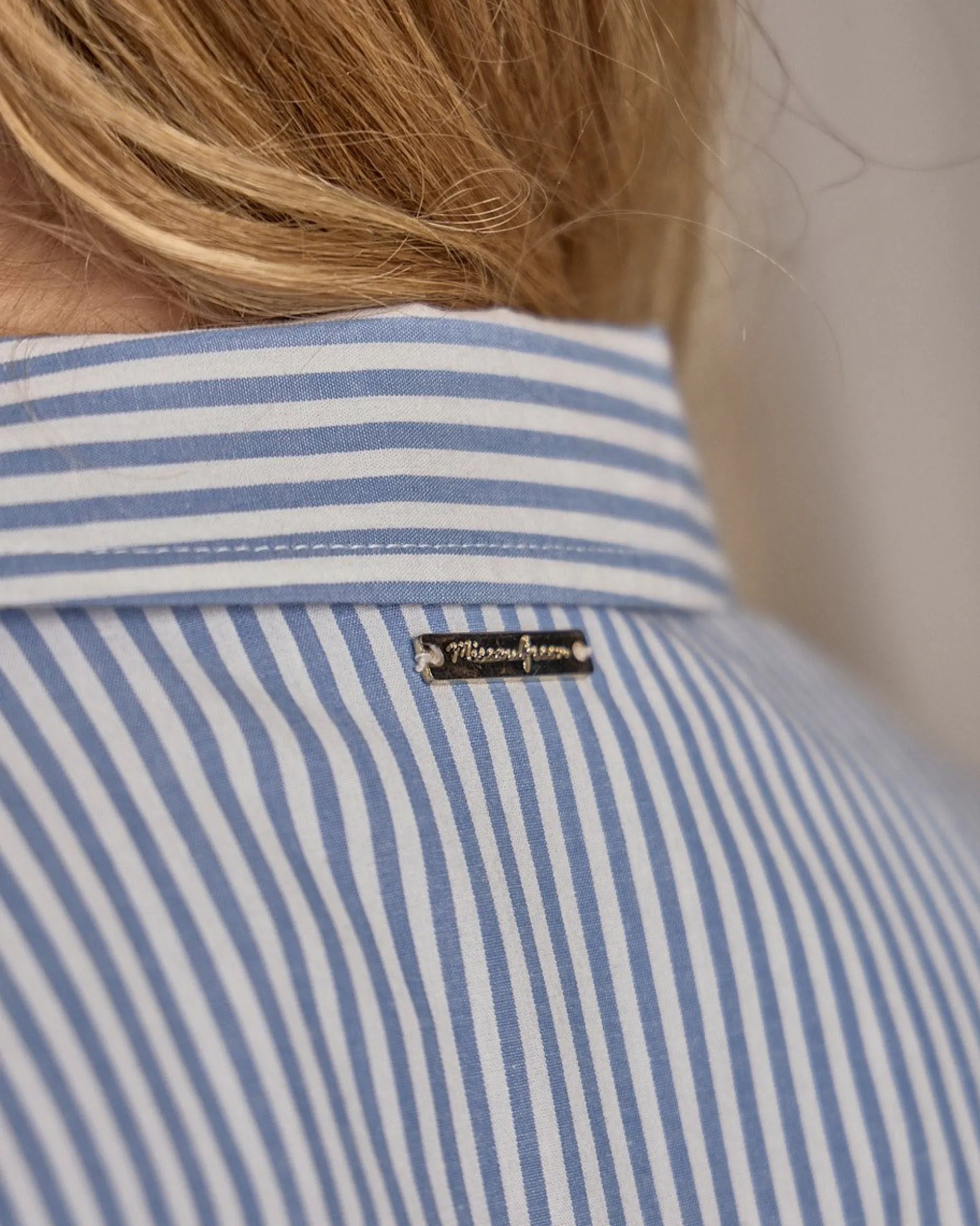 Mise au Green revisite la chemise à rayures dans une version féminine ultra tendance. Ce modèle bleu ciel affiche une poche sur la poitrine, des poignets boutonnés et un pli au creux du dos. Portez ce haut chic avec une jupe ou un pantalon selon vos envies ! La touche finale : ses boutons effet nacré et sa petite plaquette dorée à l’arrière.