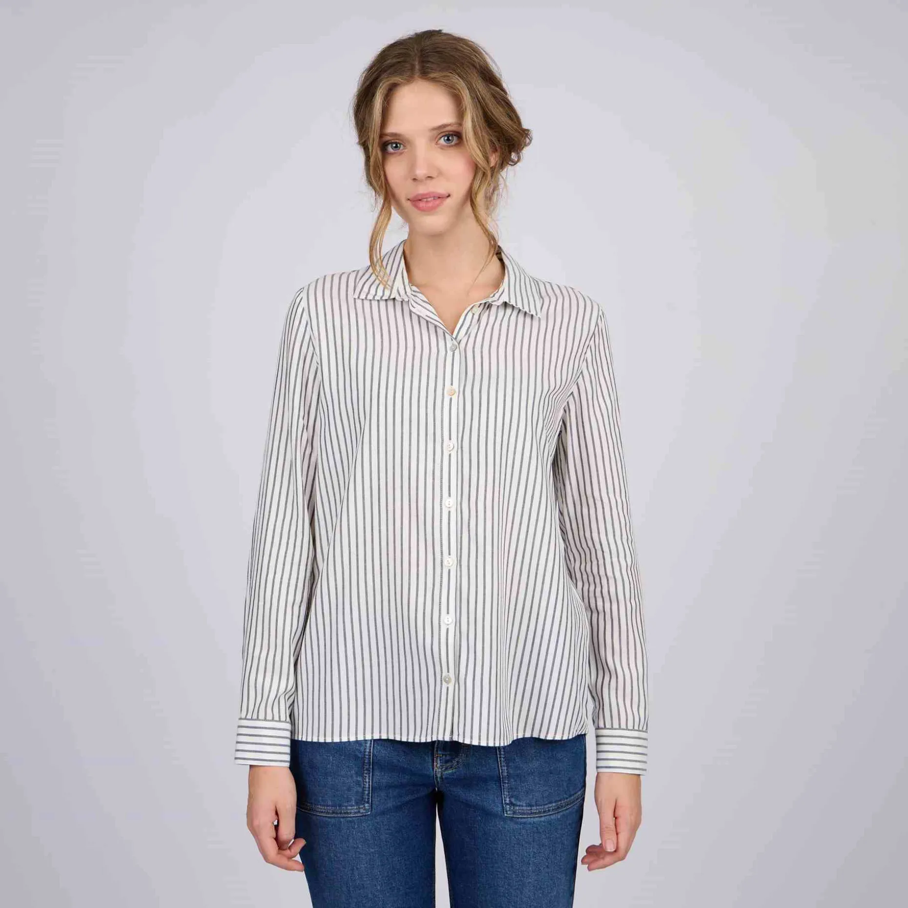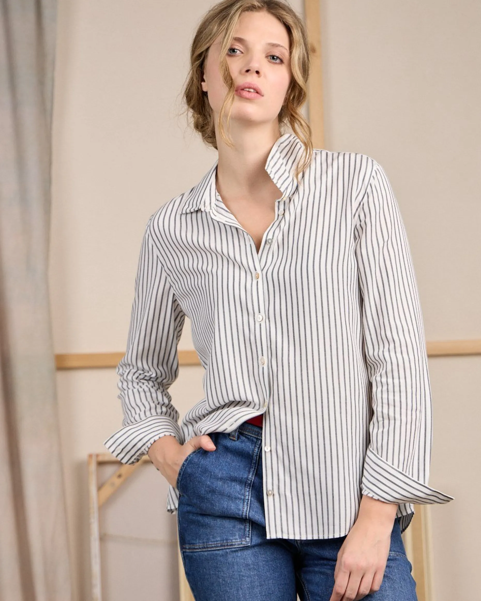 Avec son allure sophistiquée et versatile, cette chemise à manches longues est un classique indémodable ! Elle est dotée d’un imprimé à rayures bleu marine qui se coordonne facilement avec n’importe quel pantalon. Pour un supplément de style, elle est complétée par une fermeture boutonnée et une petite plaquette Mise au Green à l’arrière. Une pièce en viscose parfaite pour les journées où l’on cherche à allier chic et simplicité !
