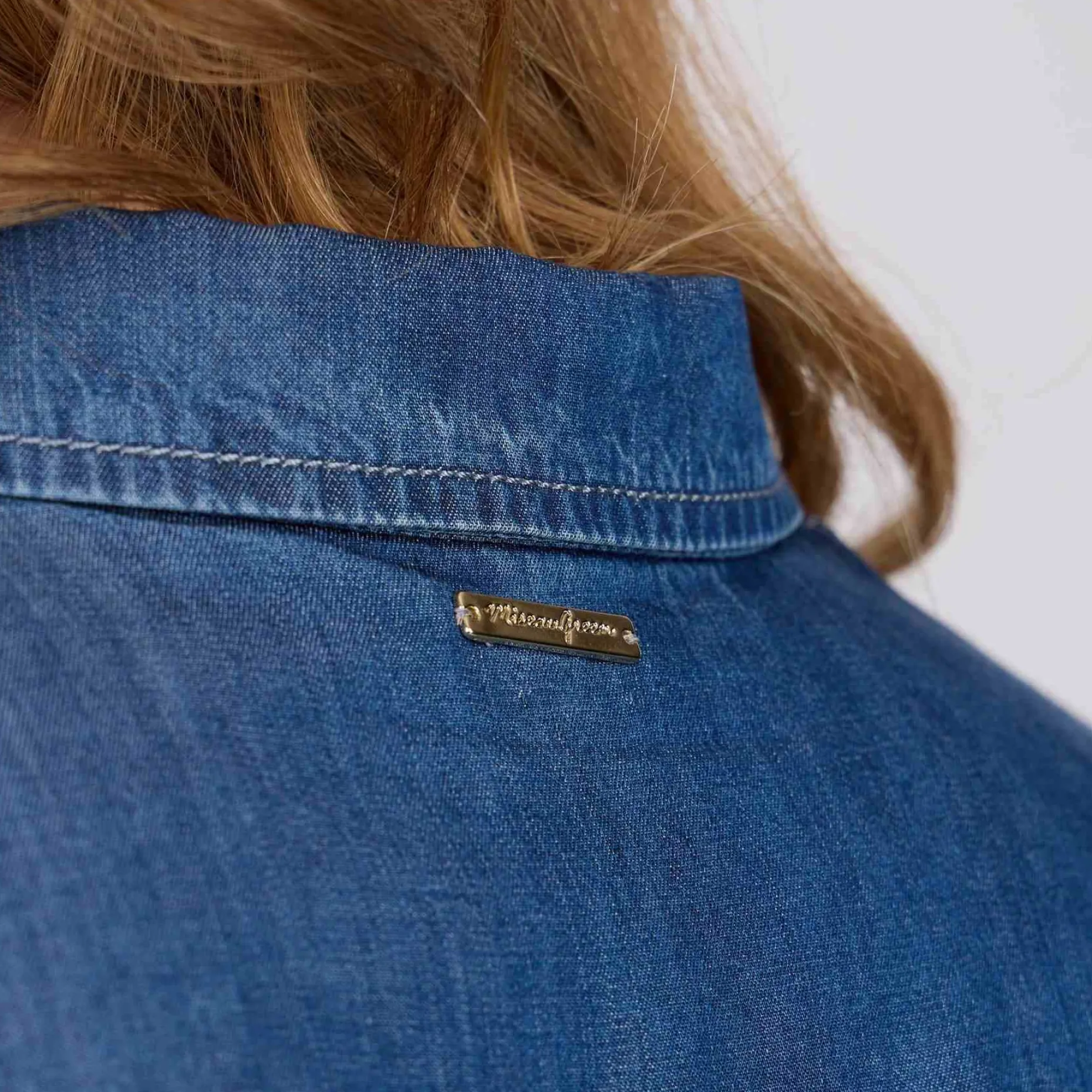 Ce chemisier présente un design élégant dont vous ne pourrez plus vous passer. Il se distingue par ses boutons métalliques contrastés et ses deux poches sur la poitrine. Le détail qui fait la différence ? Sa teinte bleu moyen qui offre de jolis reflets et illumine votre tenue. Portez cette pièce rentrée dans un pantalon pour une allure chic et soignée.