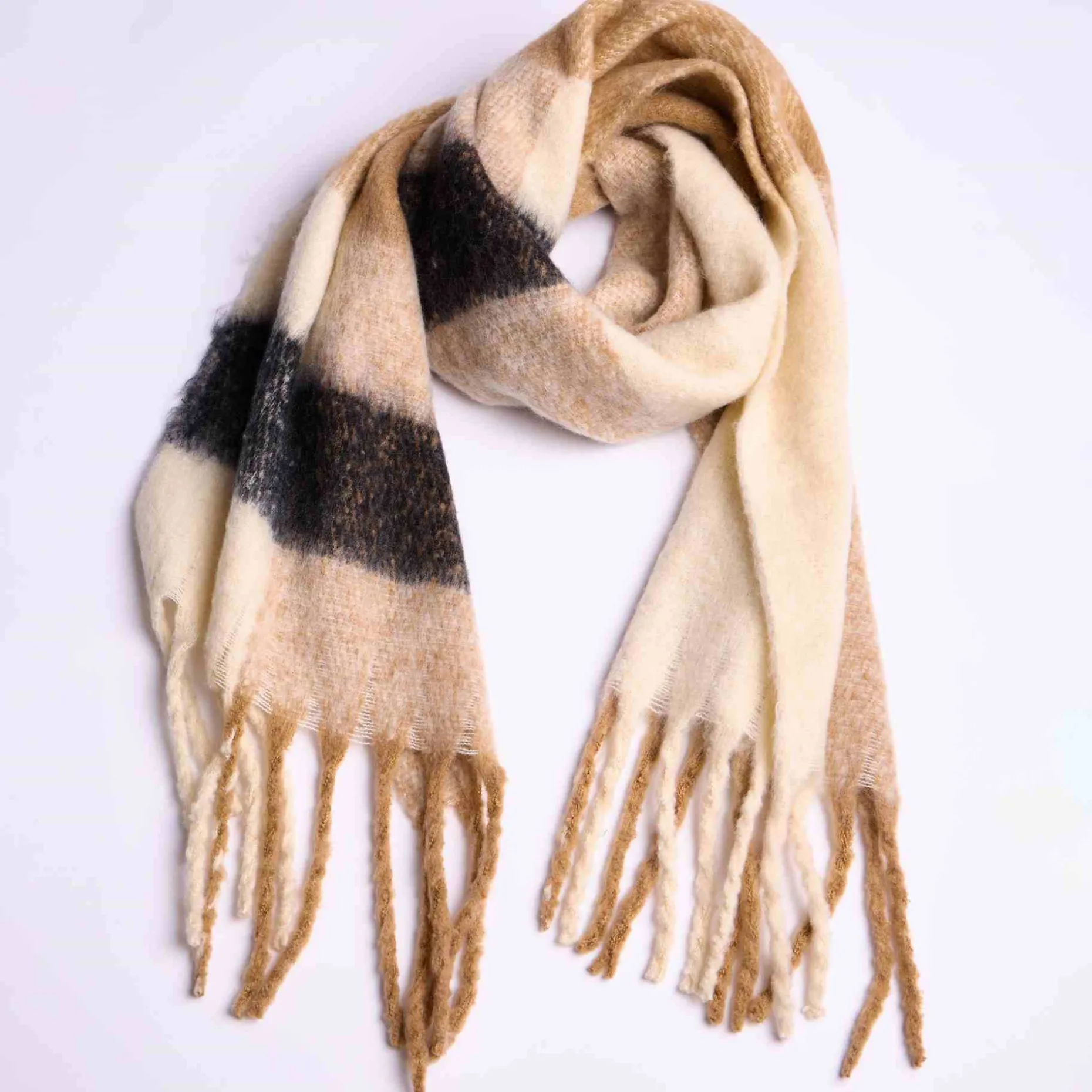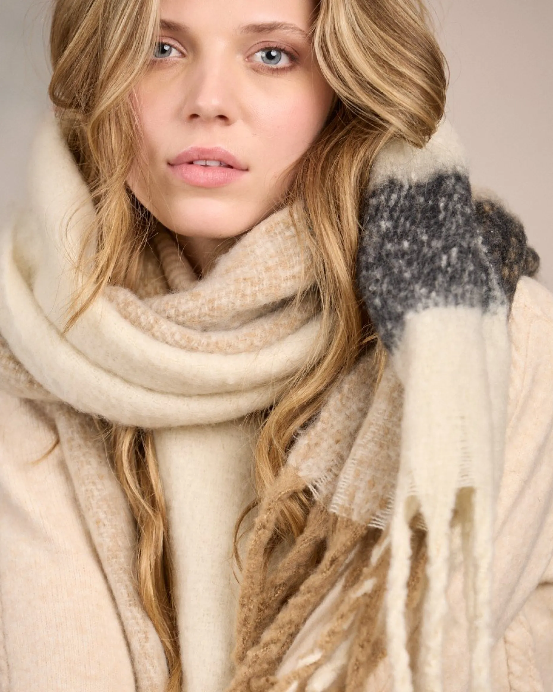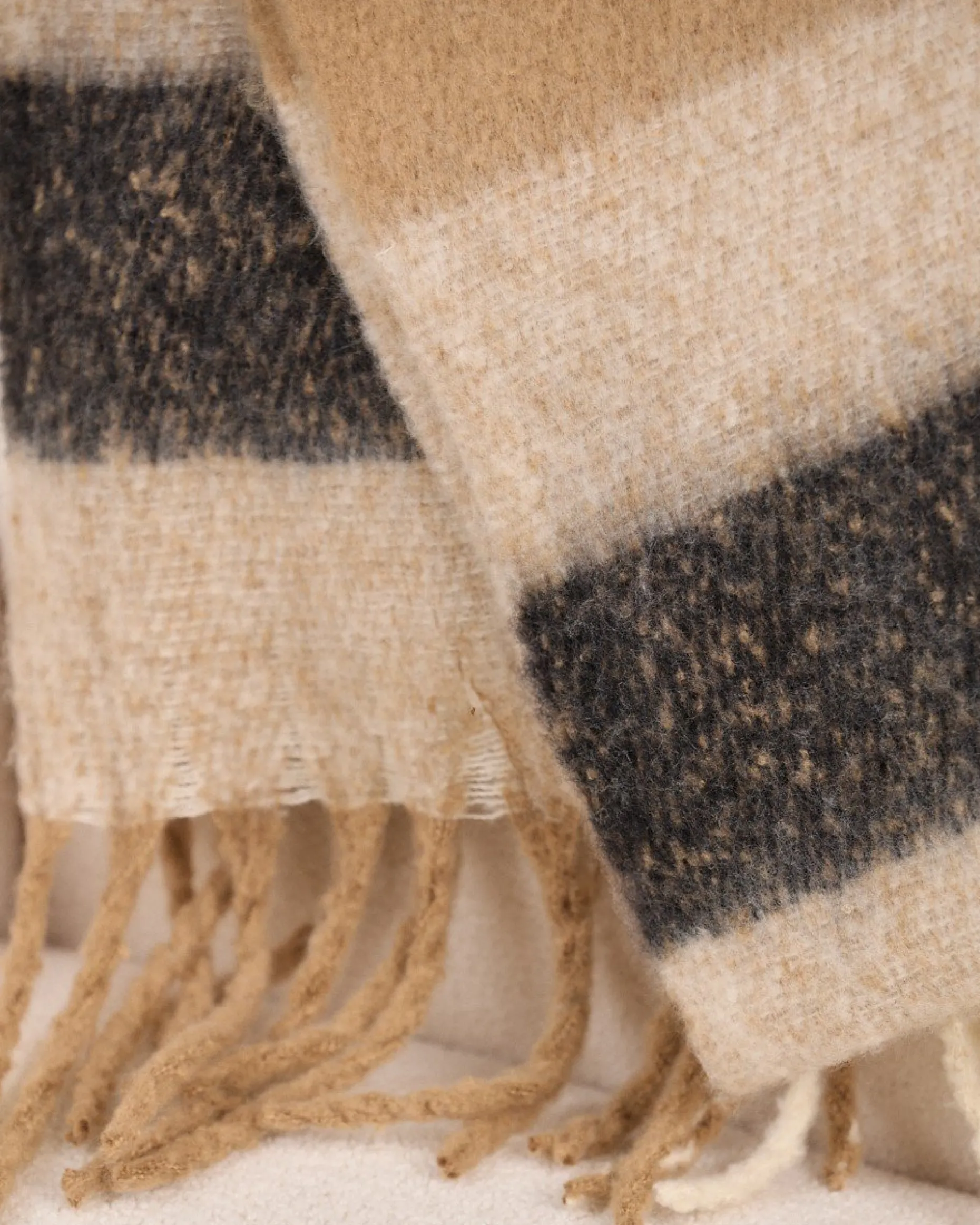 Nouvelle écharpe en vue ! Vous allez adorer sa maille douce en polyester recyclé et ses finitions bords frangés. Facile à porter, cet accessoire est doté de bandes de couleurs aux nuances marrons. Un allié pour la saison pour vous protéger du vent et du froid !