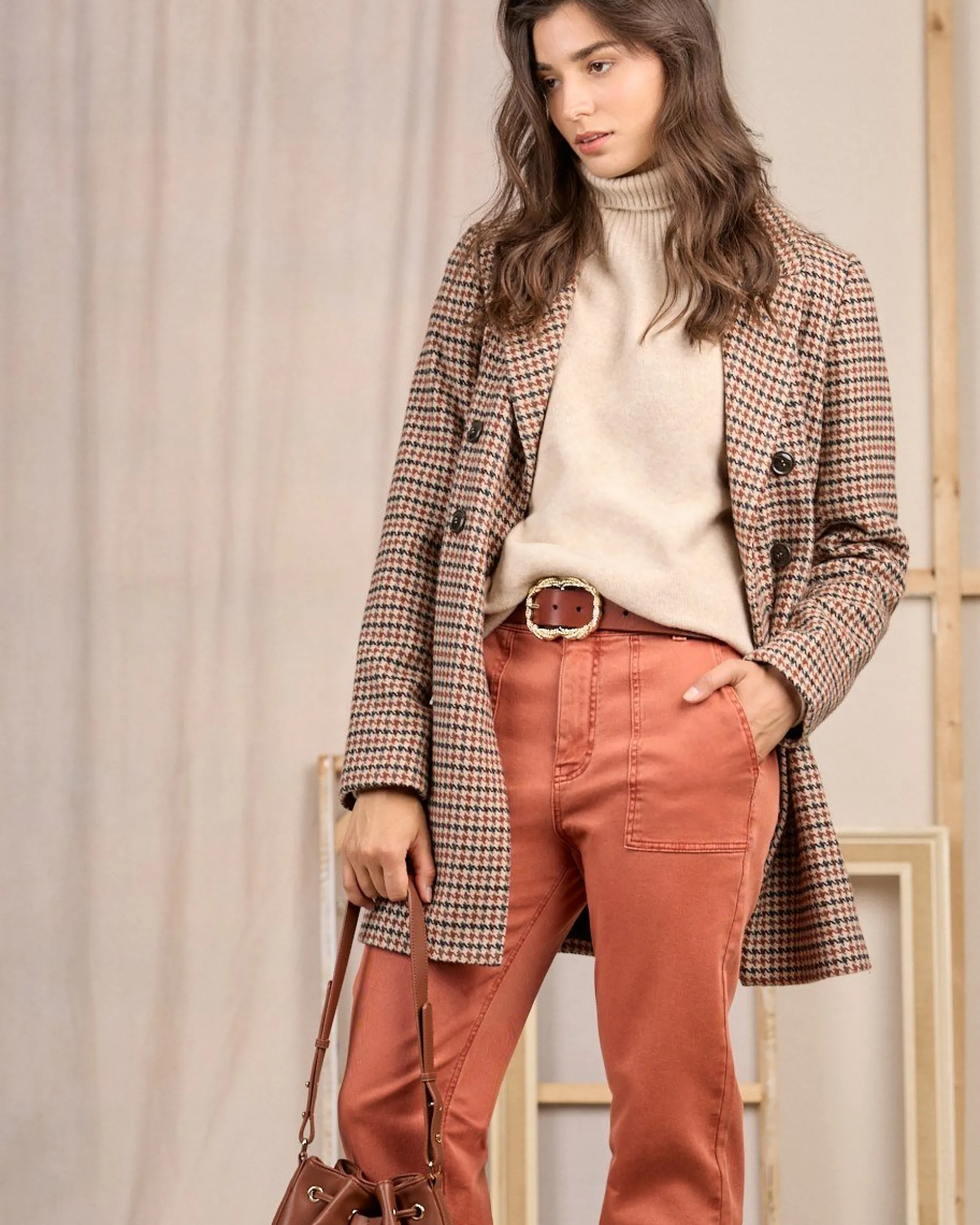 Le manteau pied-de-poule, on ne s’en lasse pas ! Mise au Green revisite ce classique avec ce modèle beige pour femme. Avec ses tons chauds, il adoucit vos looks de saison et s’associe avec toutes sortes de pièces. Délicieusement chic, il offre une longueur mi-cuisses et se ferme grâce à un double boutonnage. Des poches à rabat et un large col rabattu complètent son design raffiné. Offrant chaleur et style, il est réalisé en polyester avec une pointe de laine !