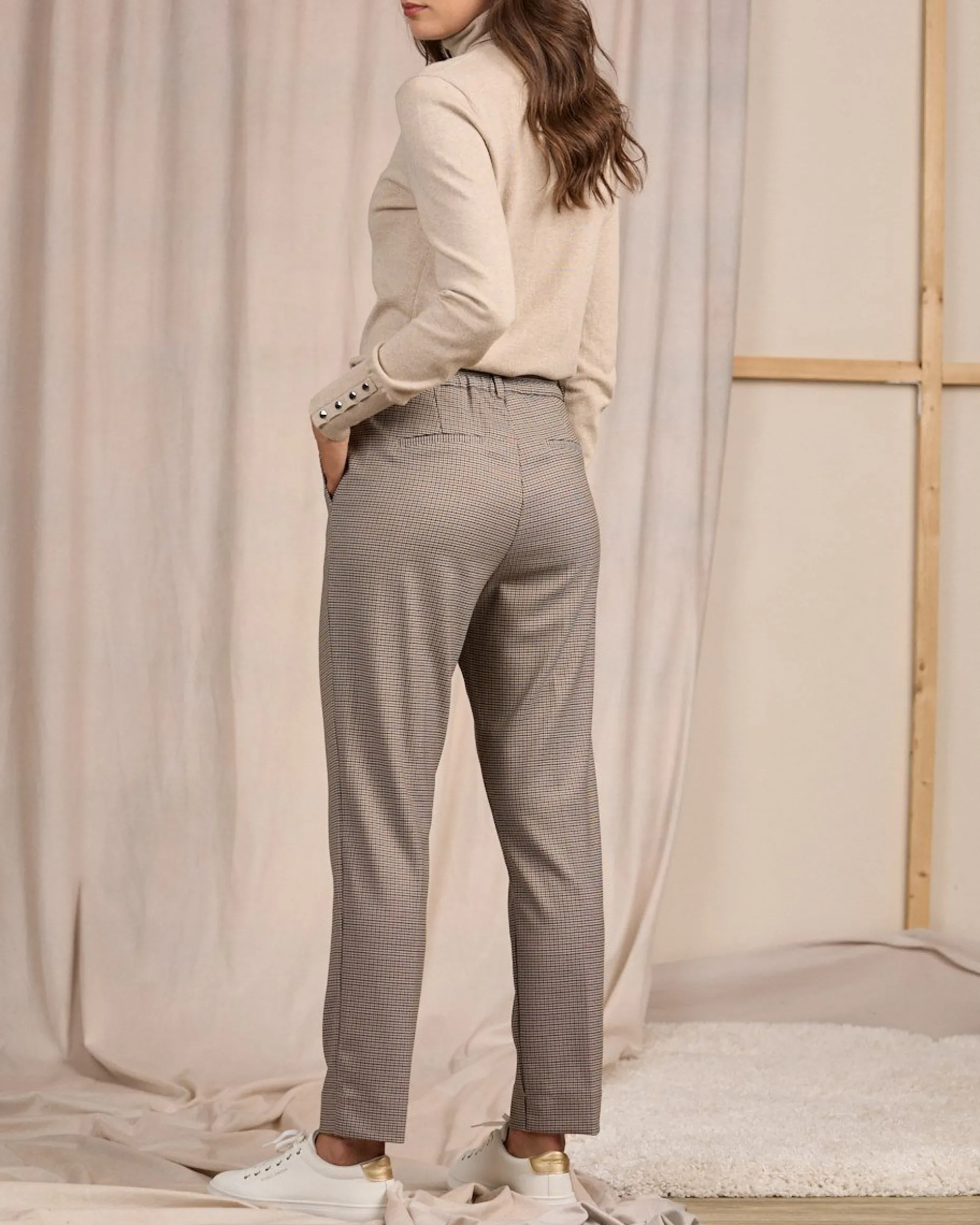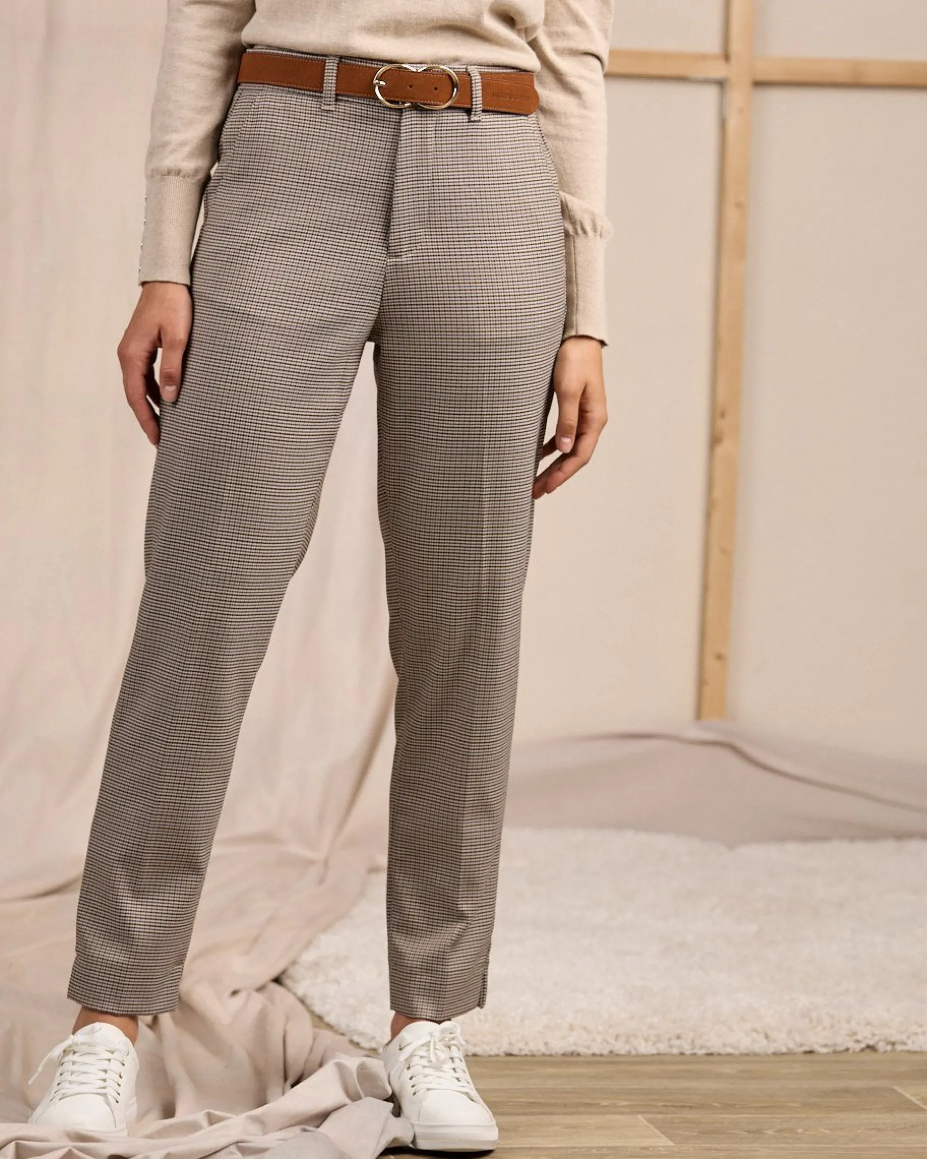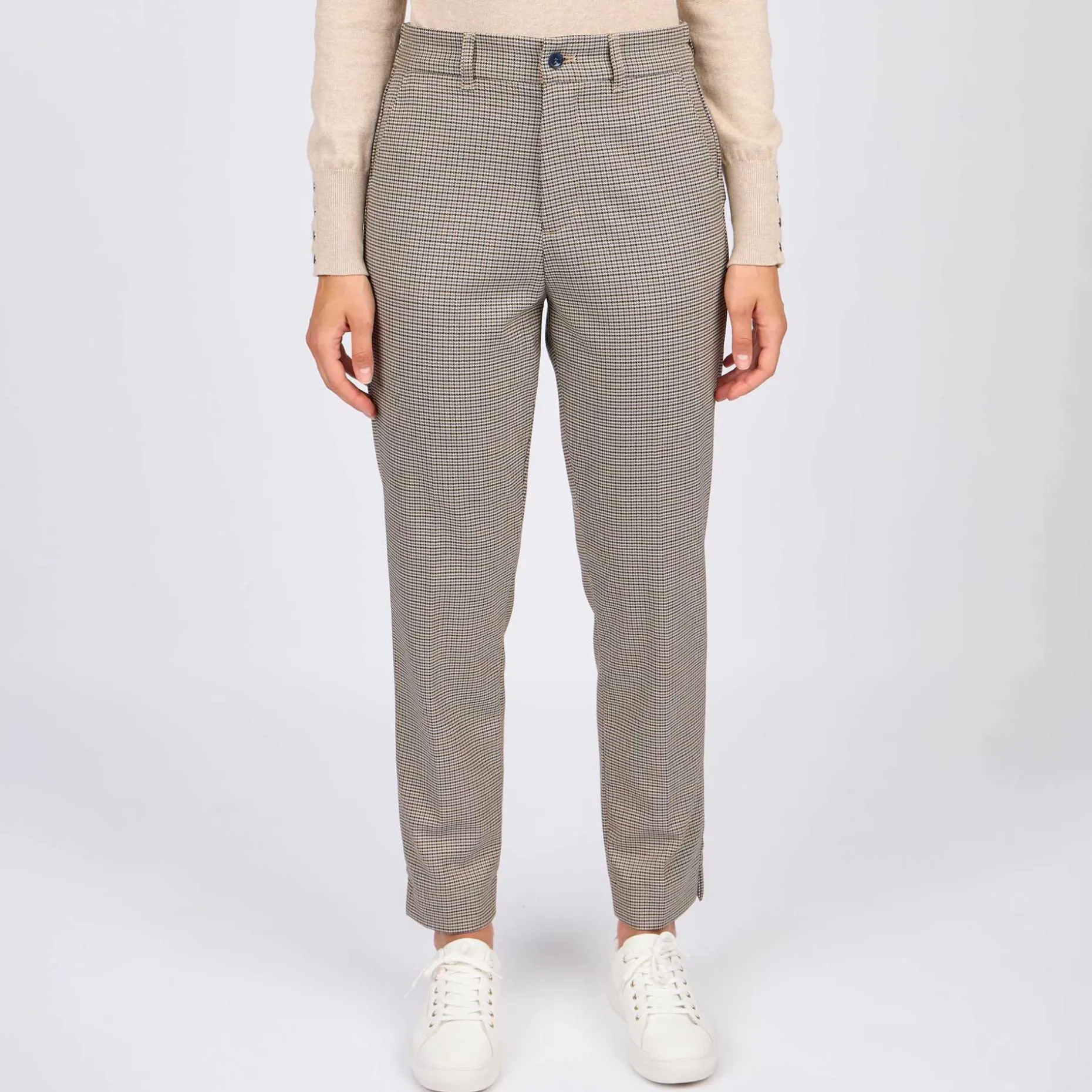 Une pièce phare que vous allez adorer ! Ce pantalon pour femme est caractérisé par une teinte beige et un motif pied-de-poule emblématique. D’un grand confort, il présente une coupe chino, une braguette zippée et boutonnée, deux poches à l’avant et de fausses poches à l’arrière. Pour aller au travail ou participer à des sorties décontractées : il habille toutes vos tenues avec élégance et sophistication !