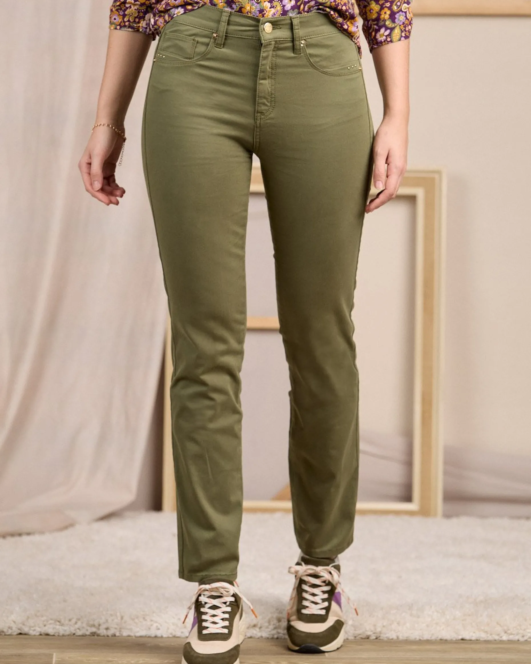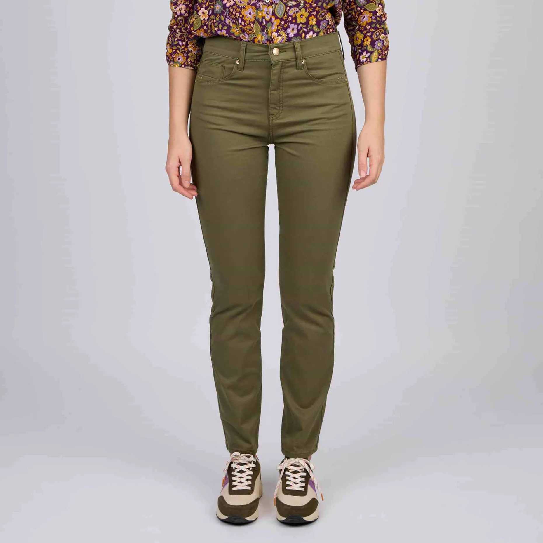 Ce pantalon 5 poches pour femme est un classique indémodable. Agréable à porter, il est orné de plusieurs poches à l’avant et à l’arrière, d’une braguette zippée avec bouton et de détails dorés. Grâce à son coloris kaki, vous pourrez créer de multiples styles. Associez-le avec un haut de notre collection Mise au Green pour une tenue impeccable !