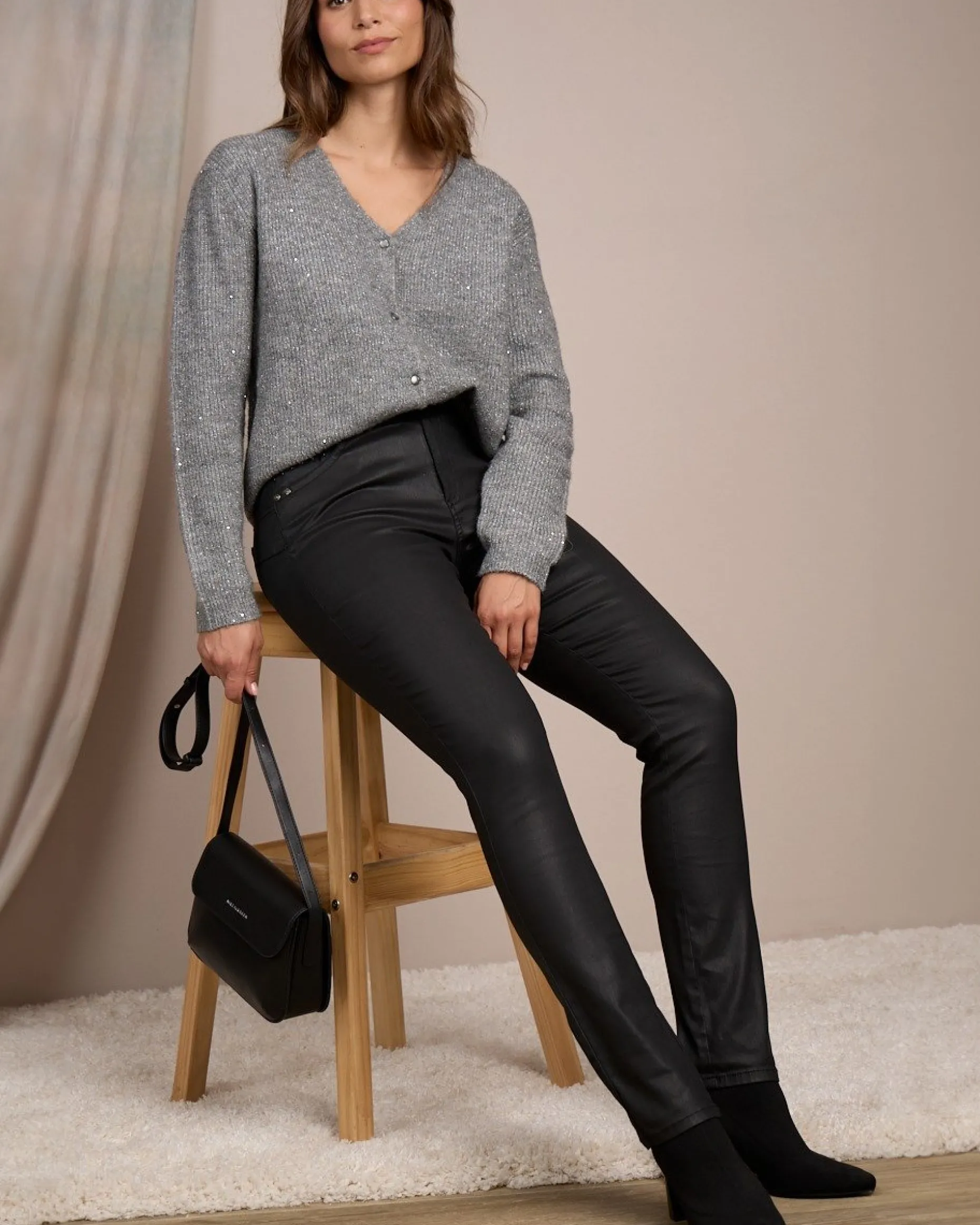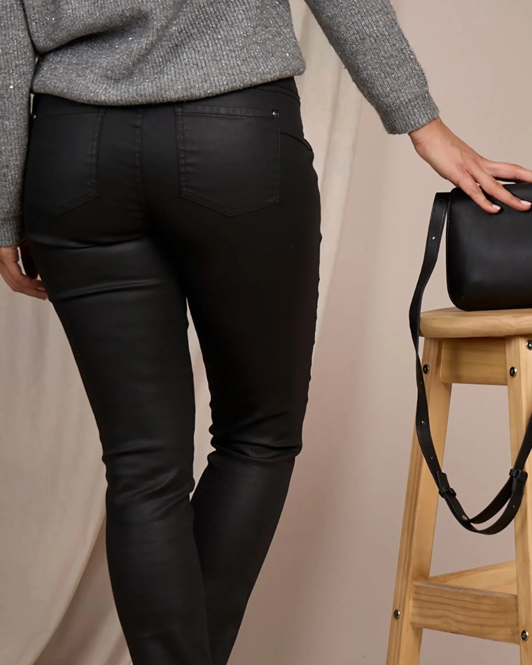 Voici un pantalon qui a du chic ! Avec son effet enduit lumineux, il est surprenant et résolument moderne. Confortable et stretch, ce modèle est réalisé en coton avec une pointe d’élasthanne pour plus d’aisance. Petit bonus : sa coupe ajustée pour marquer votre silhouette. Des détails de clous au niveau des poches et un jacron « 3 vaches » complète son design très tendance.