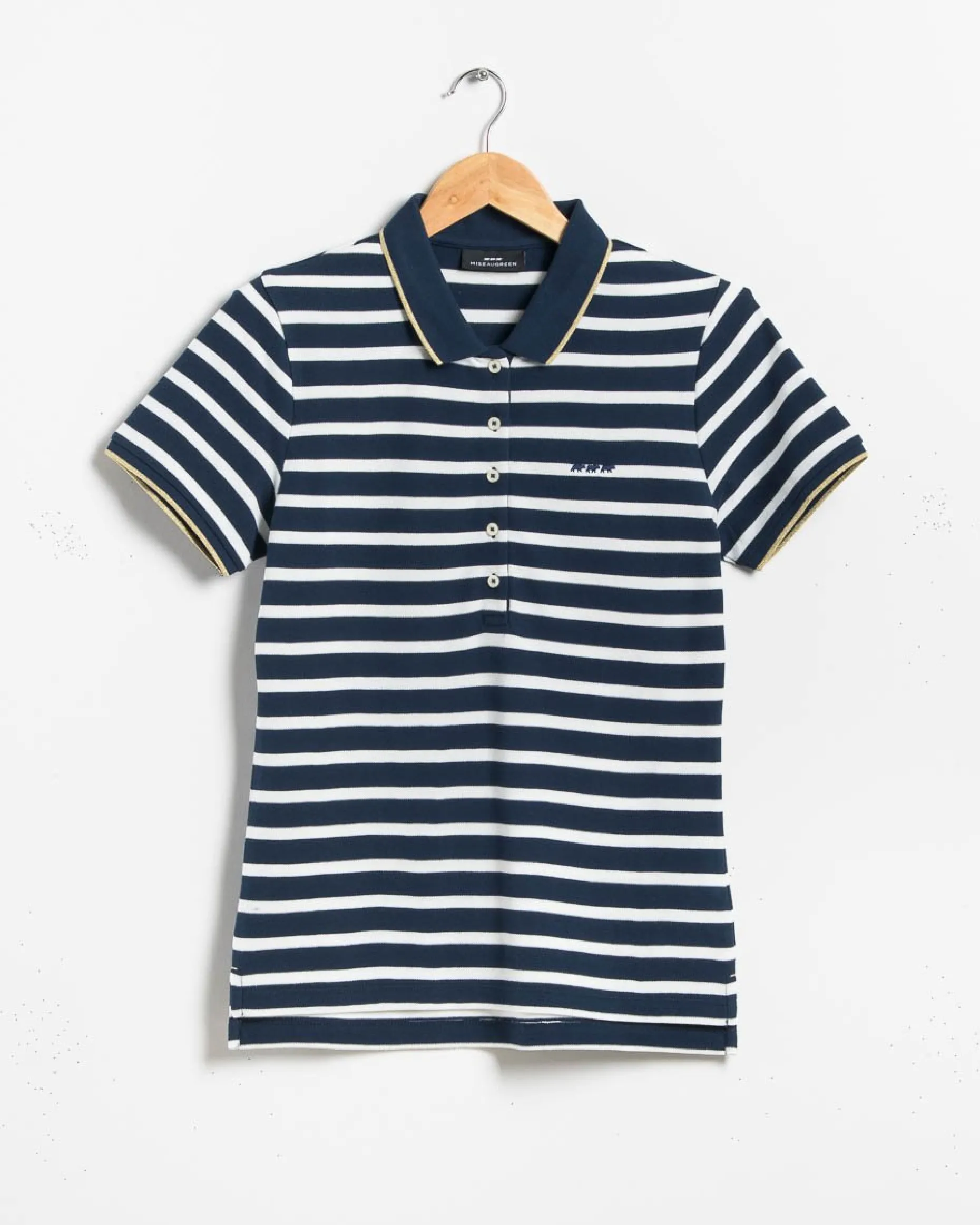 Pour faire sensation cette saison, ajoutez cet élégant polo rayé à votre garde-robe. D’un style sans faille, il est doté de finitions bord-côte et de détails brillants au niveau du col et des manches courtes. Ultra confortable grâce à son tissu en coton doux, il est l’exemple parfait du polo sporty chic et féminin. Le logo « 3 petites vaches » sur la poitrine signe cette pièce décontractée.