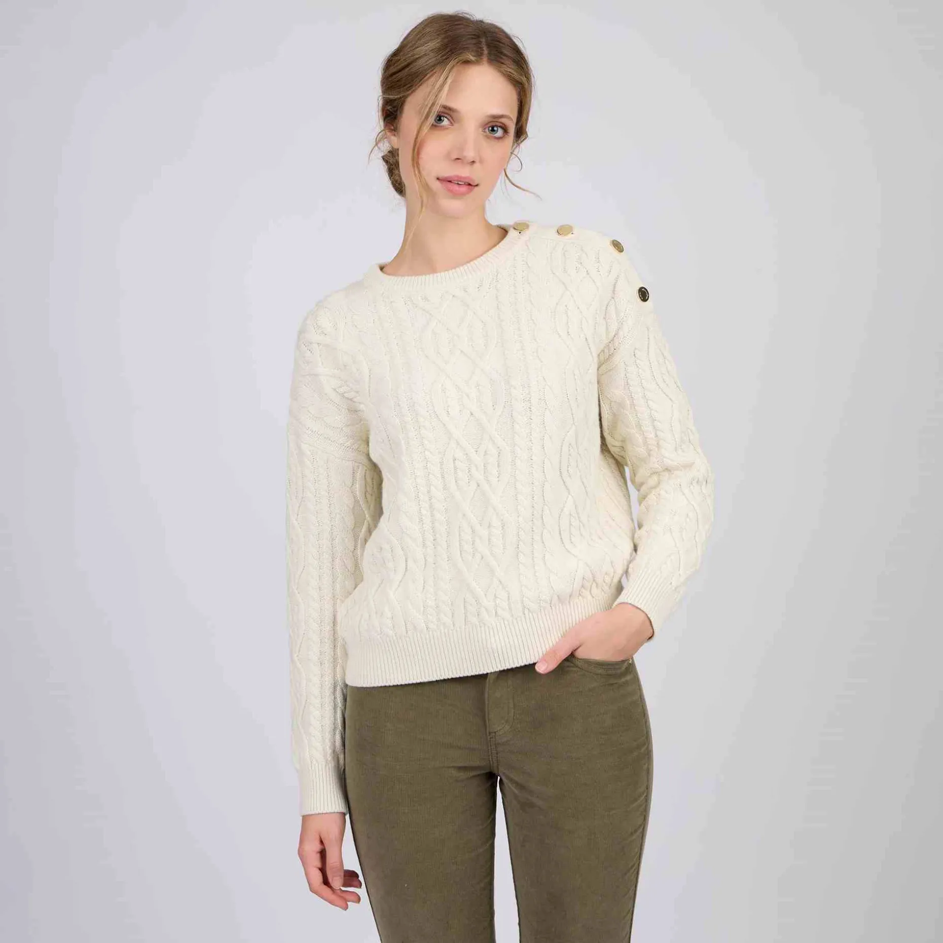Simple et chic à la fois : ce pull à manches longues multiplie les détails soignés ! Mélange de coton et de laine, il se démarque par sa maille chaude et respirante. Avec son col rond, ses finitions côtelées et son coloris blanc cassé, cette pièce séduit pour son caractère affirmé. La touche d’originalité ultime ? Ses boutons dorés sur l’épaule pour une silhouette encore plus élégante.
