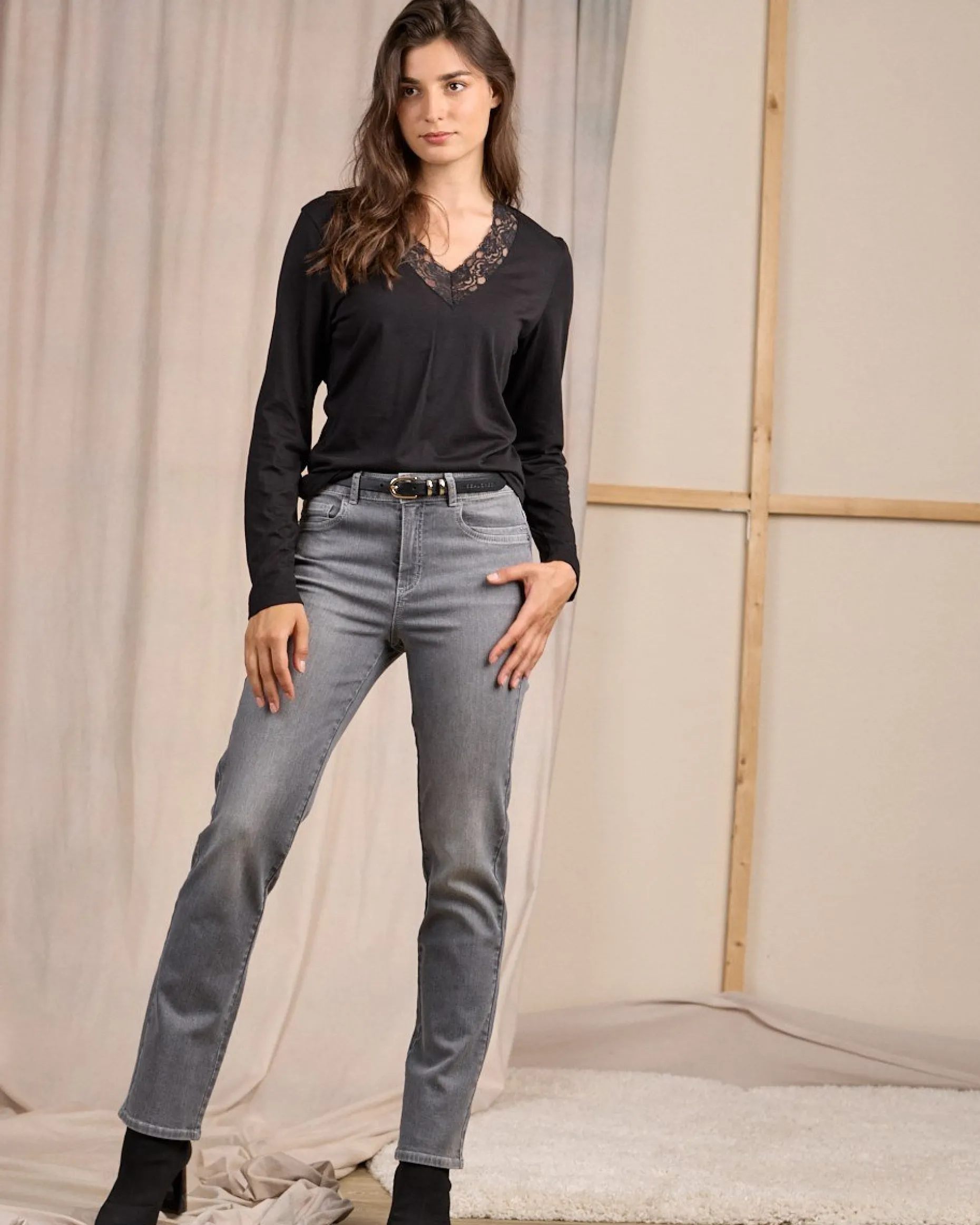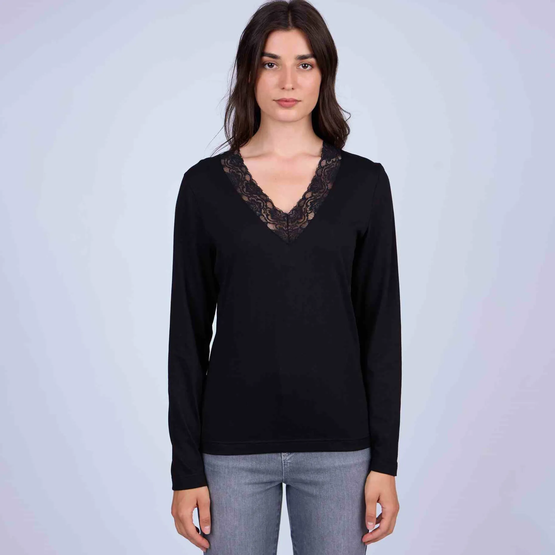 Arborez une silhouette glamour et faites votre petit effet avec ce tee-shirt à manches longues ! Faussement sage, ce modèle noir est sublimé par des bandes de dentelle ton sur ton au niveau de l’encolure en V. Associez-le avec une jupe ou un pantalon pour des tenues romantiques et faciles à porter !