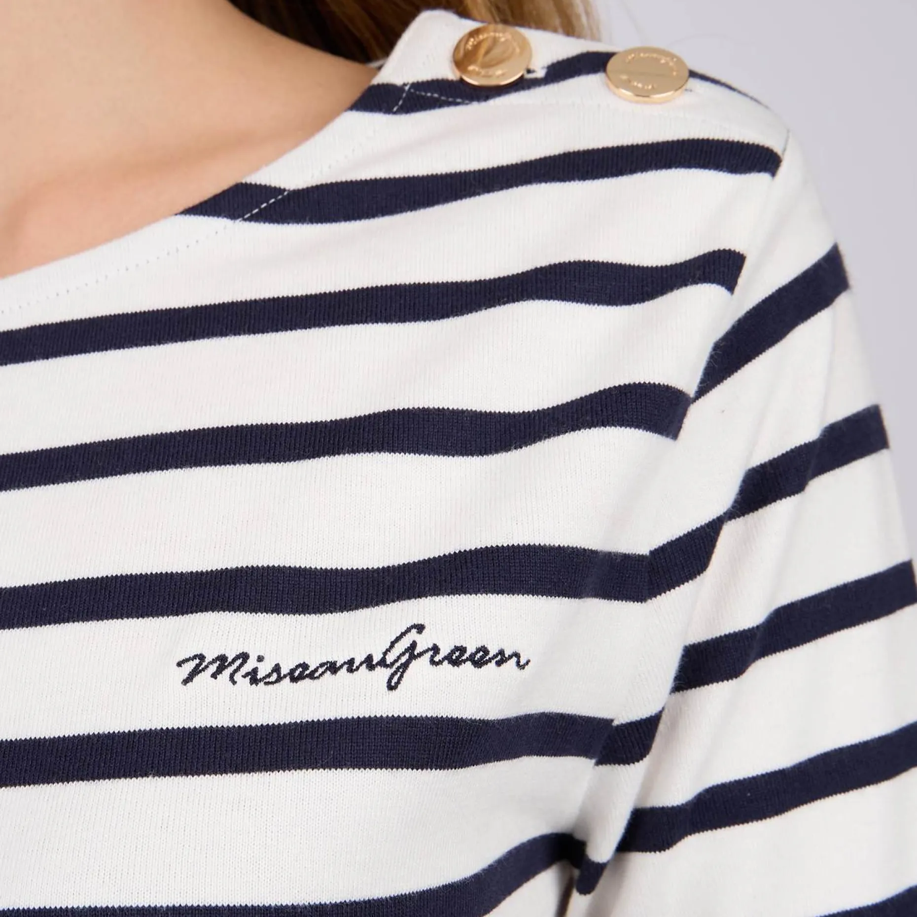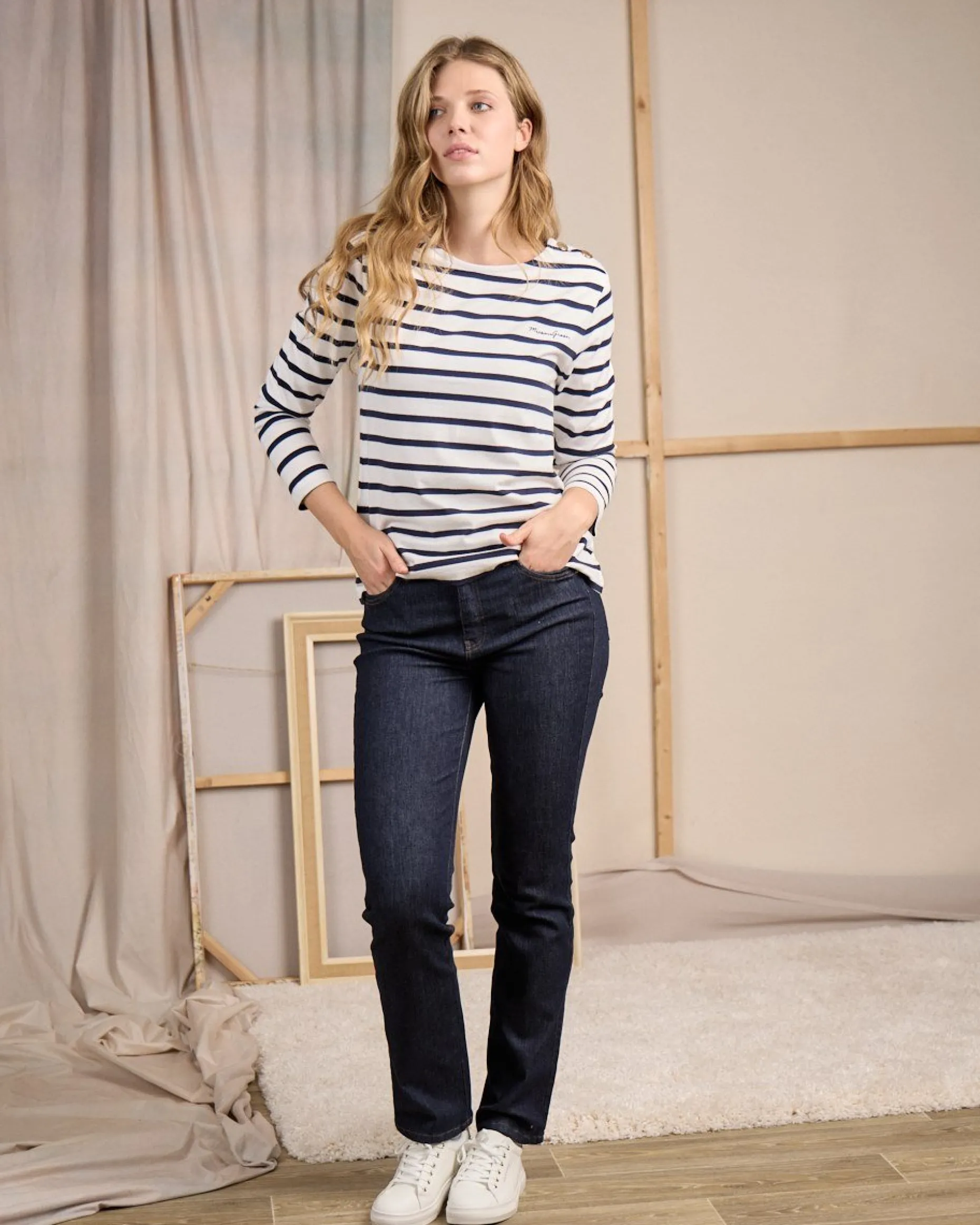 Inspiré du vestiaire marin, ce tee-shirt marinière à manches longues pour femme est déjà iconique ! Sa matière en coton issu de l’agriculture biologique le rend agréable à porter et respirant. Grâce à son imprimé à rayures et son coloris blanc, ce modèle mêle décontraction et élégance avec facilité ! Des détails raffinés comme sa patte de boutonnage à deux boutons dorés et son col rond complètent cet essentiel.