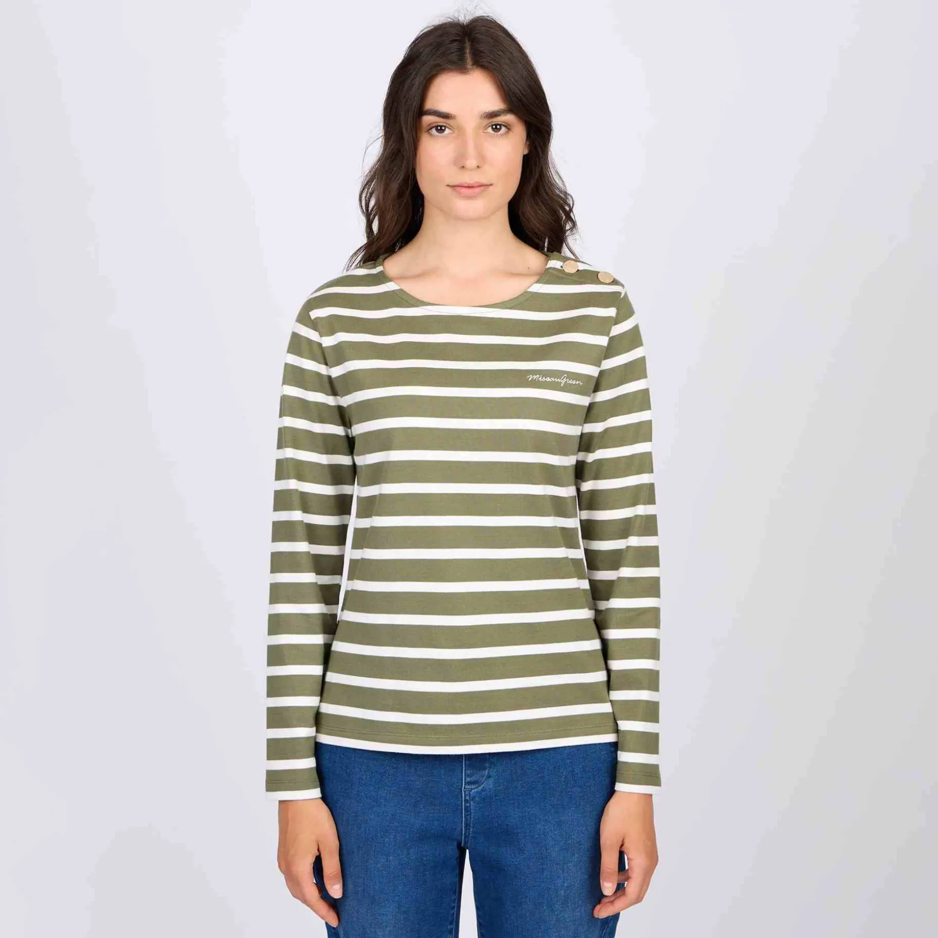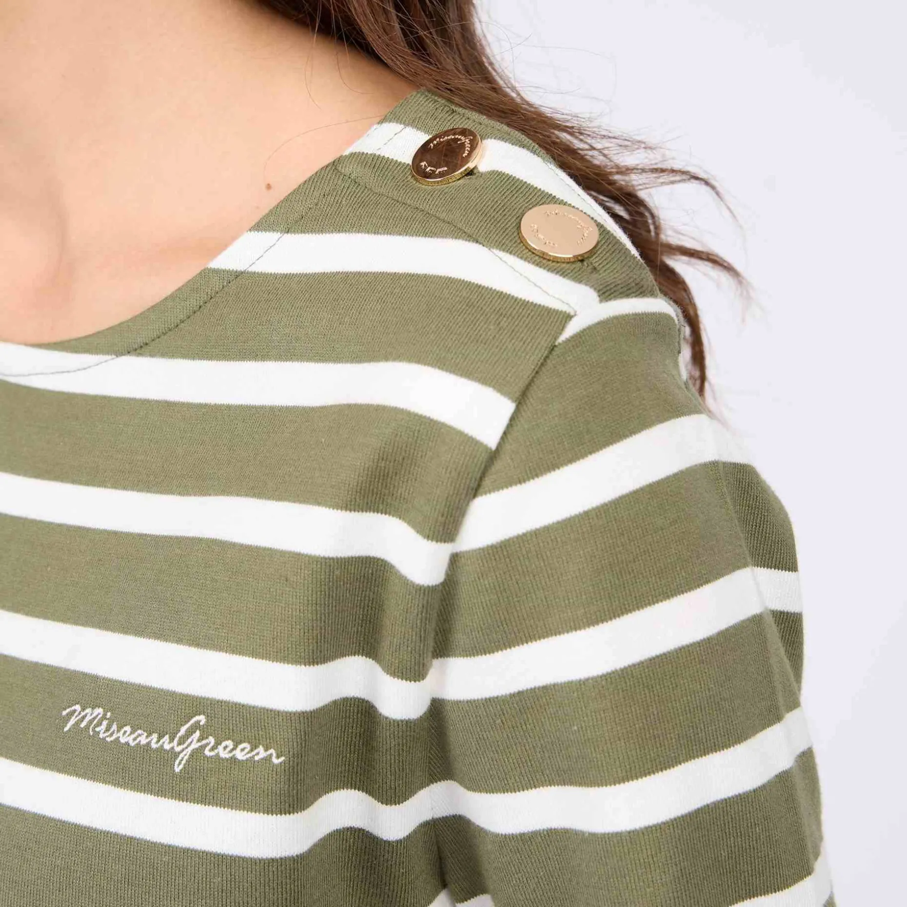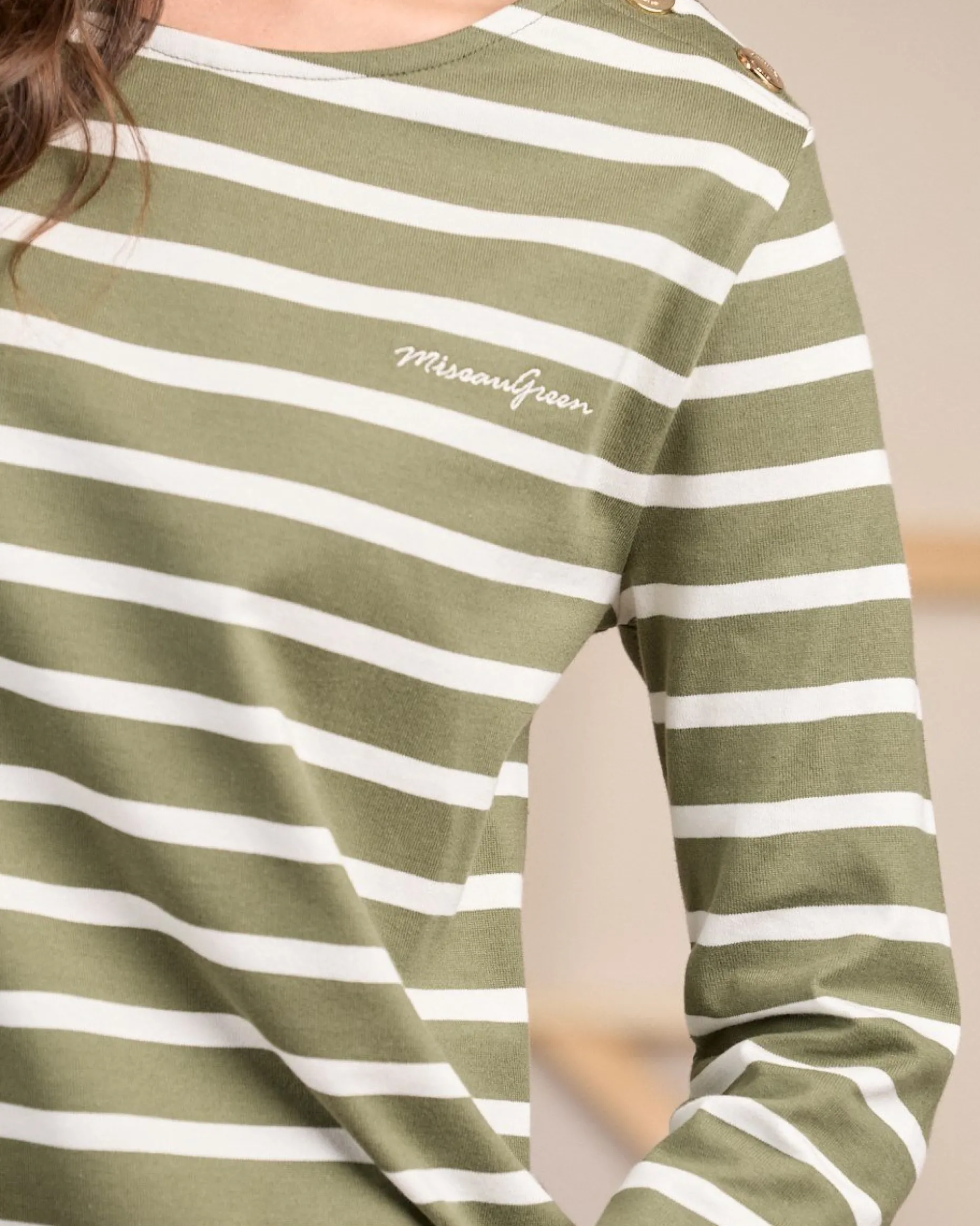 Inspiré du vestiaire marin, ce tee-shirt marinière à manches longues pour femme est déjà iconique ! Sa matière en coton issu de l’agriculture biologique le rend agréable à porter et respirant. Grâce à son imprimé à rayures et son coloris kaki, ce modèle mêle décontraction et élégance avec facilité ! Des détails raffinés comme sa patte de boutonnage à deux boutons dorés et son col rond complètent cet essentiel.