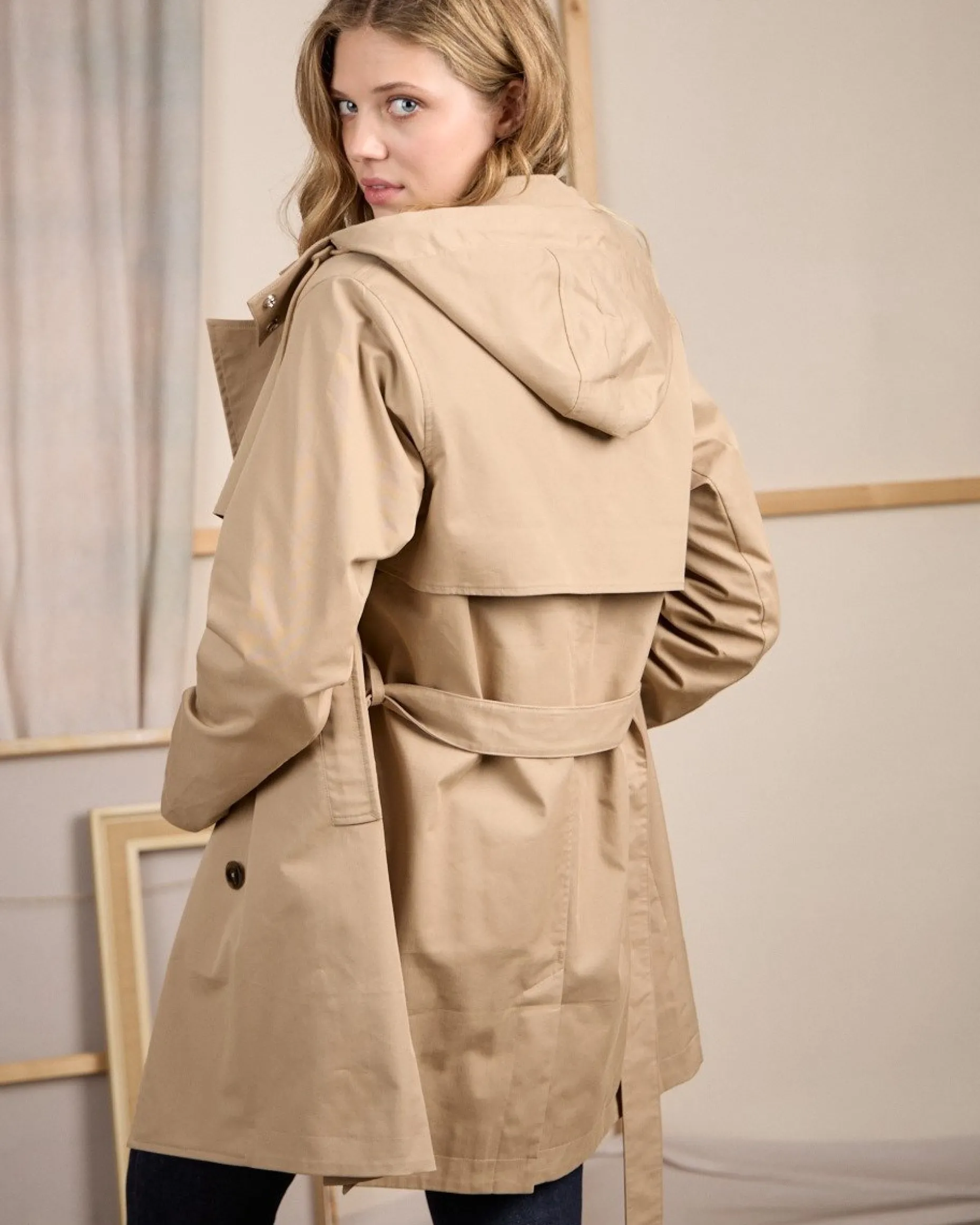 Cette parka féminine s’inspire de la coupe et des finitions iconiques de l’indémodable trench-coat en en proposant une réinterprétation moderne au style sport-chic. Cette parka beige à double boutonnage est dotée d’une ceinture amovible et de poches italiennes passepoilées avec soin pour plus de maintien. Au dos, cette parka façon trench comporte le bavolet typique d’une coupe trench-coat. Sa capuche est travaillée avec beaucoup d’attention, elle comporte le logo « 3 petites vaches » Mise au Green comme embossé ton sur ton ainsi que des cordons de serrage soignés. Le col de cette parka femme comporte deux boutons pression en métal argenté pour vous permettre de braver le vent et les éléments sans jamais perdre de votre élégance !