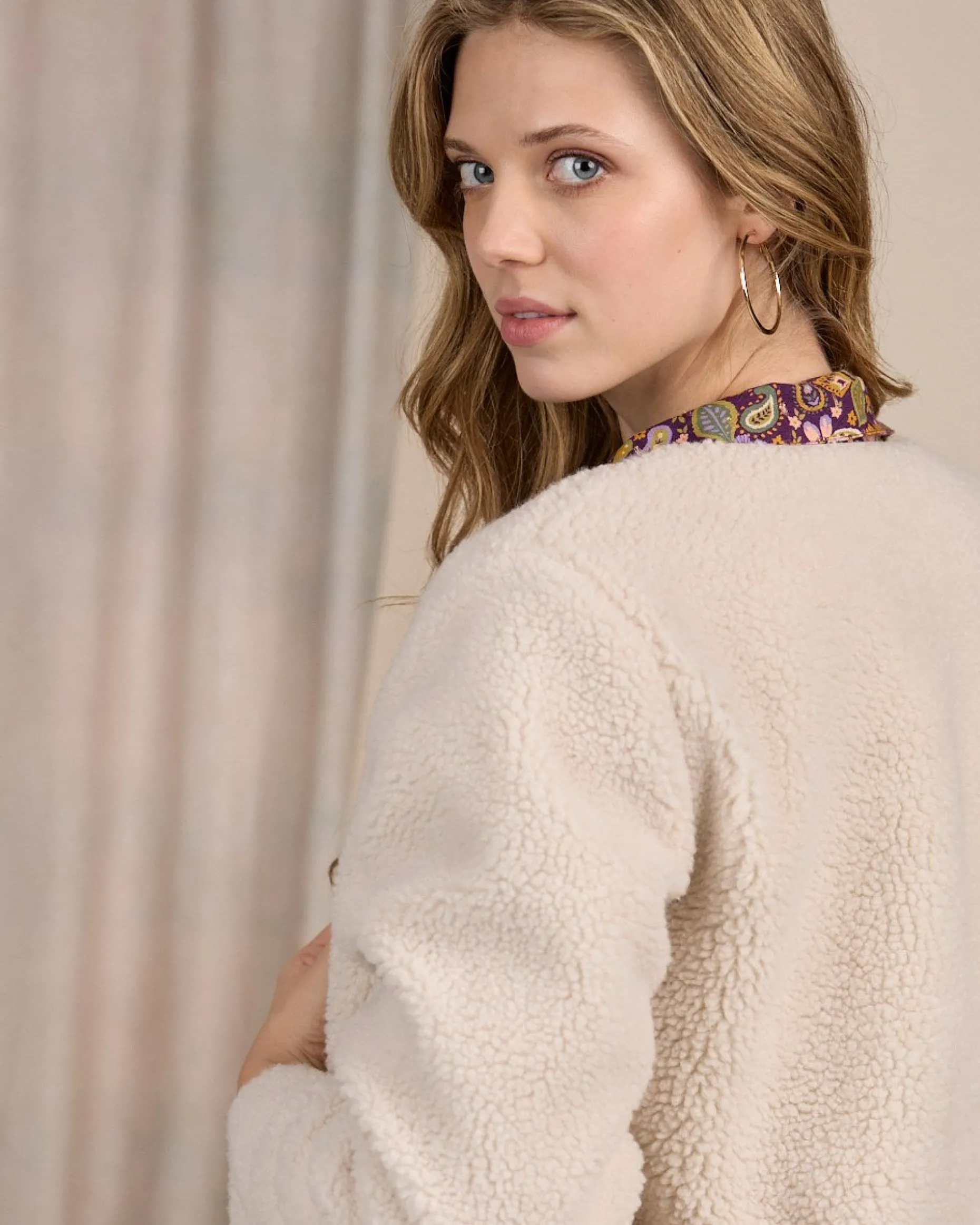Une veste polaire pour femme est indispensable pour vous protéger du froid ! Pour vous accompagner au quotidien, optez pour ce modèle chaud et confortable. Réalisée dans une matière imitation mouton au coloris écru, elle complète vos tenues avec élégance. Son design minimaliste et versatile est complété par une fermeture boutonnée et deux poches latérales. Pour être à l’aise chez vous ou pendant vos sorties, elle sera votre meilleure alliée !