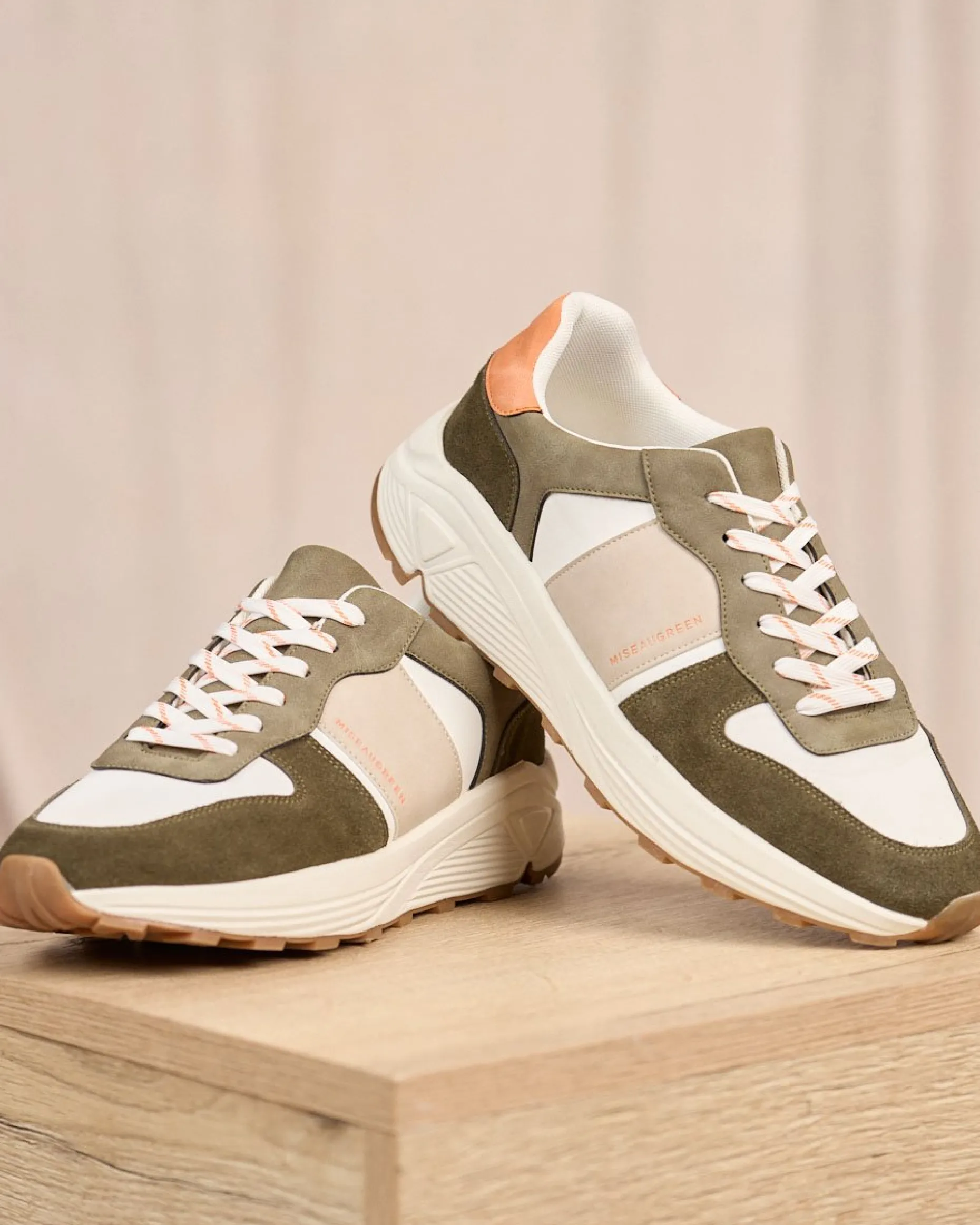 Pour des tenues stylées et confortables au quotidien, enfilez ces baskets basses ! Très polyvalentes, ces chaussures s’adaptent à tous les styles. Coup de cœur pour leur design décontracté et les empiècements kaki en suède. Elles arborent l’inscription « Mise au Green » sur le côté.