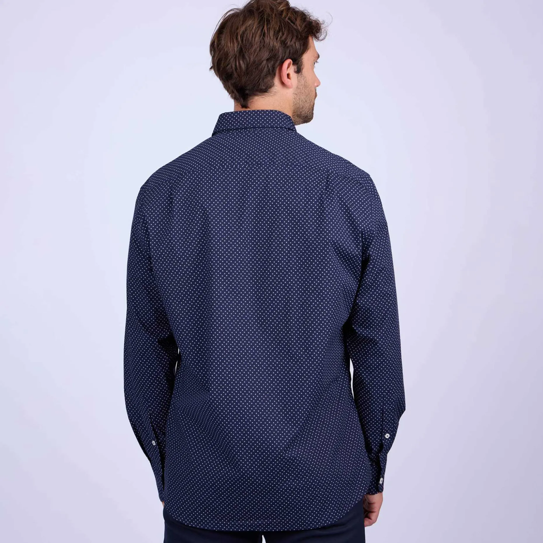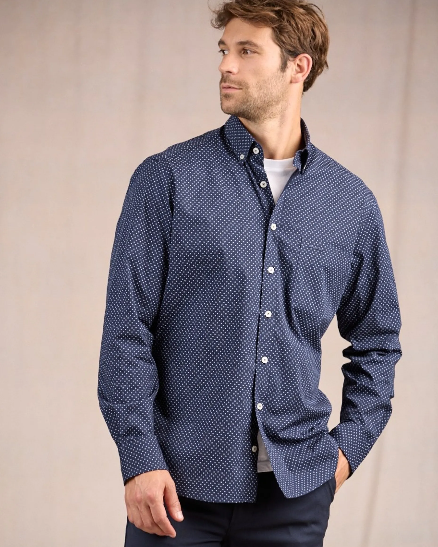 Associant un imprimé micro-motif avec un coloris bleu marine, cette chemise pour homme incarne l’essence même du raffinement. Réalisée en coton, elle a été pensée pour que vous soyez à l’aise tout au long de la journée. Elle présente un col boutonné, une poche poitrine et une broderie ton sur ton « 3 vaches ». Un modèle idéal pour se démarquer avec élégance !