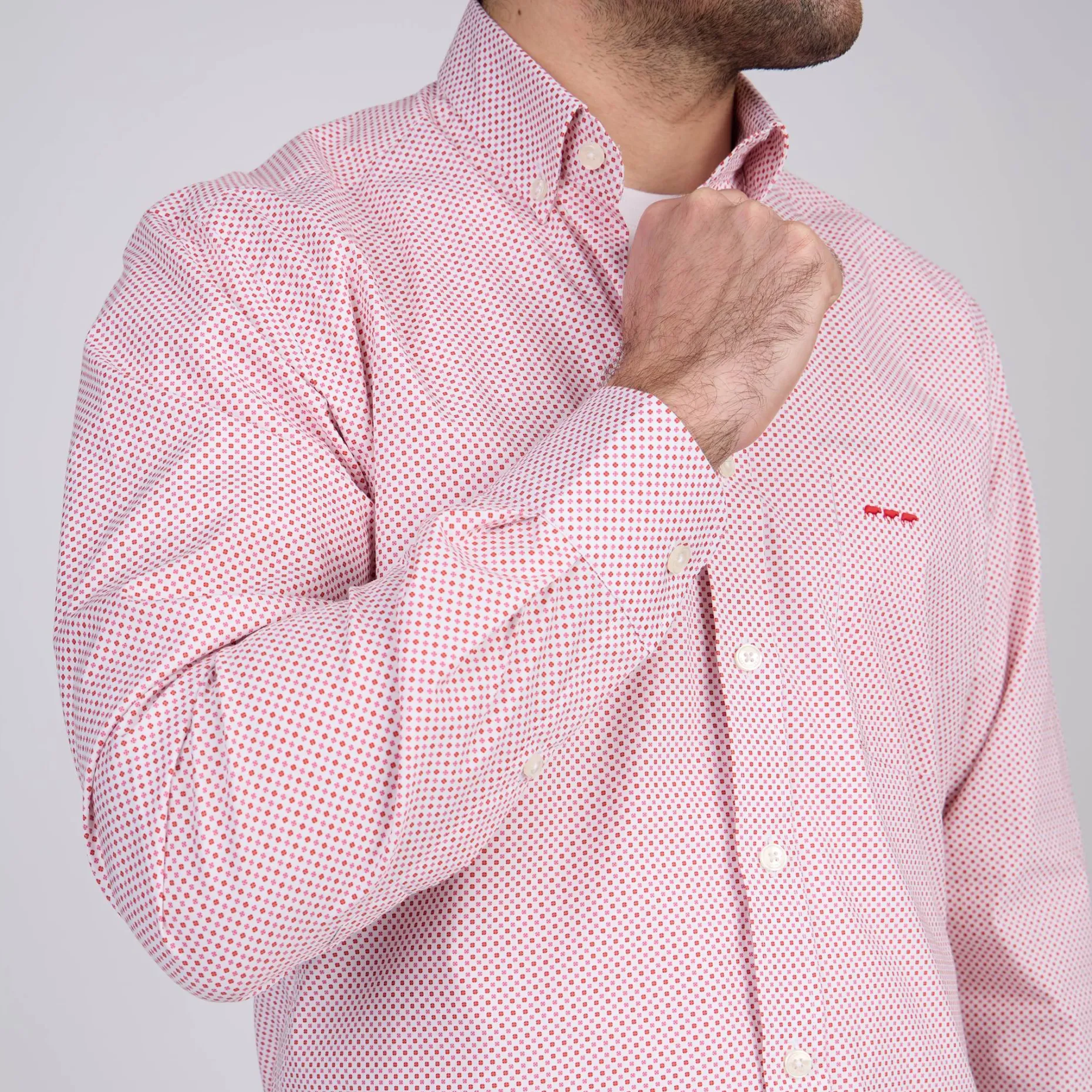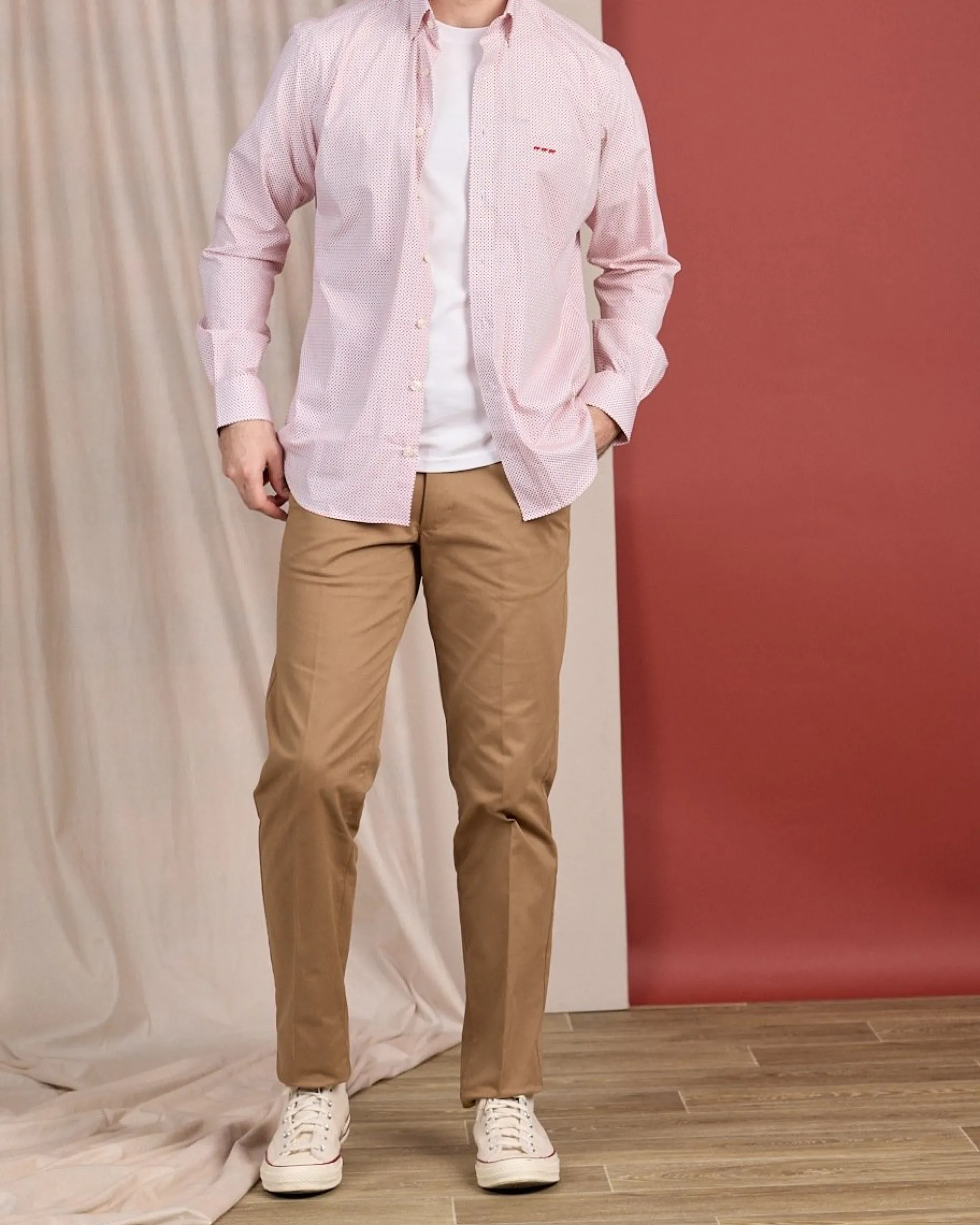 Pour une allure audacieuse, craquez pour cette chemise à manches longues ! Pensée pour votre confort, elle est conçue en coton avec une pointe d’élasthanne. Elle est dotée d’un imprimé à micro-motifs exclusif qui attire les regards ainsi que d’une poche plaquée sur la poitrine et d’un col à pointes boutonnées. Très facile à porter, ce nouvel essentiel s’associe aussi bien avec un chino qu’un jean. Le logo « 3 vaches » est brodé sur la poitrine.