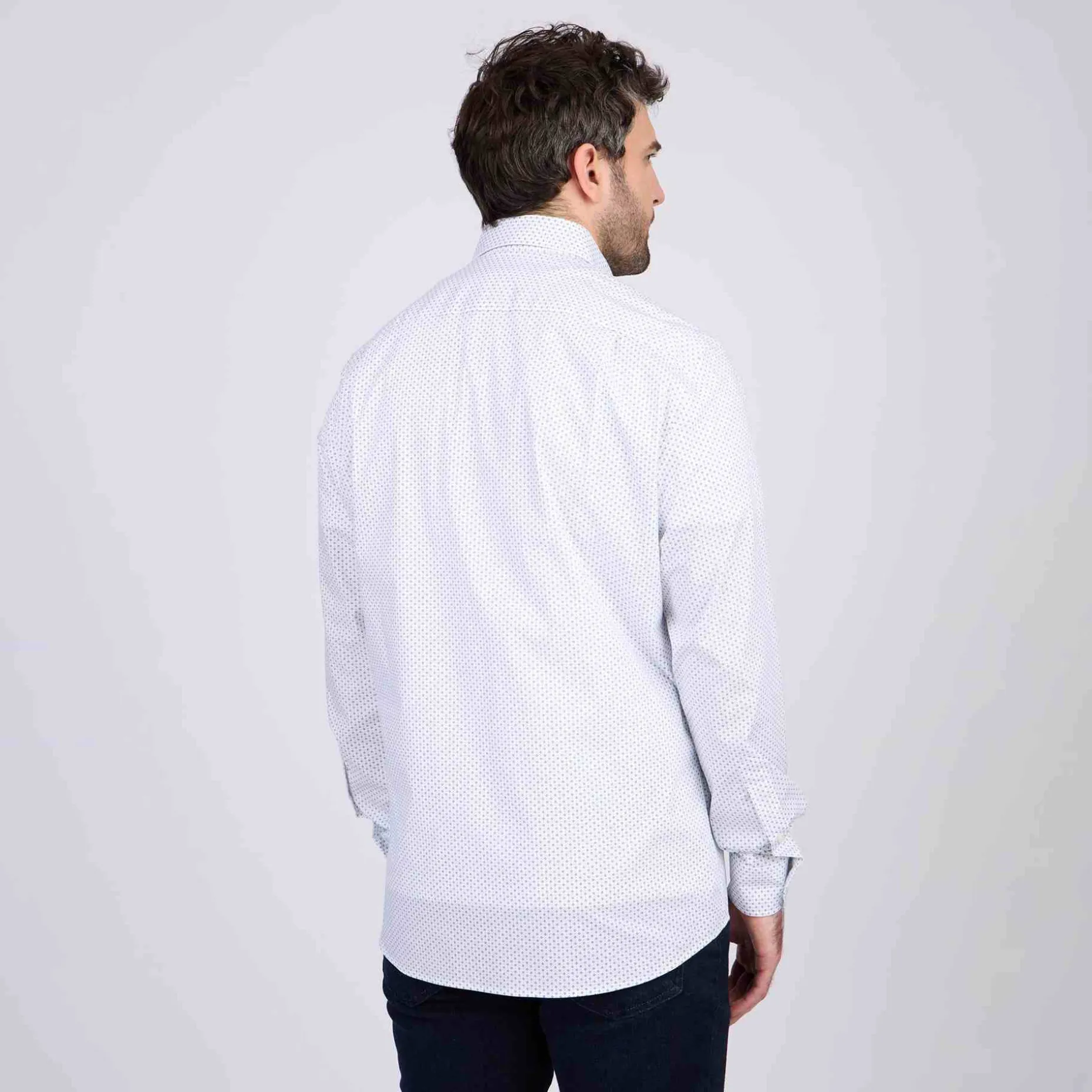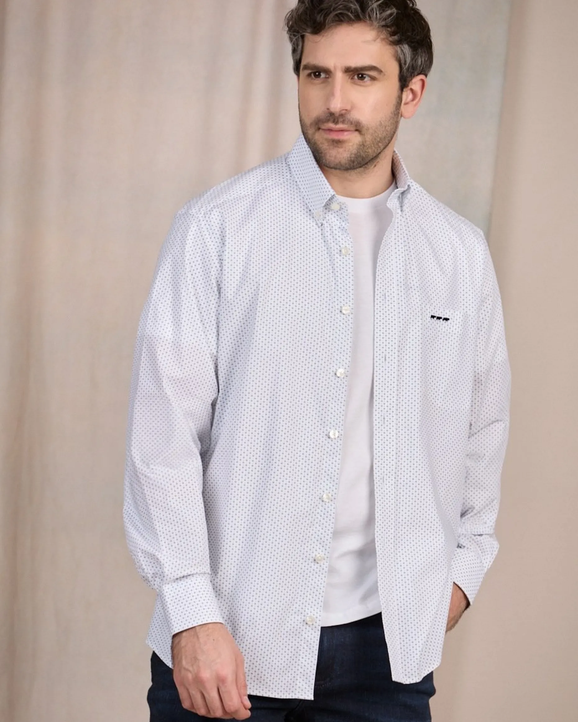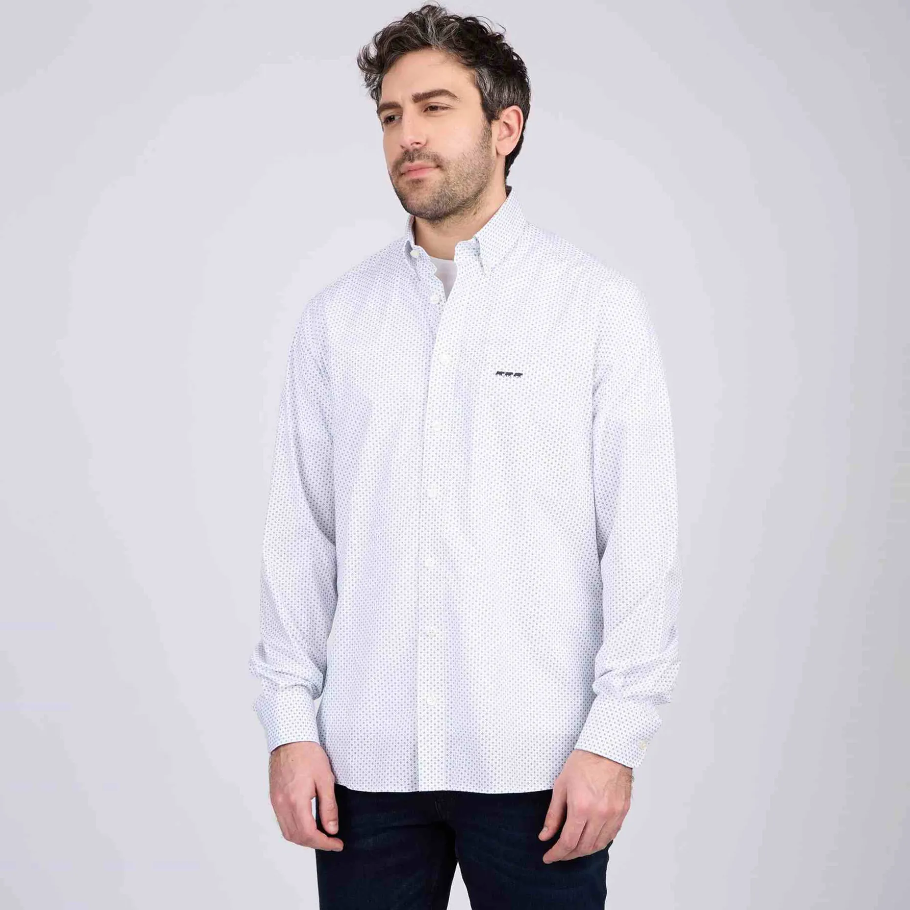 Envie de vous démarquer avec une tenue soignée ? Chic et agréable à porter, cette chemise à manches longues est confectionnée en coton avec de l’élasthanne. Polyvalente, elle convient aussi bien à des occasions formelles que décontractées grâce à son coloris blanc et ses micro-motifs raffinés. Ce modèle affiche un col à pointes boutonnées ainsi qu’une broderie « 3 vaches » sur la poitrine.