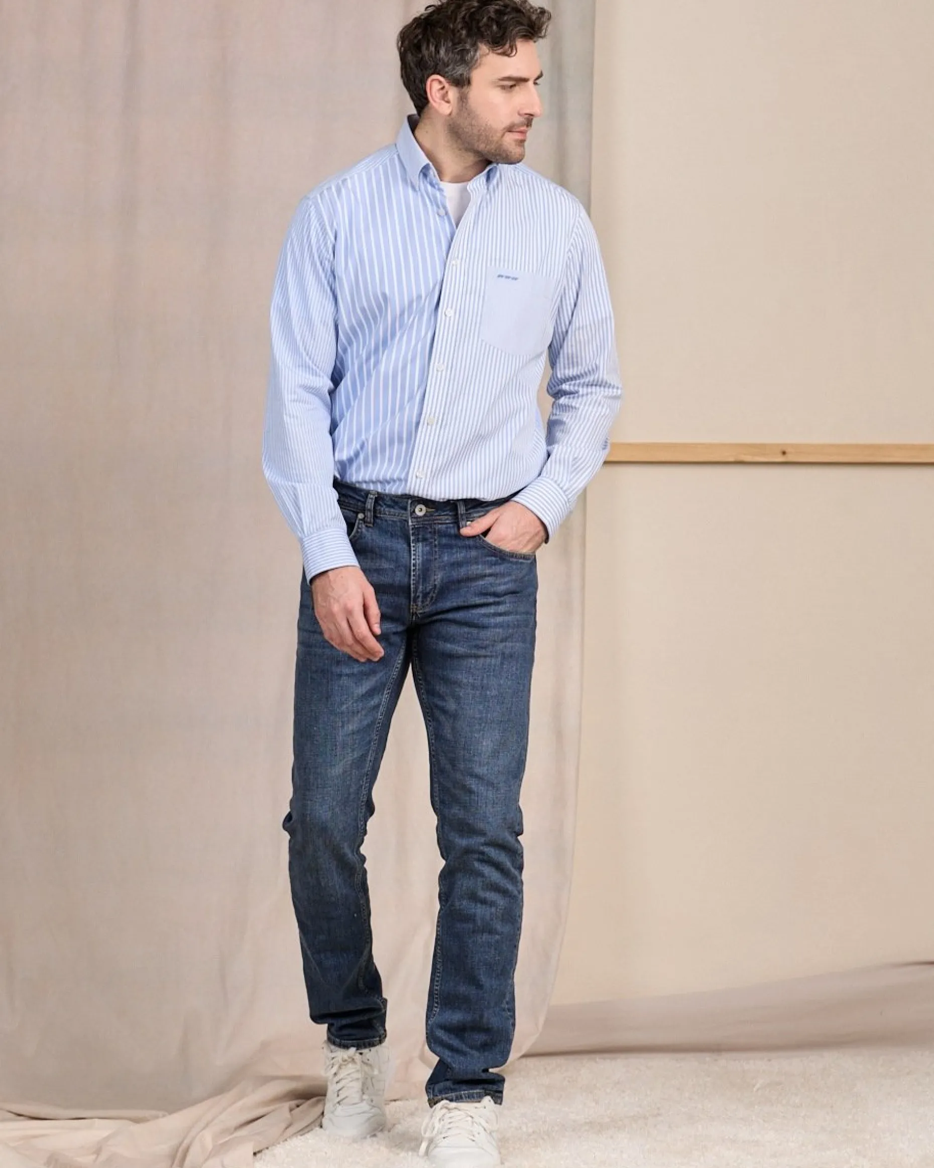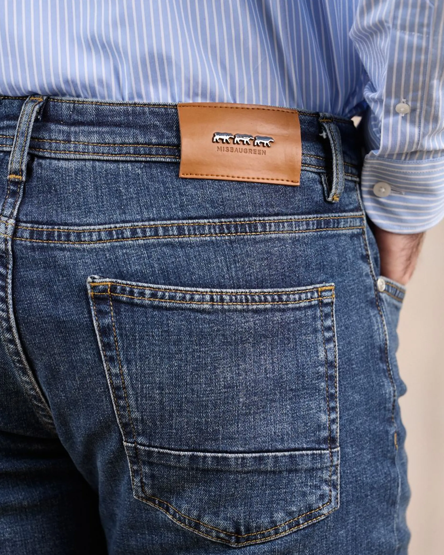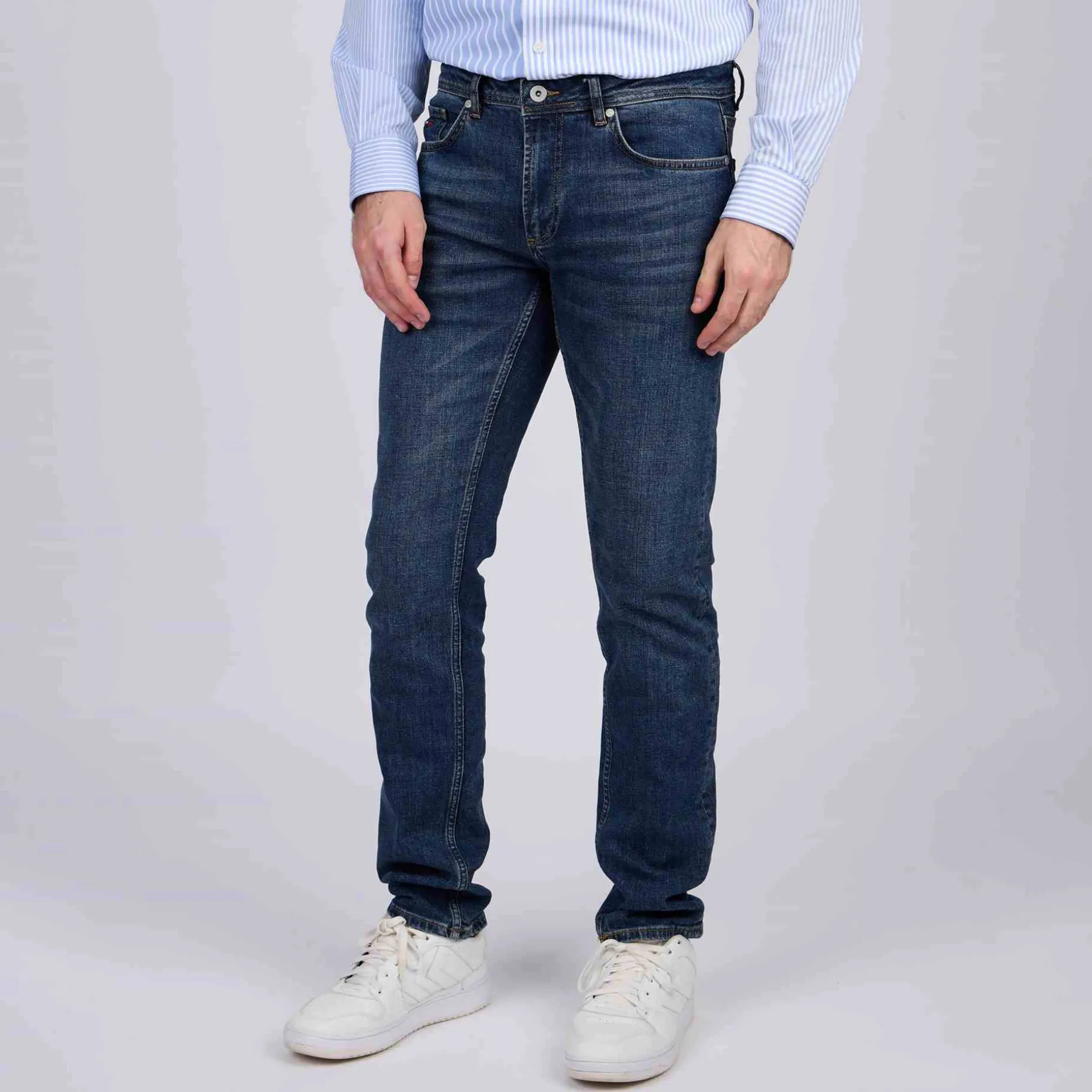 Au quotidien, ce jean bleu médium sera votre meilleur allié ! Son design résolument moderne est sublimé par un léger délavage, cinq poches et une coupe ajustée qui flatte la silhouette en toute simplicité. Pour plus de souplesse et de confort, il est confectionné dans un mélange de coton et élasthanne. Un logo brodé 3 vaches au niveau des poches ainsi qu’un jacron Mise au Green signent cette pièce intemporelle. Associez-la avec n’importe quel haut de votre vestiaire pour une allure dans l’air du temps.