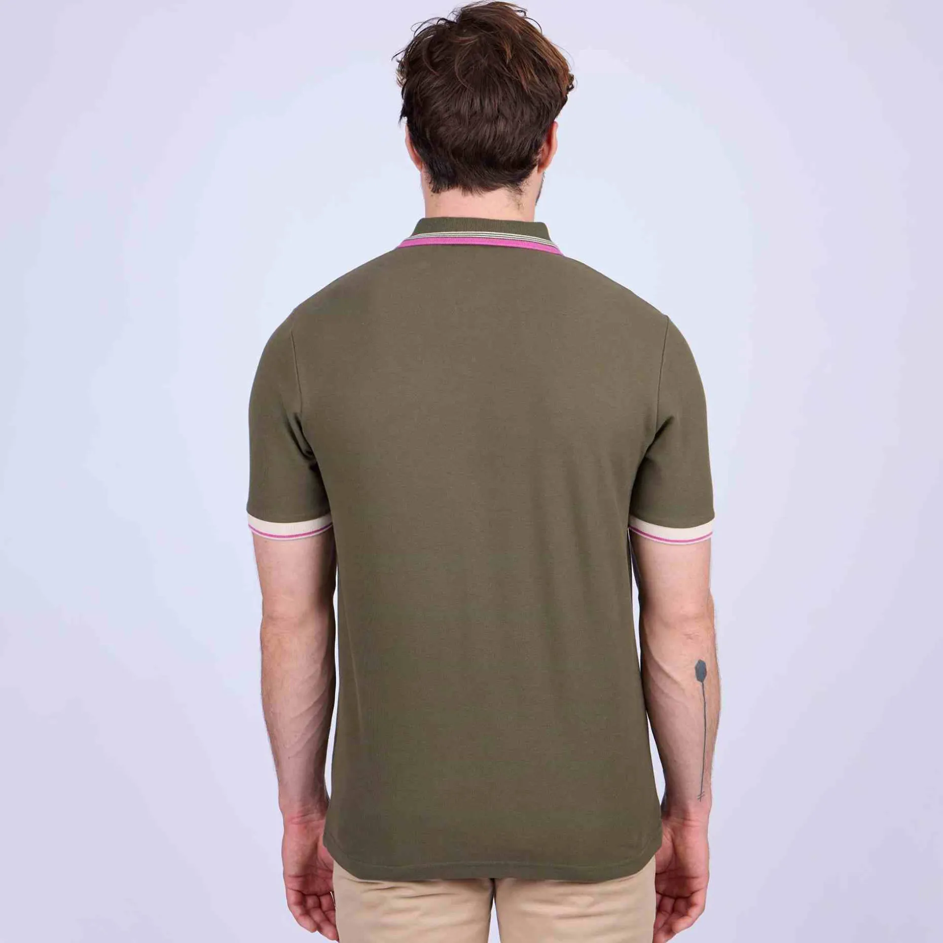 Ce polo à manches courtes est parfait pour être à l’aise toute la journée. Réalisé en coton, il procure un confort optimal et vous suit partout. Optez pour son coloris kaki qui ajoute du dynamisme à votre allure et met en valeur votre silhouette. Naturellement élégant, ce modèle comporte des détails rayés contrastés, un col en bord côtelé et une broderie « 3 vaches » sur la poitrine. Associez-le avec un chino ou un jean pour un look simple et efficace !