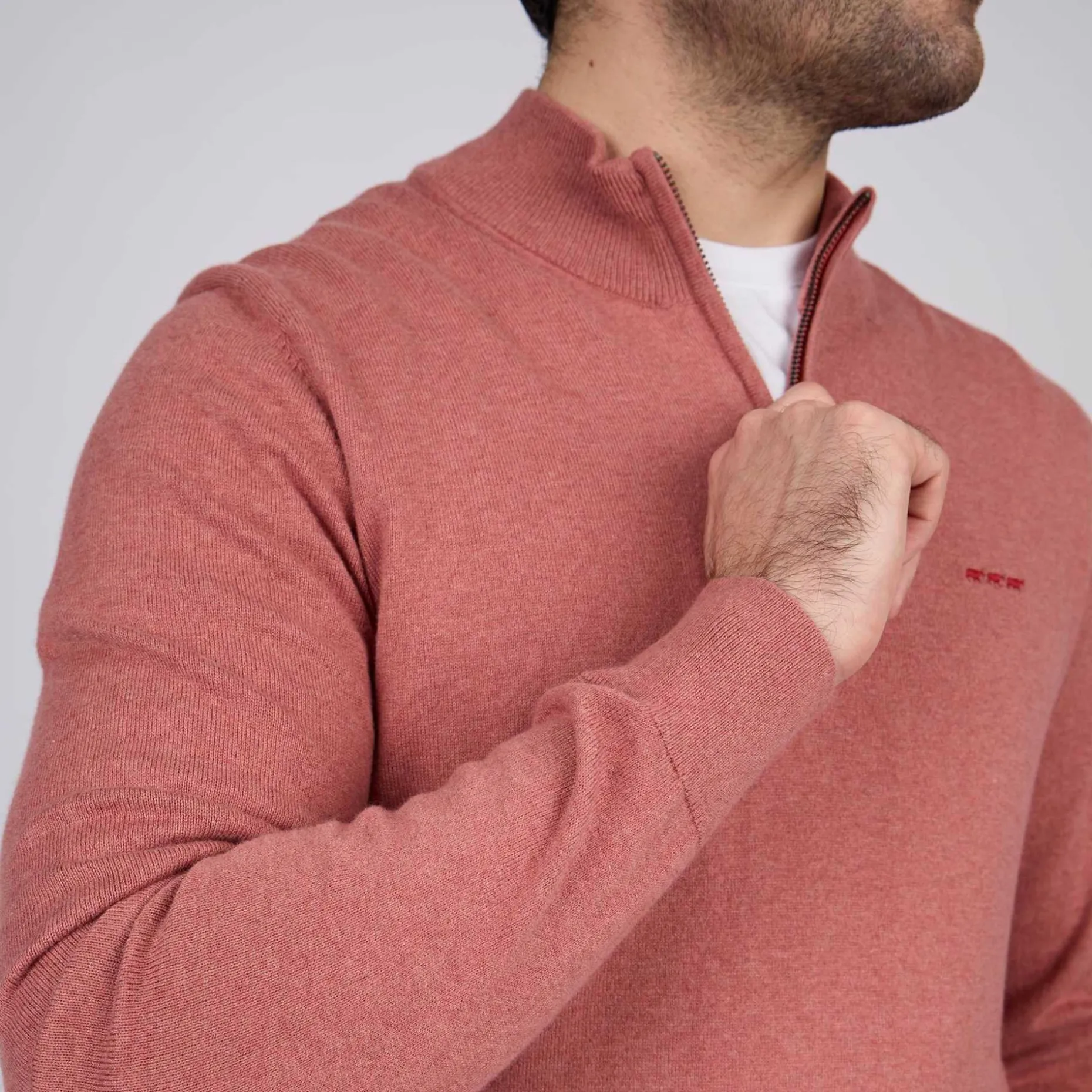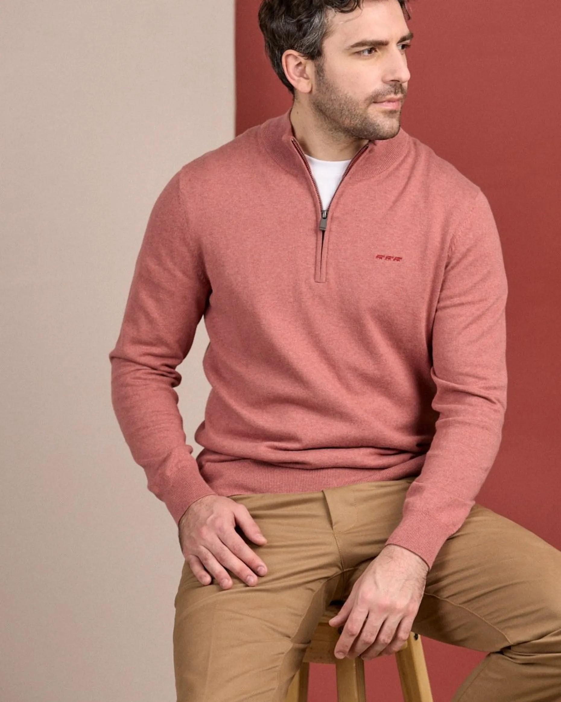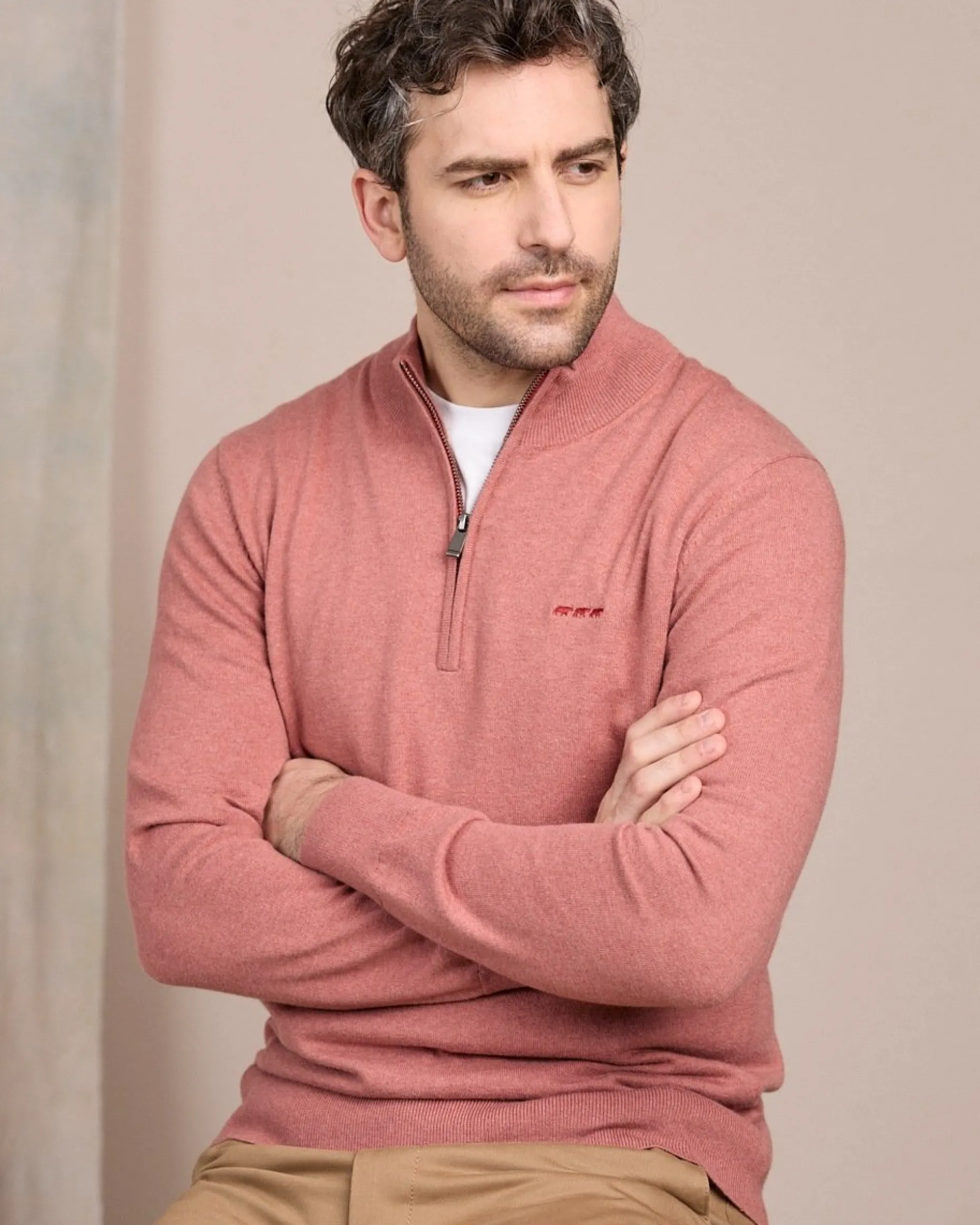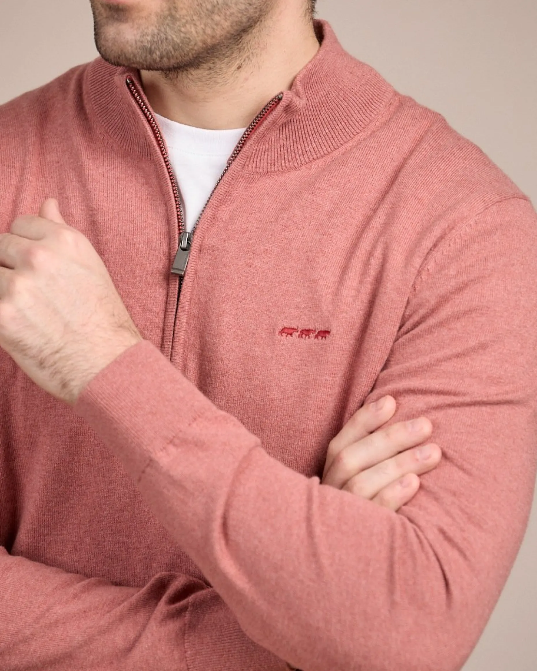 À la fois chic et sobre, ce pull à manches longues est un indémodable ! Décliné dans un coloris bois de rose, ce modèle tendance se porte aussi bien avec un jean qu’un pantalon chino. Il possède une coupe droite et un col avec fermeture éclair pour des tenues confortables, mais toujours soignées. Confectionné en coton avec une pointe de cachemire, il offre une sensation de confort agréable sur la peau. Des finitions en bord-côtes et un logo 3 vaches brodé sur la poitrine apportent la touche finale.